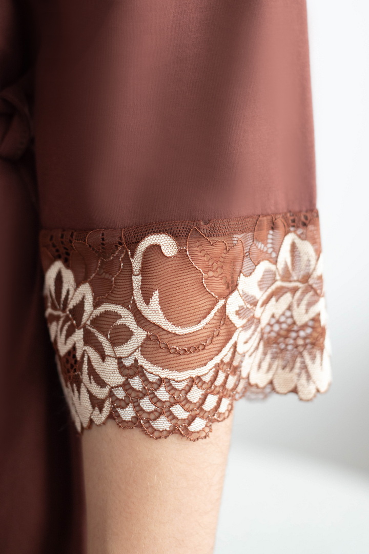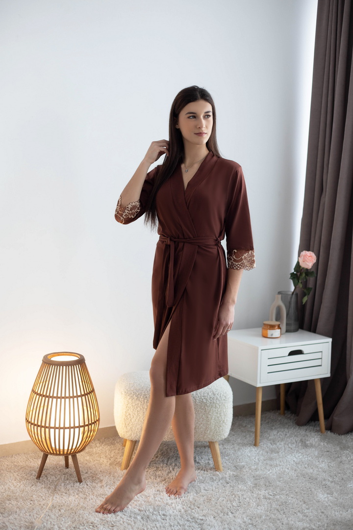 Жіночий пеньюар створений для моментів, коли хочеться виглядати бездоганно навіть вдома. Легкий, м’який і неймовірно комфортний, він красиво лягає по фігурі, підкреслюючи жіночність. Завдяки стрейч-куліру пеньє, тканина ніжно обіймає тіло, даруючи відчуття затишку з першого дотику. Ефектний крій додає образу витонченості та дозволяє легко регулювати посадку. Пояс на талії формує гарний силует і підкреслює лінії фігури. А розкішні мереживні манжети на рукавах створюють той самий “вау-ефект”, який перетворює звичайний домашній одяг на стильний елемент жіночого гардеробу. Цей пеньюар ідеально підійде як для щоденного комфорту, так і для особливих вечорів — коли хочеться бути ніжною, впевненою та неймовірно красивою.