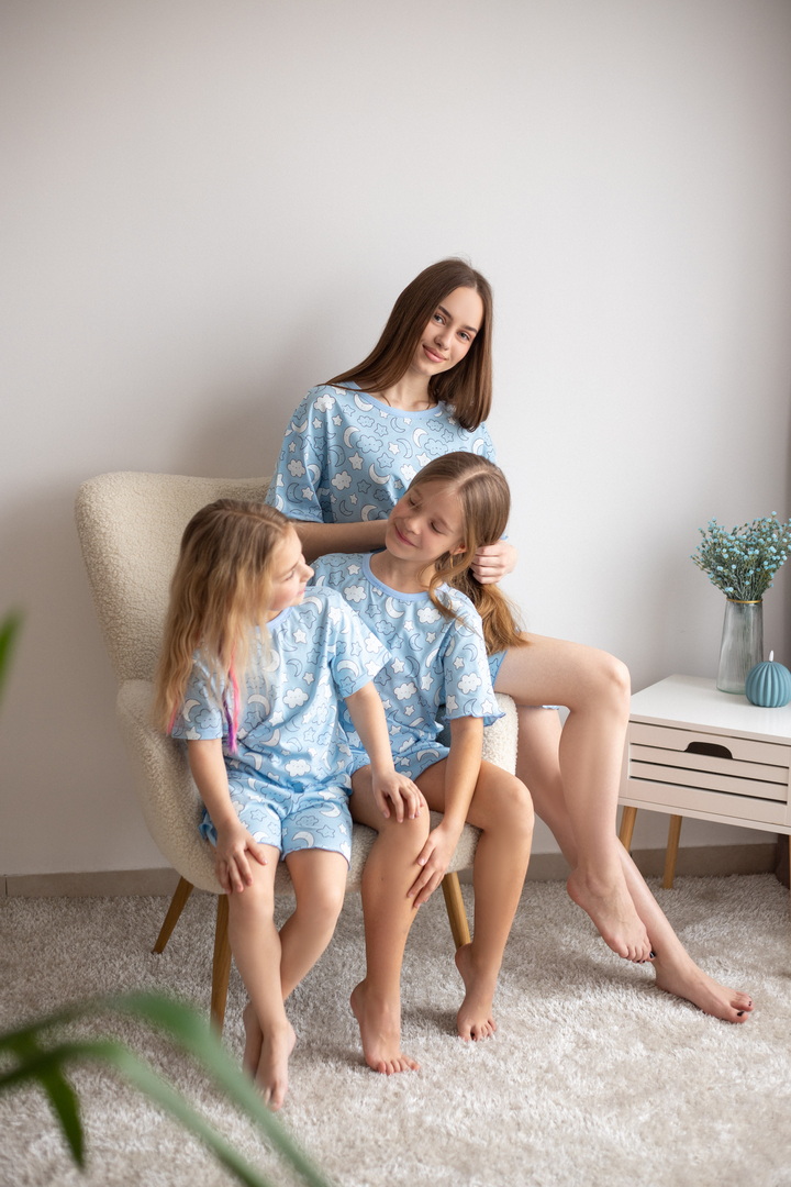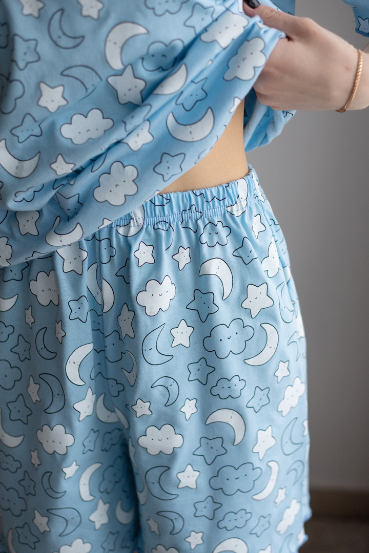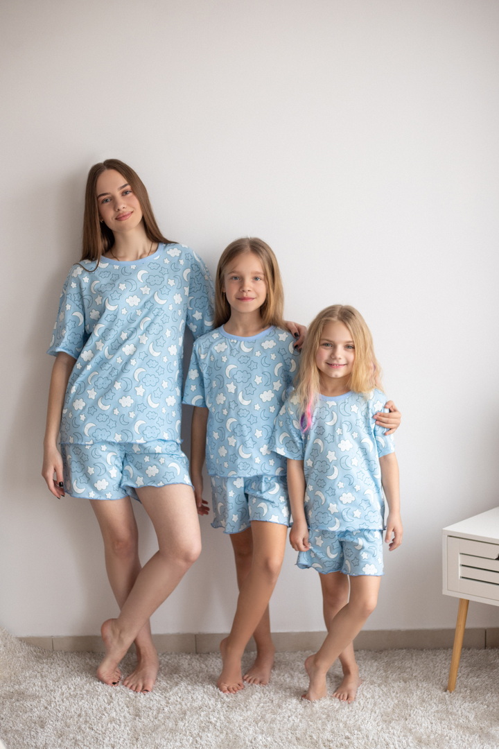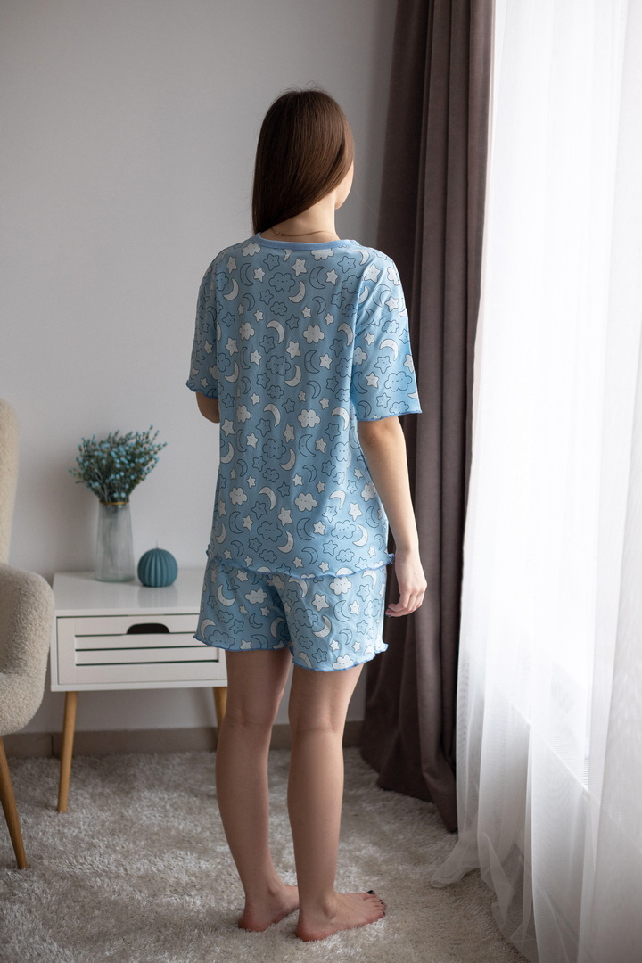 Легка зручна піжама для жінок із принтованого куліра. Модель вільного крою складається з футболки з короткими рукавами, зі спущеною лінією плеча, округлою горловиною, а також шорт на гумці. Завдяки натуральному складу полотна (100% бавовна) ця піжама стане улюбленою річчю в домашньому гардеробі жінок.
