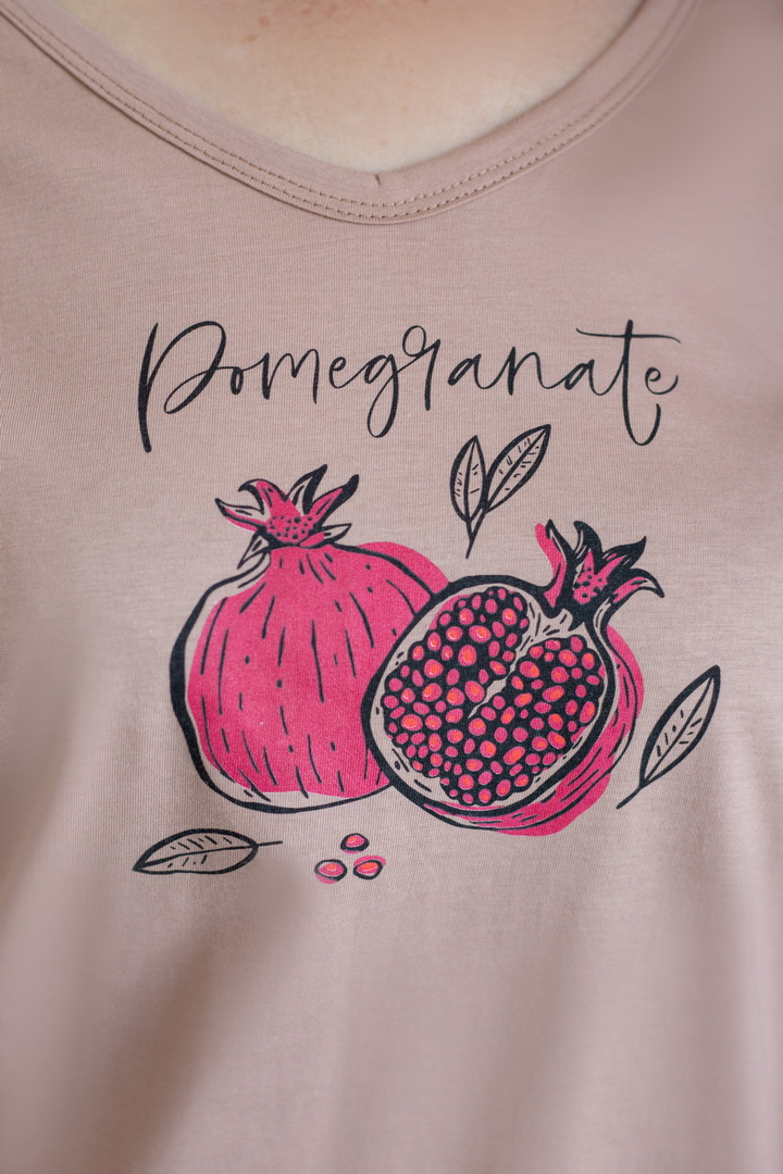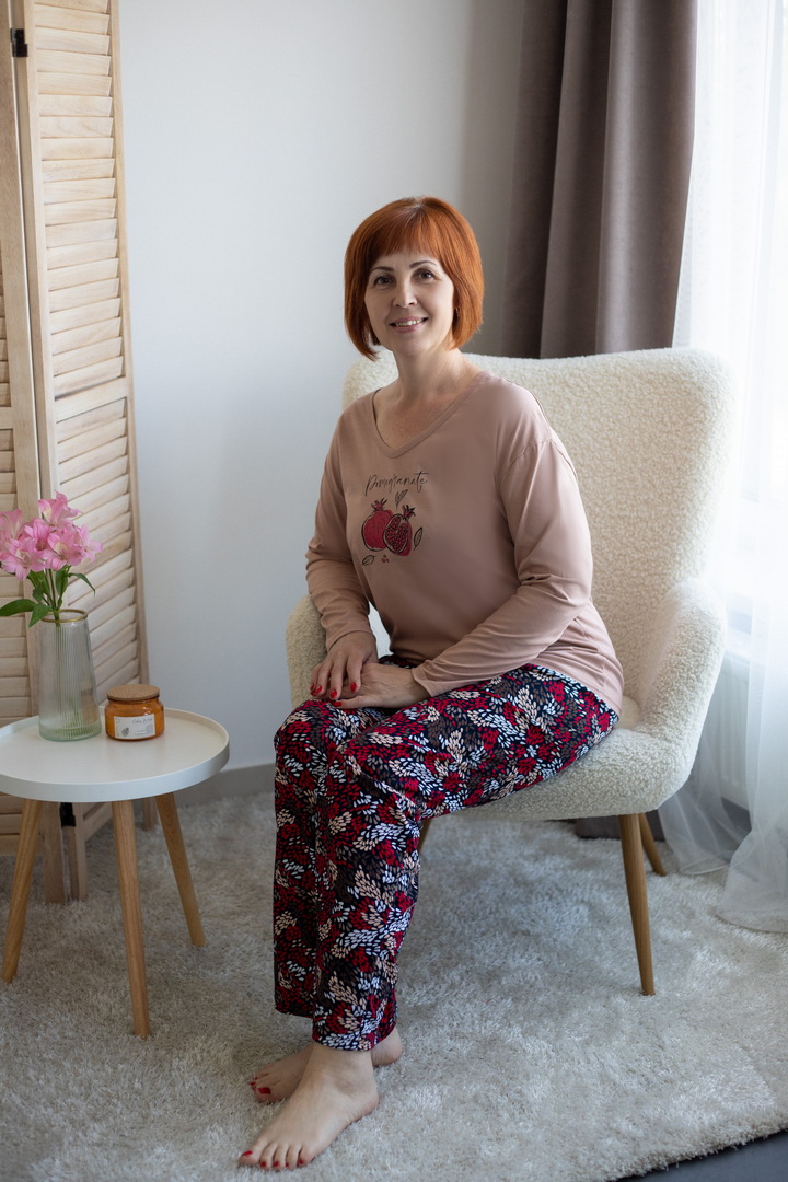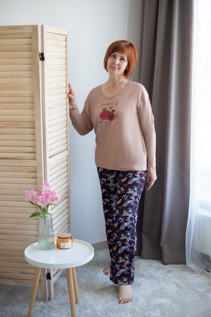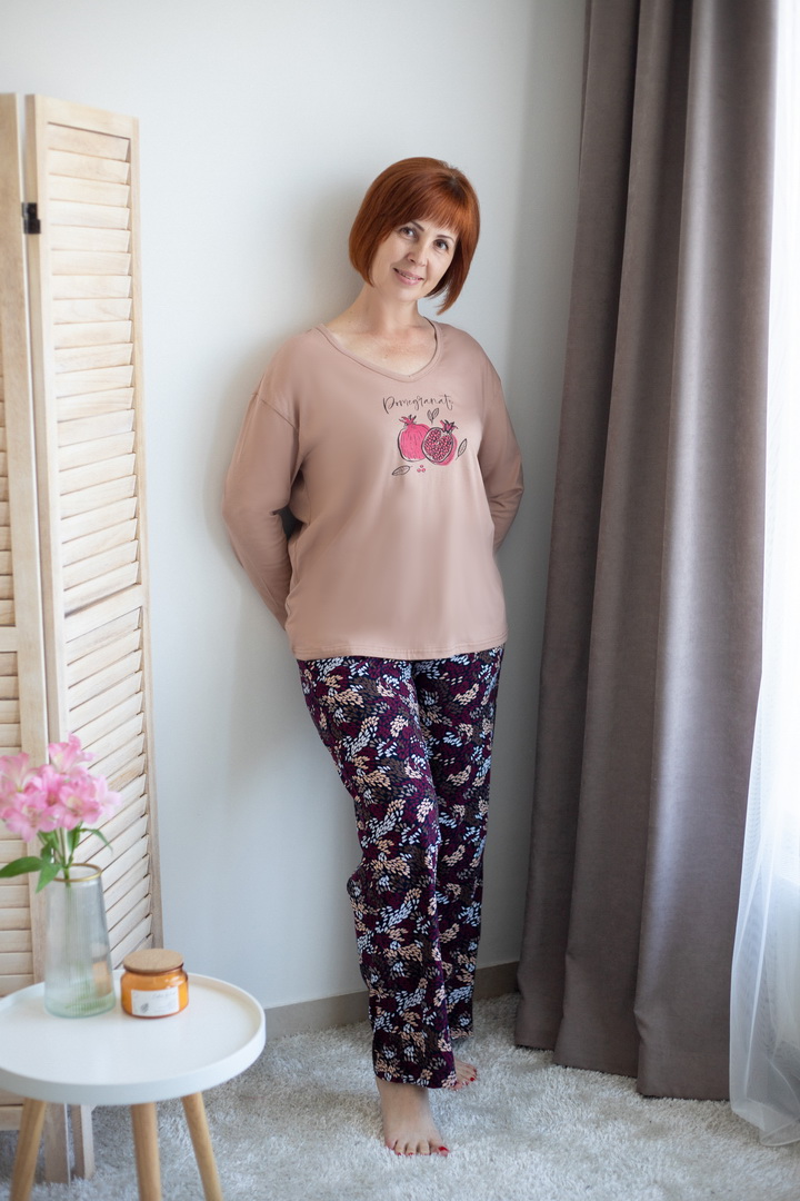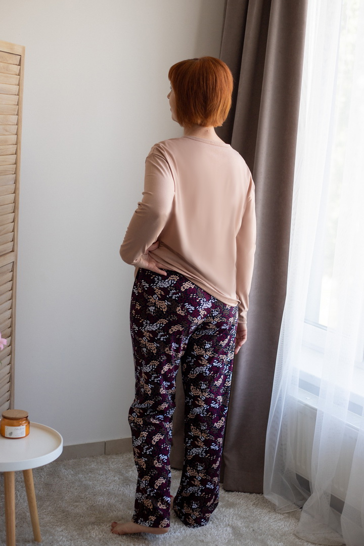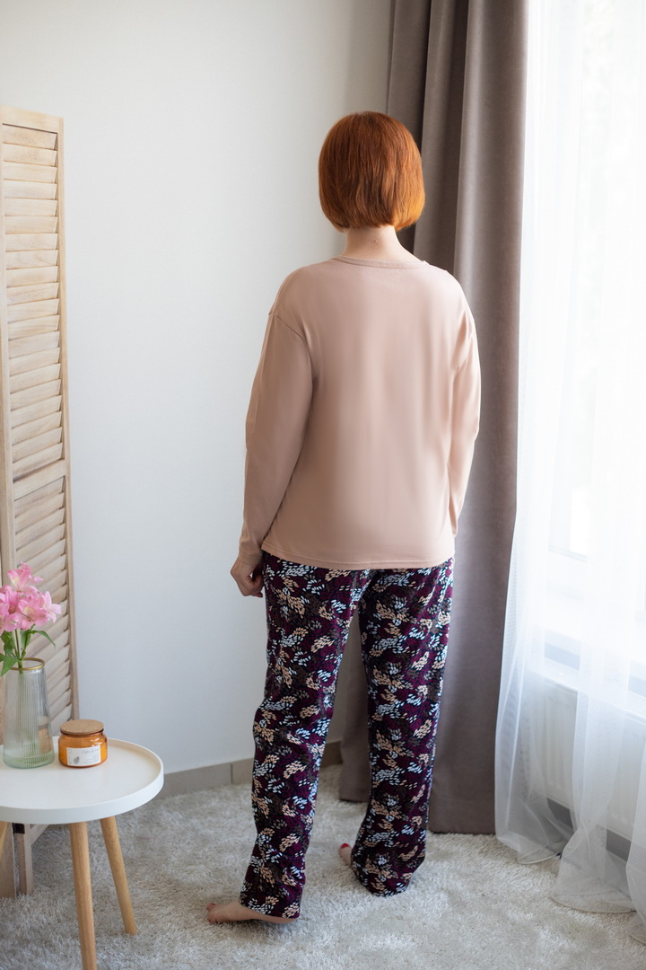 Піжама виконана з полотна "Кулір-реактив". Полотно високої якості, м'яке, приємне до тіла, натуральне. Комплект складається з джемпера та штанів. Джемпер з однотонного полотна, з V-подібною горловиною, спереду нанесений накат, виконаний методом шовкотрафаретного друку. Штани з принтованого полотна, прямого крою.