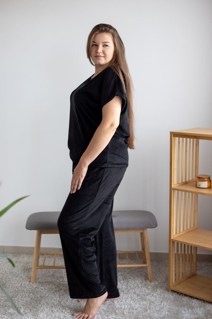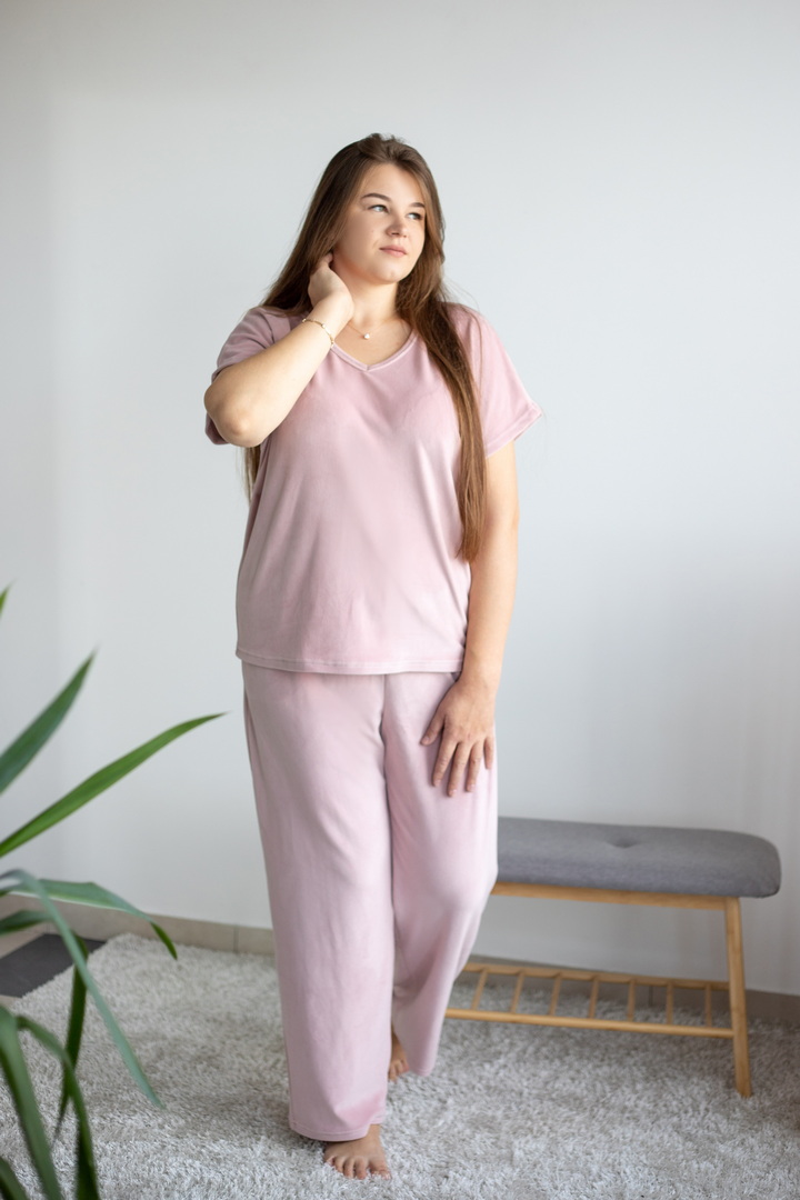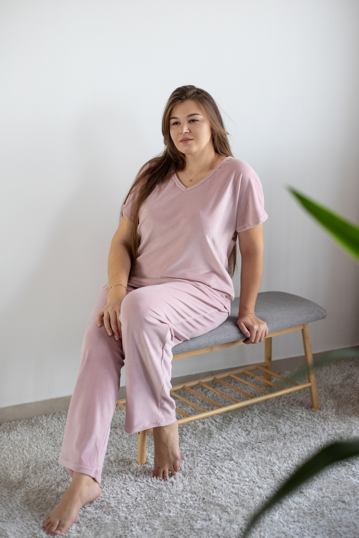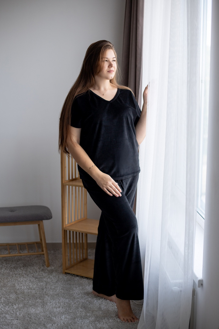 Жіночий комплект виконаний із велюру високої якості. Модель складається з футболки вільного крою, з V-подібним вирізом та прямих штанів з кишенями, для зручності вставлений шнурок.