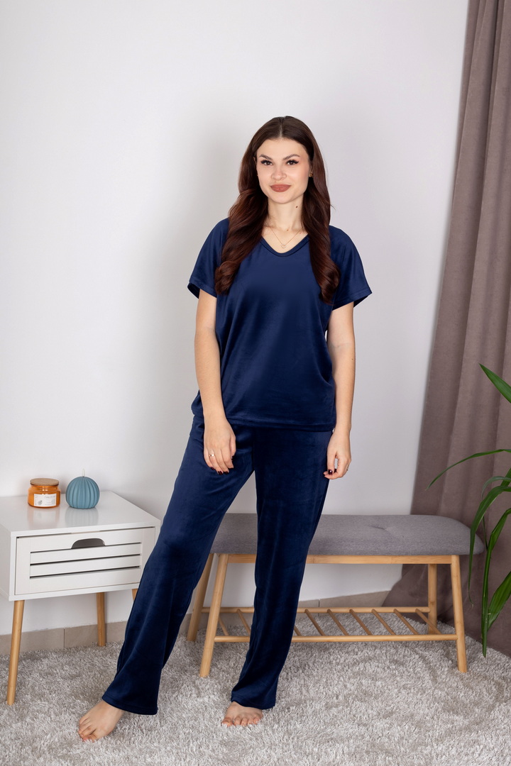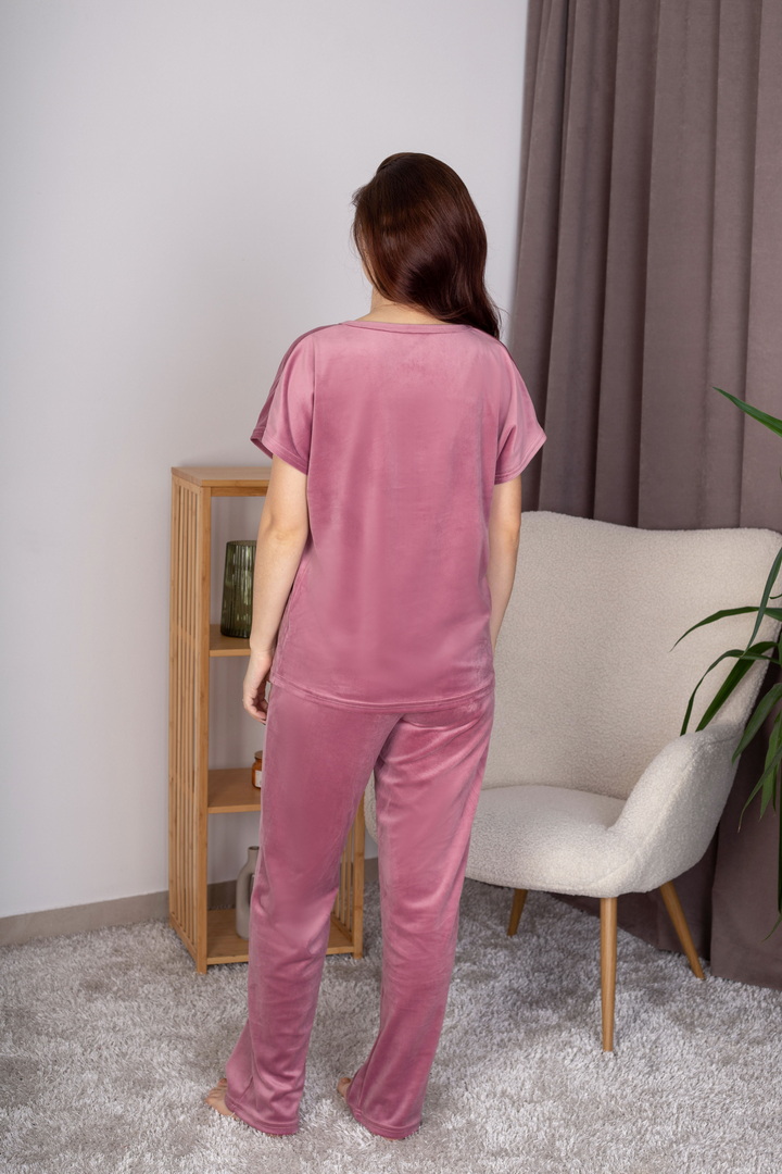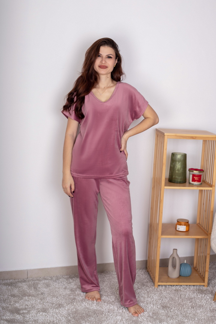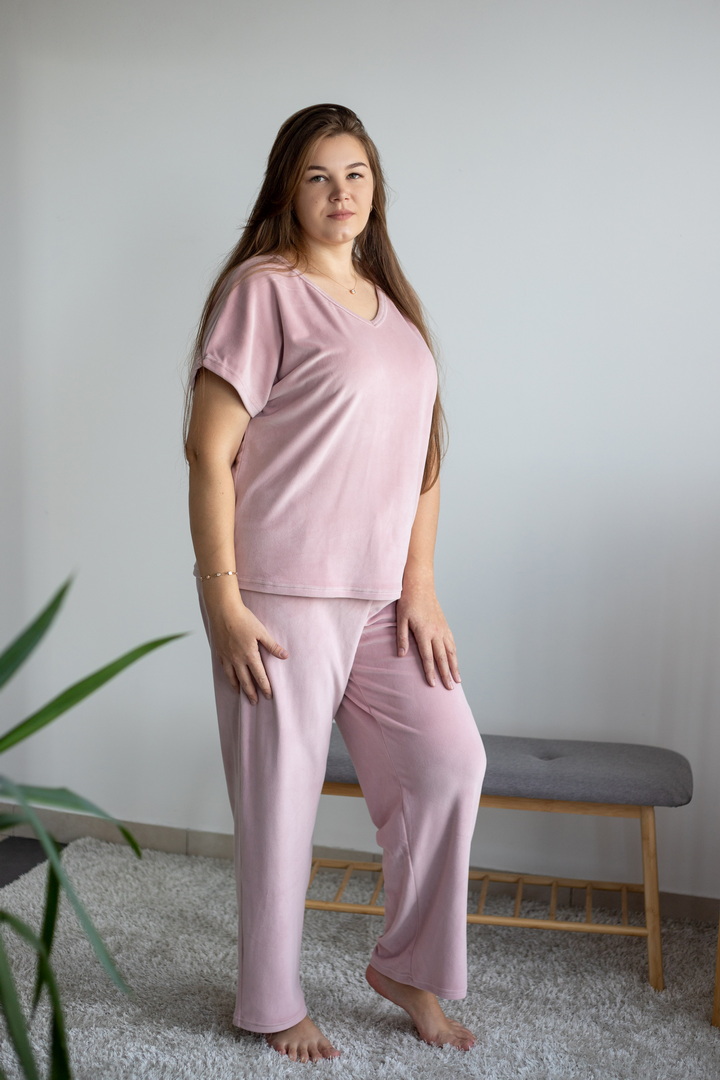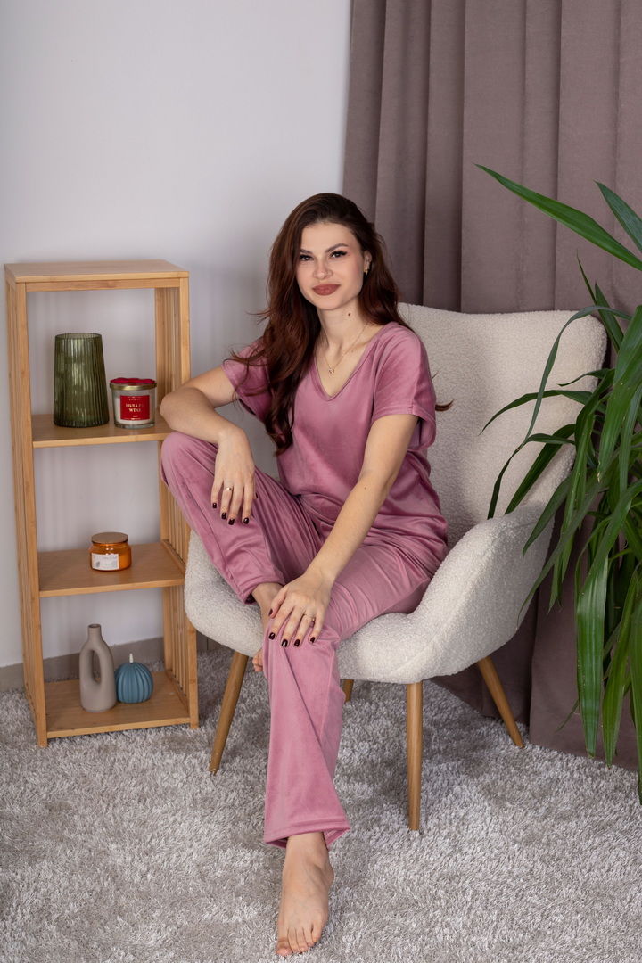 Жіночий домашній комплект із м’якого велюру створений для максимального комфорту, затишку та стильного вигляду. Ніжна, приємна на дотик тканина дарує відчуття тепла та делікатно огортає тіло, забезпечуючи комфорт протягом усього дня. Футболка має вільний, ненав’язливий крій. V-подібний виріз горловини та короткий рукав роблять модель універсальною та зручною для будь-якої пори року. Завдяки м’якій структурі велюру футболка красиво сяє та виглядає акуратно навіть після багаторазового прання. Штани виконані на комфортному еластичному поясі, що добре фіксується та не тисне. Це стильний вибір для тих, хто цінує поєднання краси, м’якості та практичності.