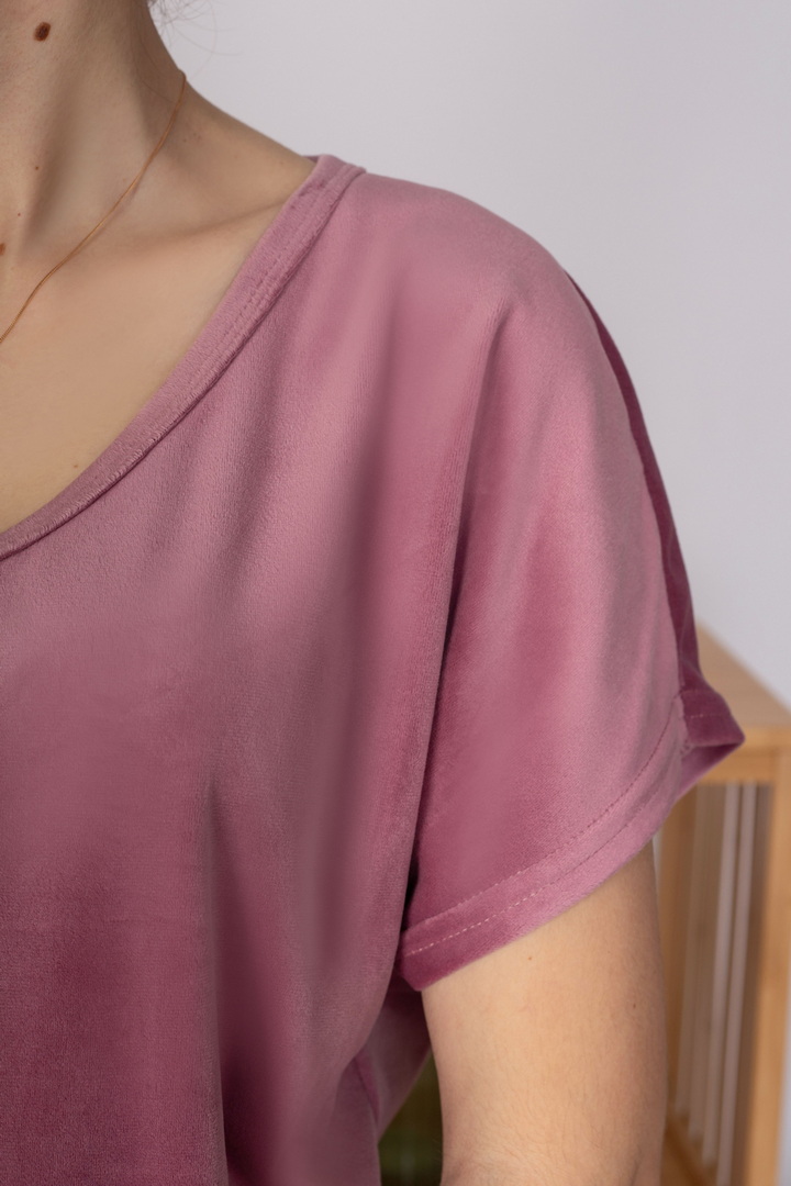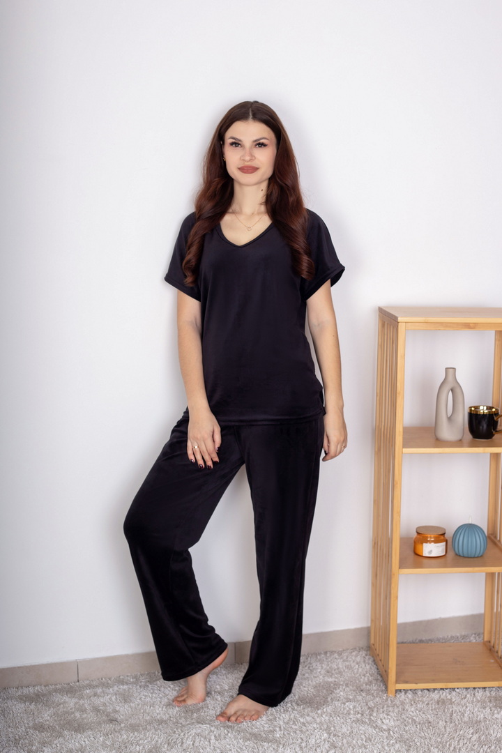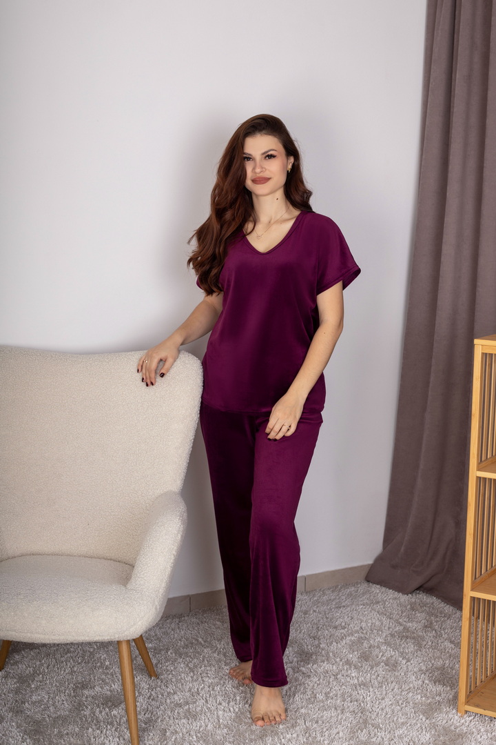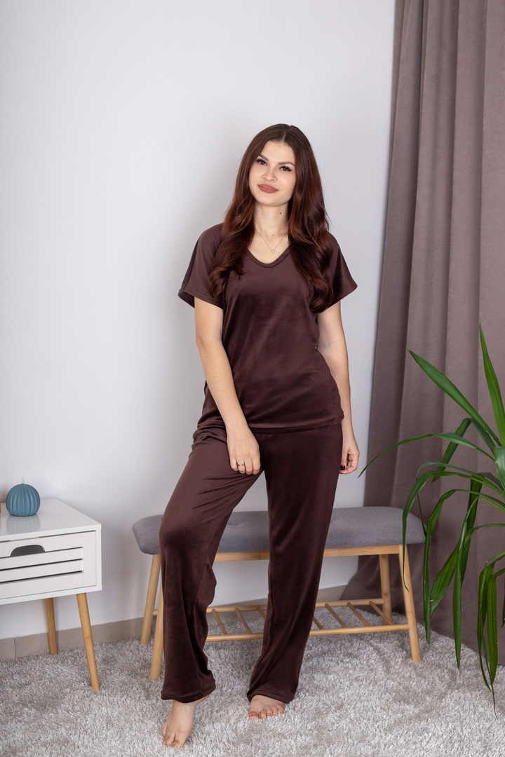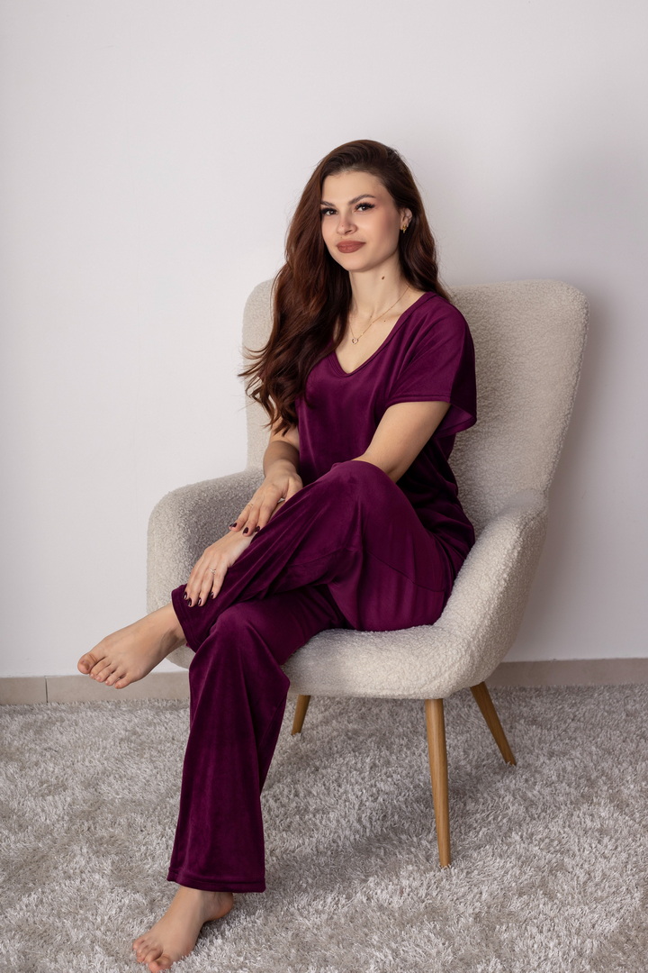 Жіночий домашній комплект із м’якого велюру створений для максимального комфорту, затишку та стильного вигляду. Ніжна, приємна на дотик тканина дарує відчуття тепла та делікатно огортає тіло, забезпечуючи комфорт протягом усього дня. Футболка має вільний, ненав’язливий крій. V-подібний виріз горловини та короткий рукав роблять модель універсальною та зручною для будь-якої пори року. Завдяки м’якій структурі велюру футболка красиво сяє та виглядає акуратно навіть після багаторазового прання. Штани виконані на комфортному еластичному поясі, що добре фіксується та не тисне. Це стильний вибір для тих, хто цінує поєднання краси, м’якості та практичності.