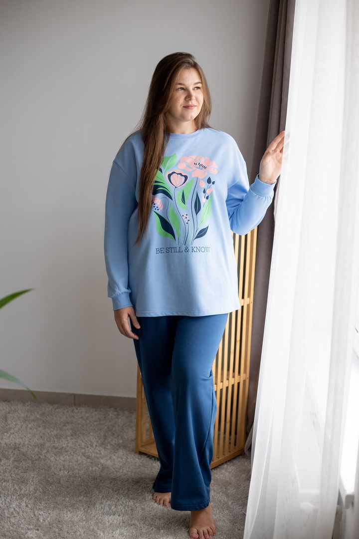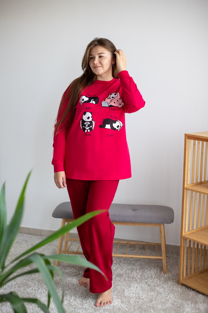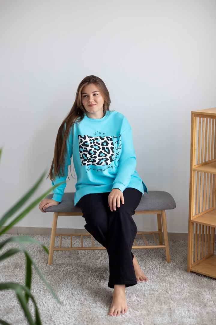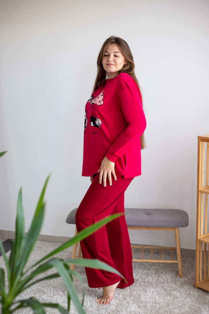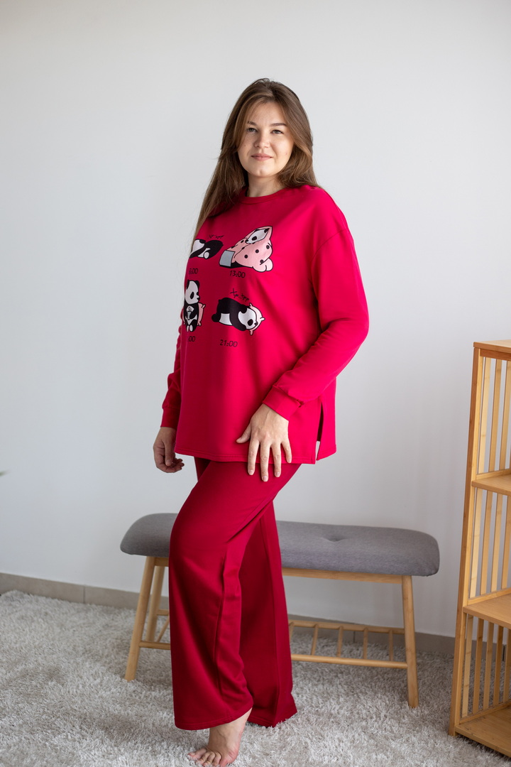 Піжама виконана з полотна "Футер з начосом". Полотно високої якості, м'яке, приємне до тіла, натуральне. Комплект складається з джемпера та штанів. Джемпер з однотонного полотна, з округлою горловиною, спереду нанесений накат, виконаний методом шовкотрафаретного друку. Штани з принтованого полотна, прямого крою.