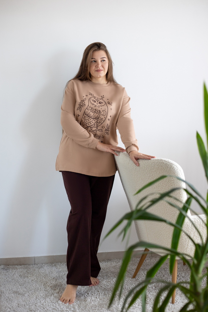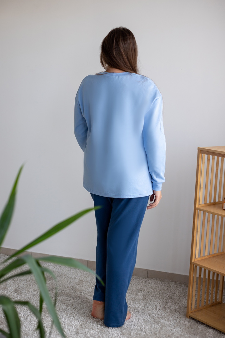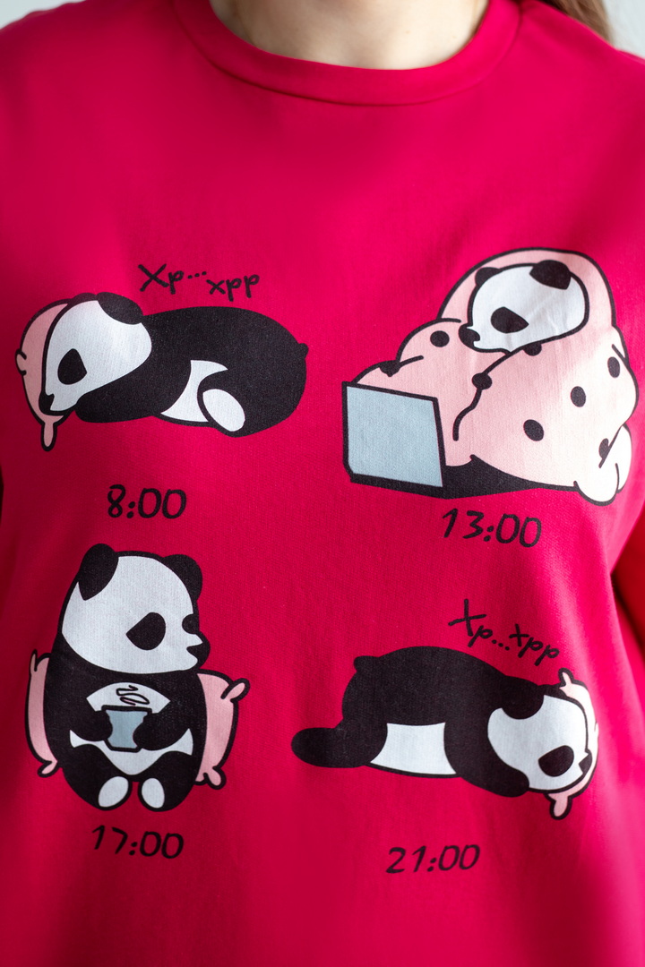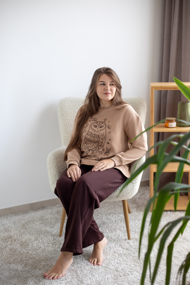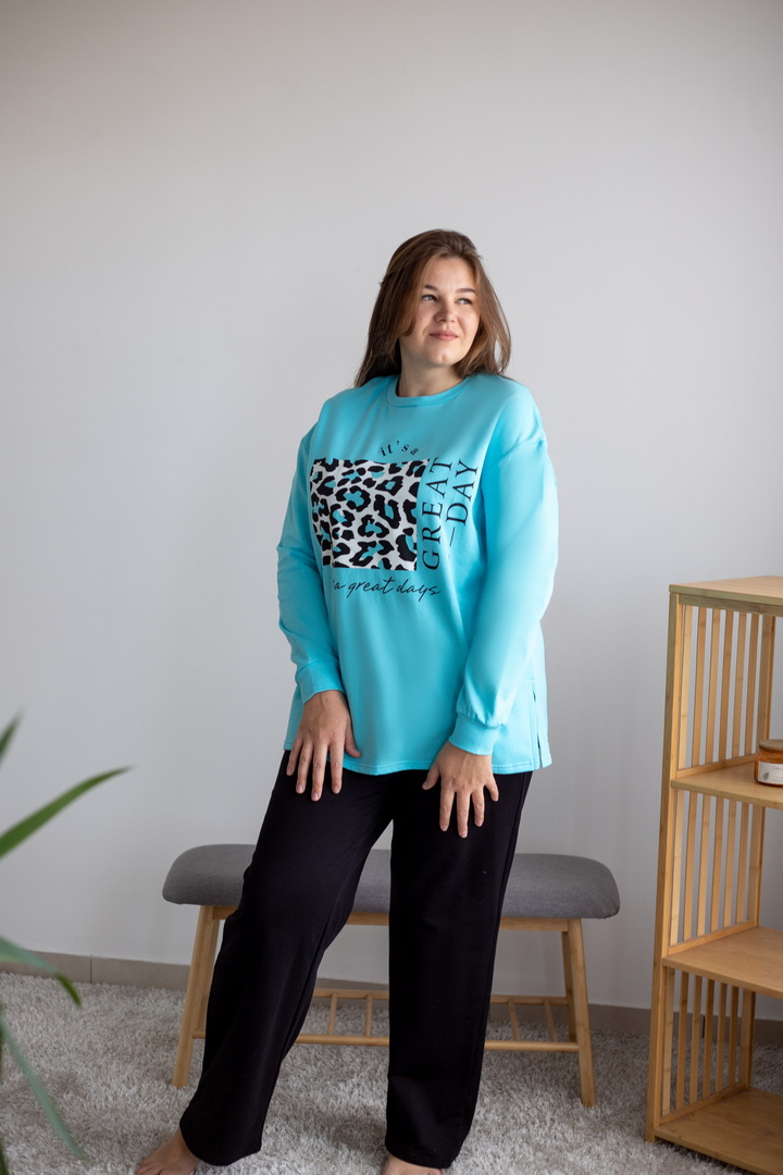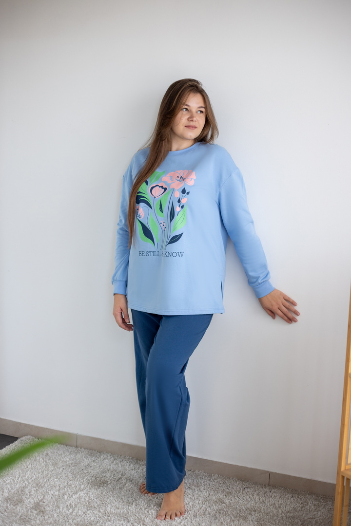 Піжама виконана з полотна "Футер з начосом". Полотно високої якості, м'яке, приємне до тіла, натуральне. Комплект складається з джемпера та штанів. Джемпер з однотонного полотна, з округлою горловиною, спереду нанесений накат, виконаний методом шовкотрафаретного друку. Штани з принтованого полотна, прямого крою.