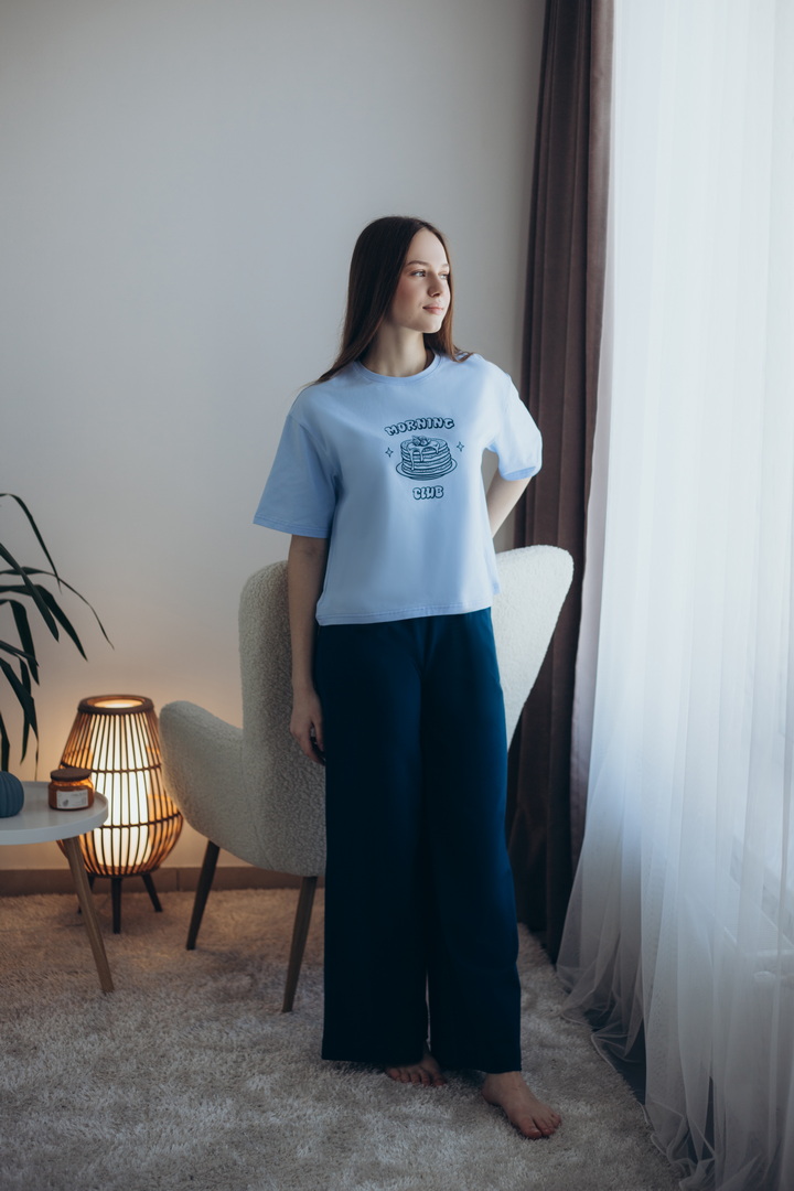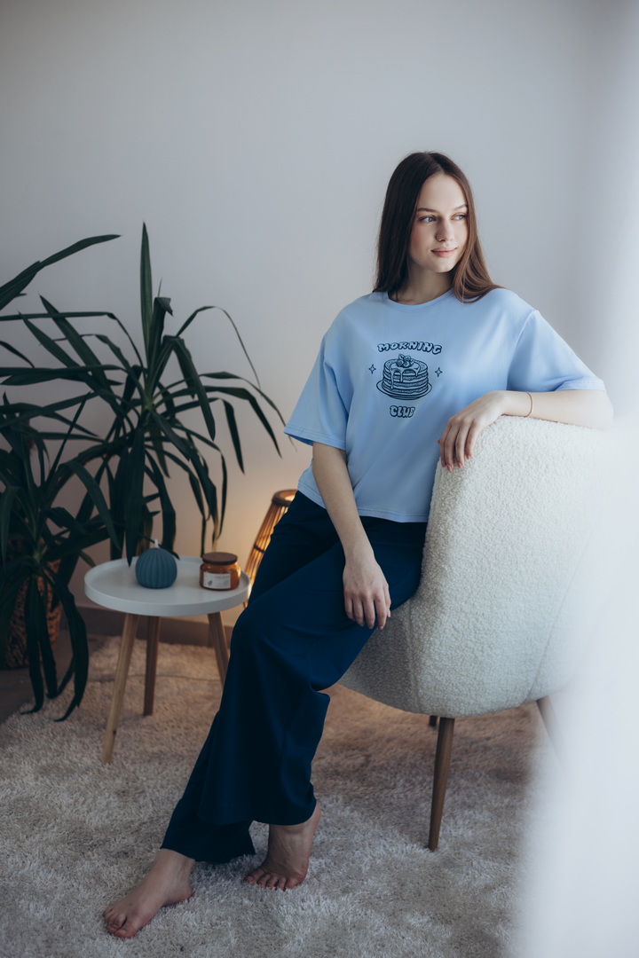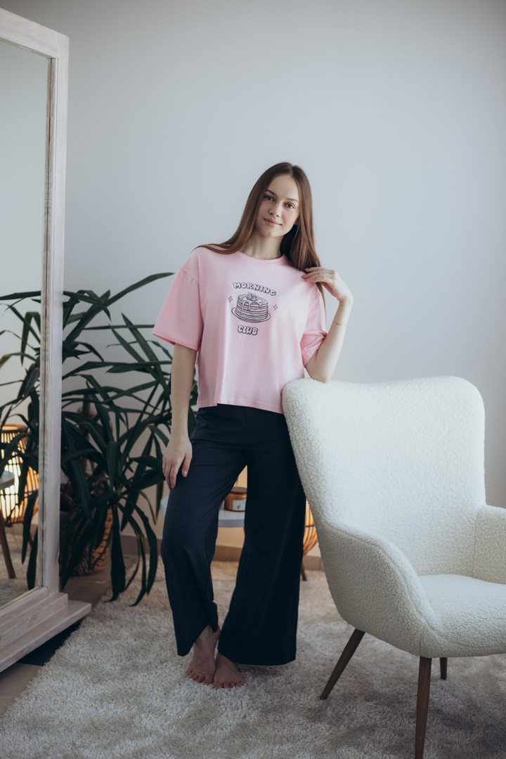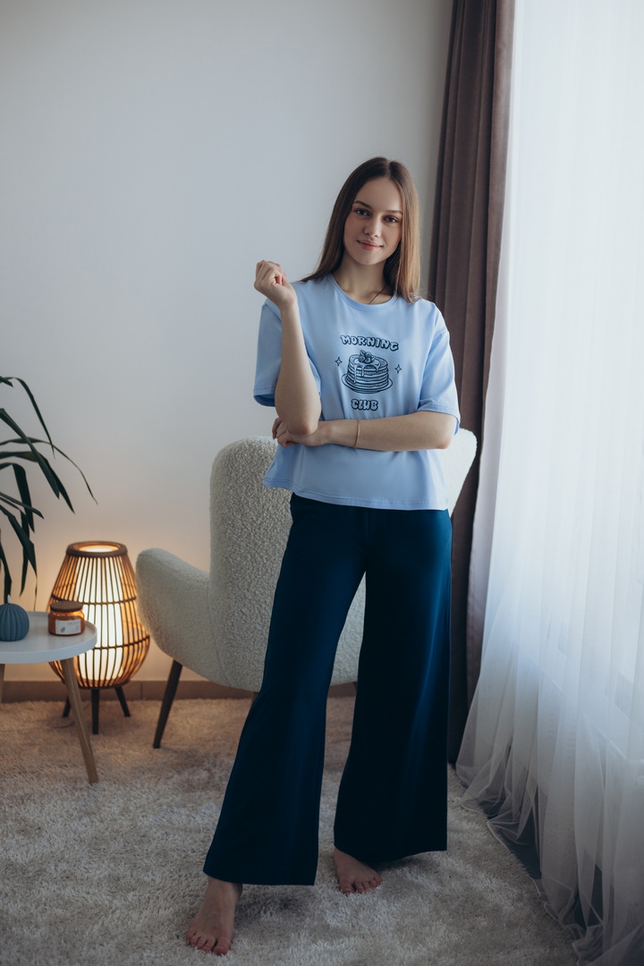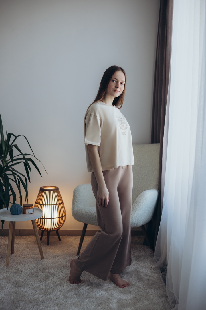 Комплект виконаний зі стрейч-куліра піньє. Полотно високої якості, м'яке, приємне до тіла, натуральне за складом. Комплект складається із футболки та штанів. Футболка з однотонного полотна, із округлою горловиною, по переду нанесений накат. Штани з однотонного полотна, знизу розширені.