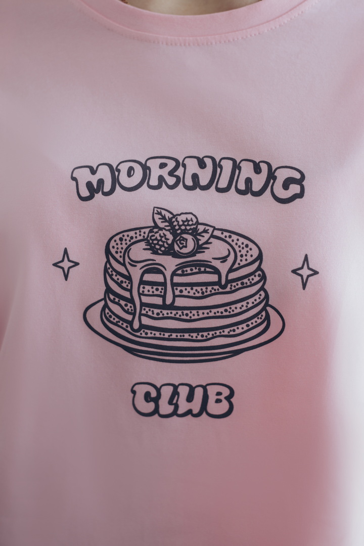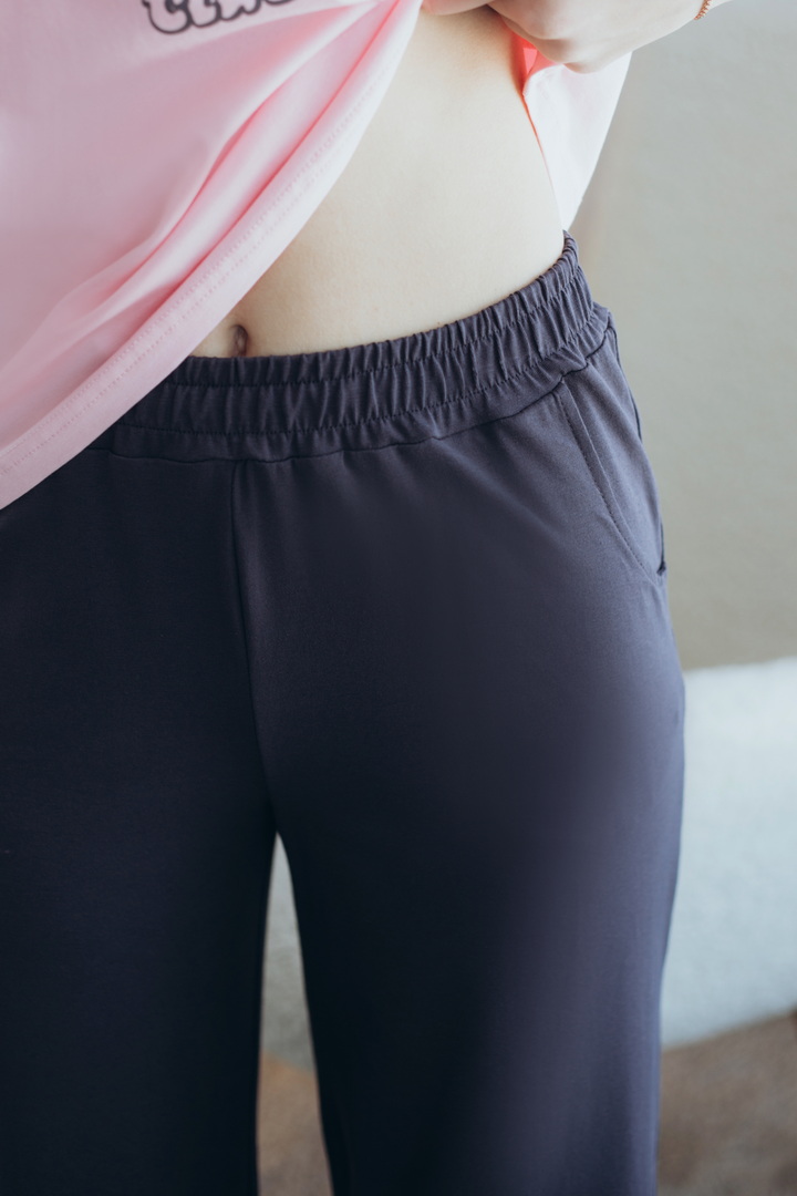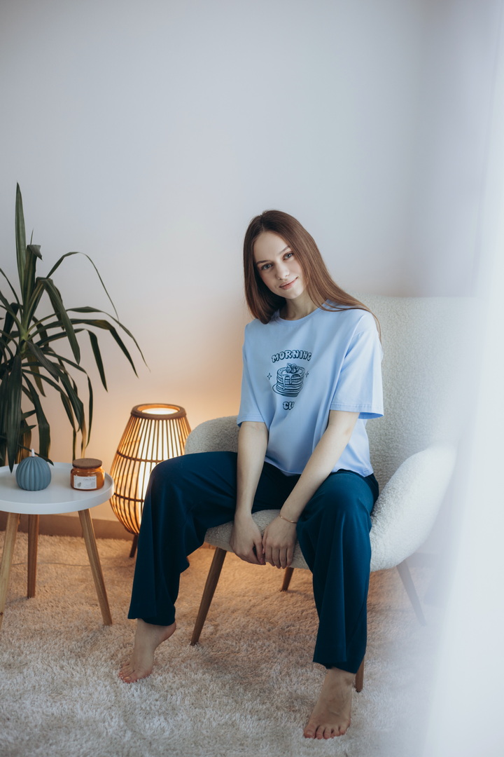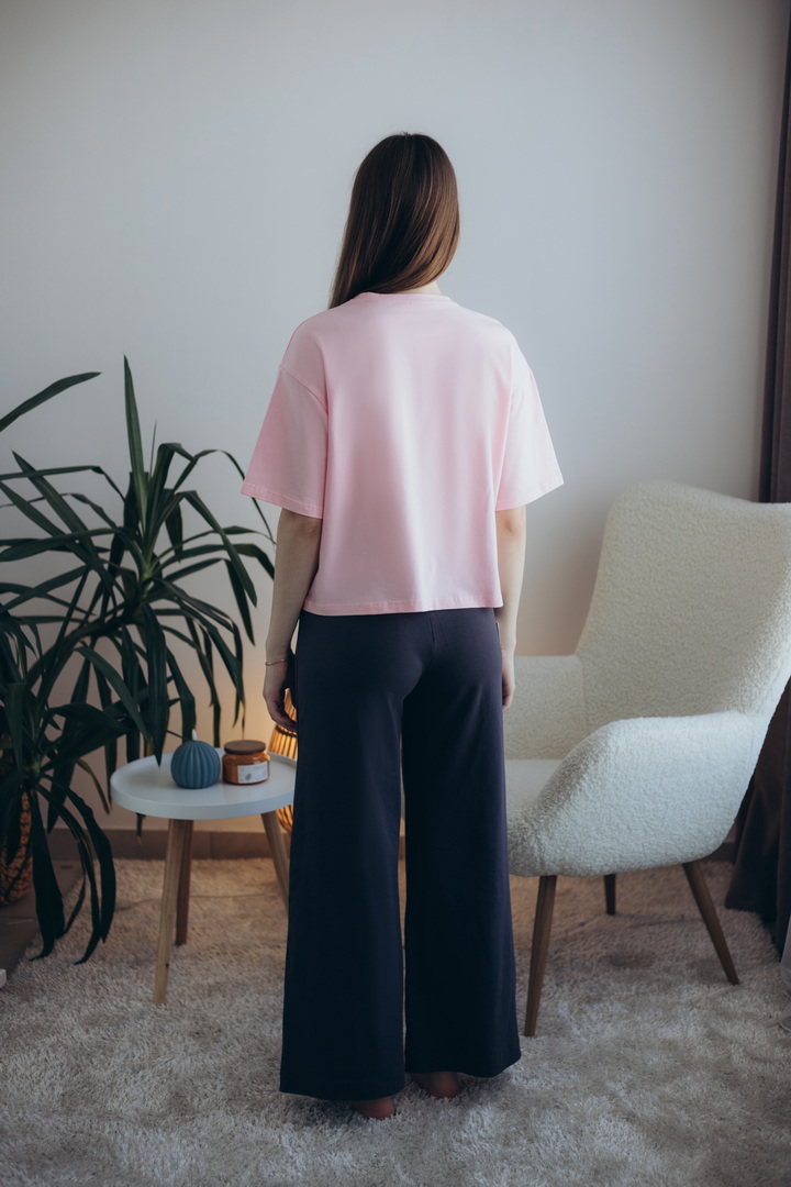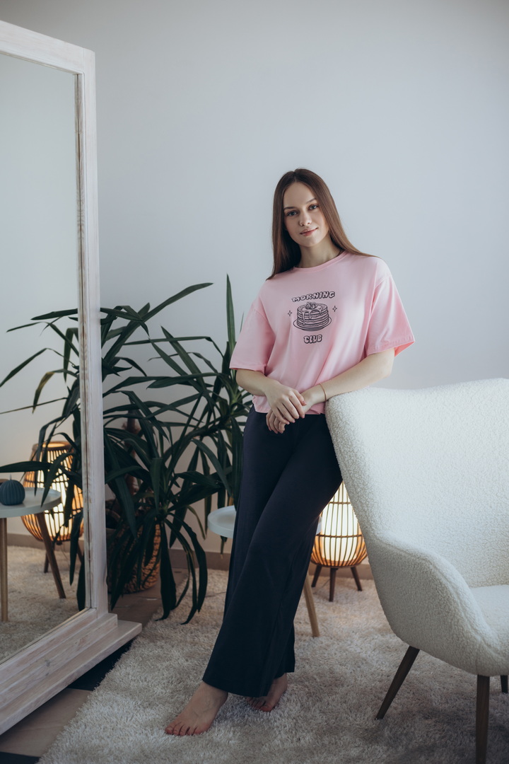 Комплект виконаний зі стрейч-куліра піньє. Полотно високої якості, м'яке, приємне до тіла, натуральне за складом. Комплект складається із футболки та штанів. Футболка з однотонного полотна, із округлою горловиною, по переду нанесений накат. Штани з однотонного полотна, знизу розширені.