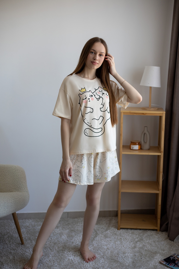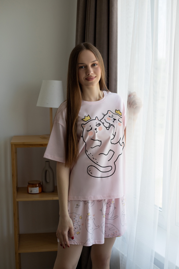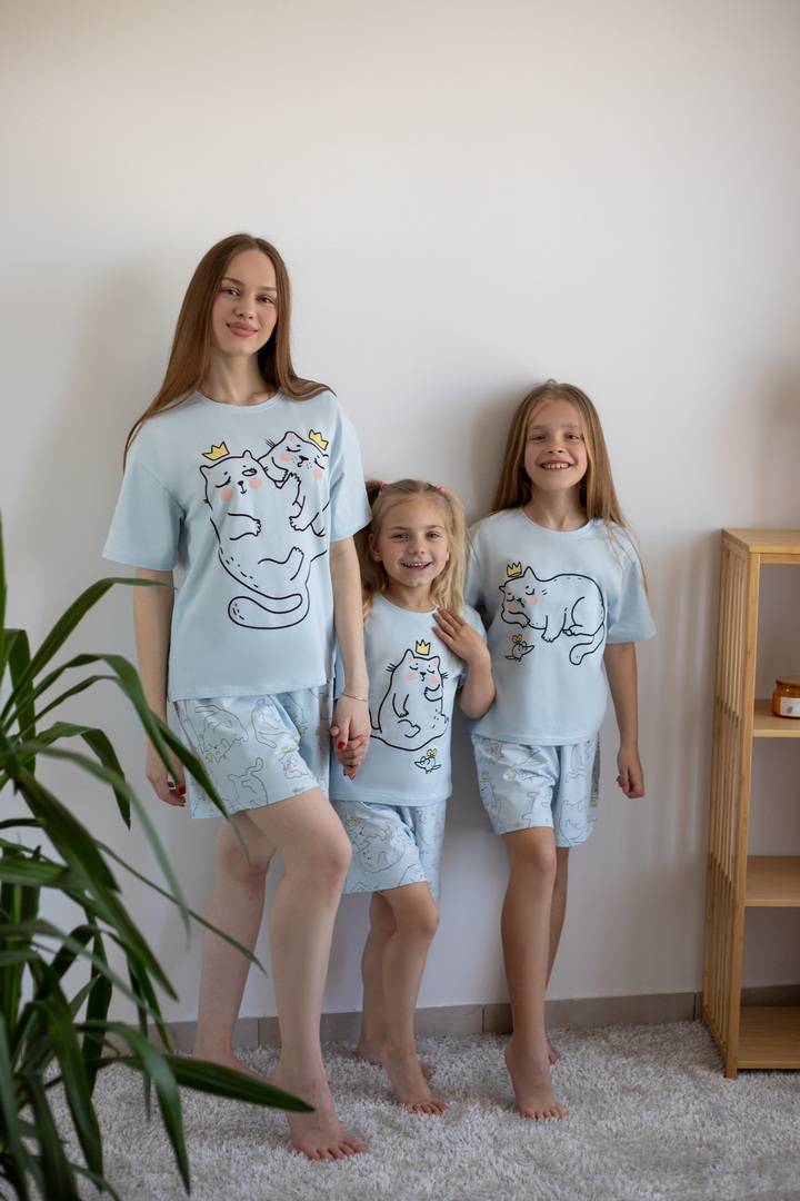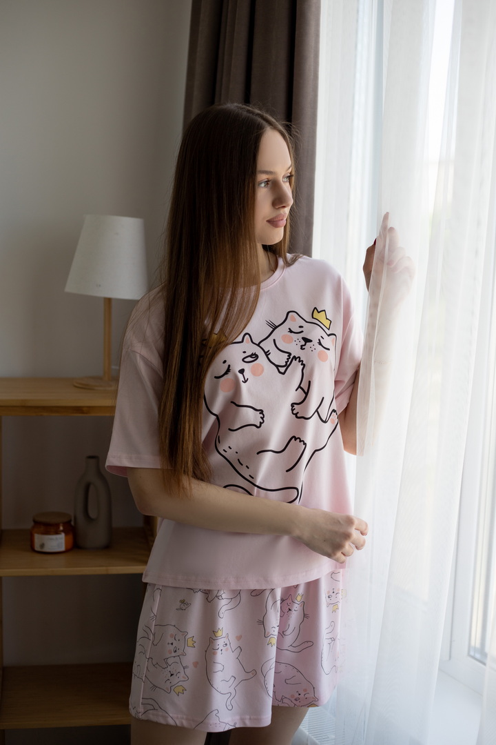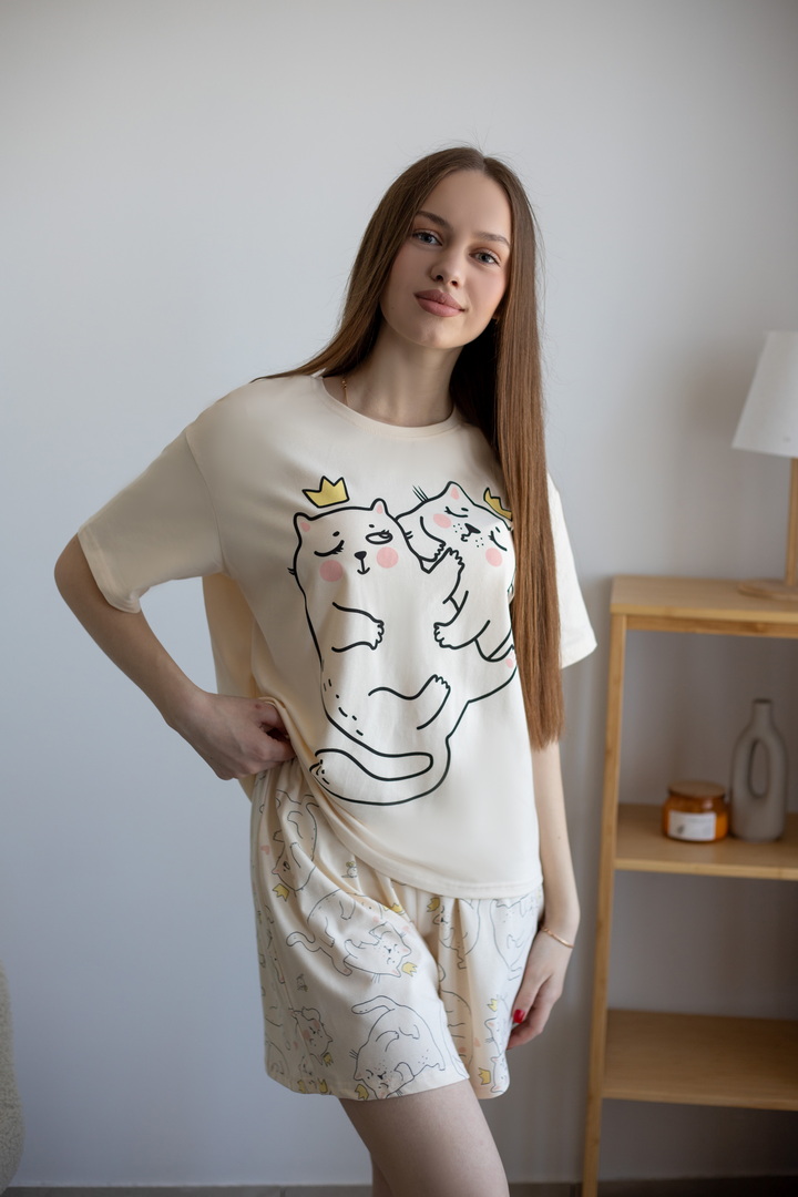 Легка зручна піжама для жінок з однотонного та принтованого стрейч-куліра пеньє. Модель вільного крою складається з футболки з короткими рукавами, зі спущеною лінією плеча, округлою горловиною, а також шорт на гумці. Завдяки натуральному складу полотна ця піжама стане улюбленою річчю в домашньому гардеробі жінок, а асортимент модних принтів задовольнить будь-яку модницю. Також є можливість придбати схожі моделі дитячих піжам для створення Family look.