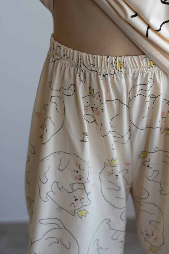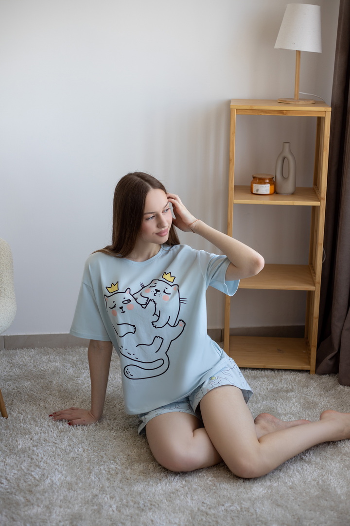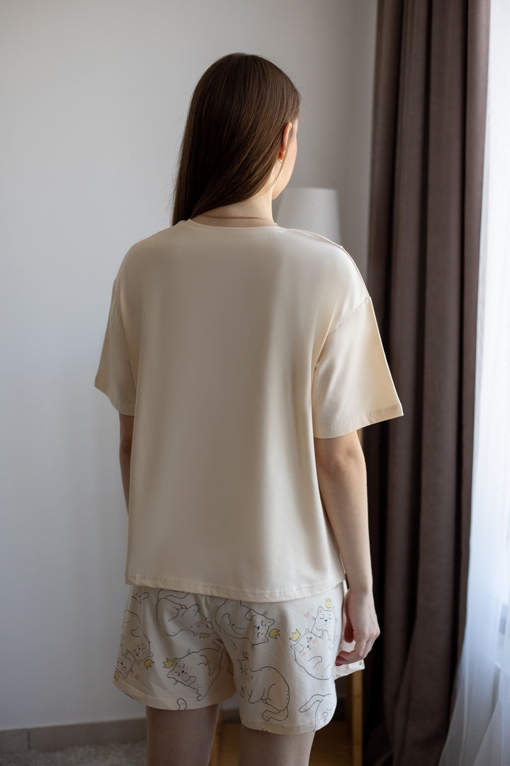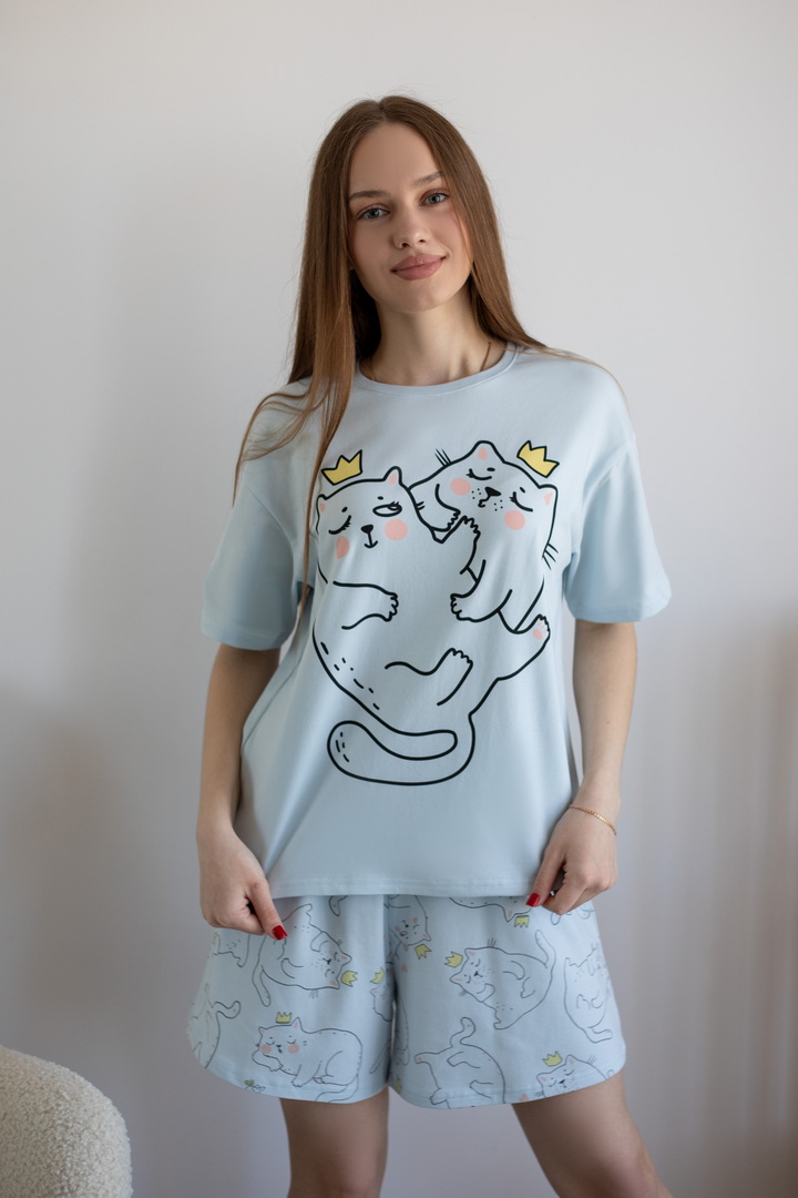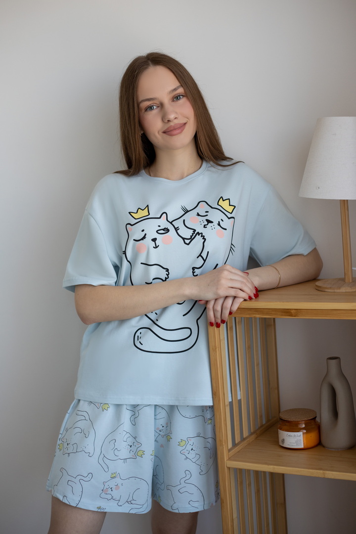 Легка зручна піжама для жінок з однотонного та принтованого стрейч-куліра пеньє. Модель вільного крою складається з футболки з короткими рукавами, зі спущеною лінією плеча, округлою горловиною, а також шорт на гумці. Завдяки натуральному складу полотна ця піжама стане улюбленою річчю в домашньому гардеробі жінок, а асортимент модних принтів задовольнить будь-яку модницю. Також є можливість придбати схожі моделі дитячих піжам для створення Family look.