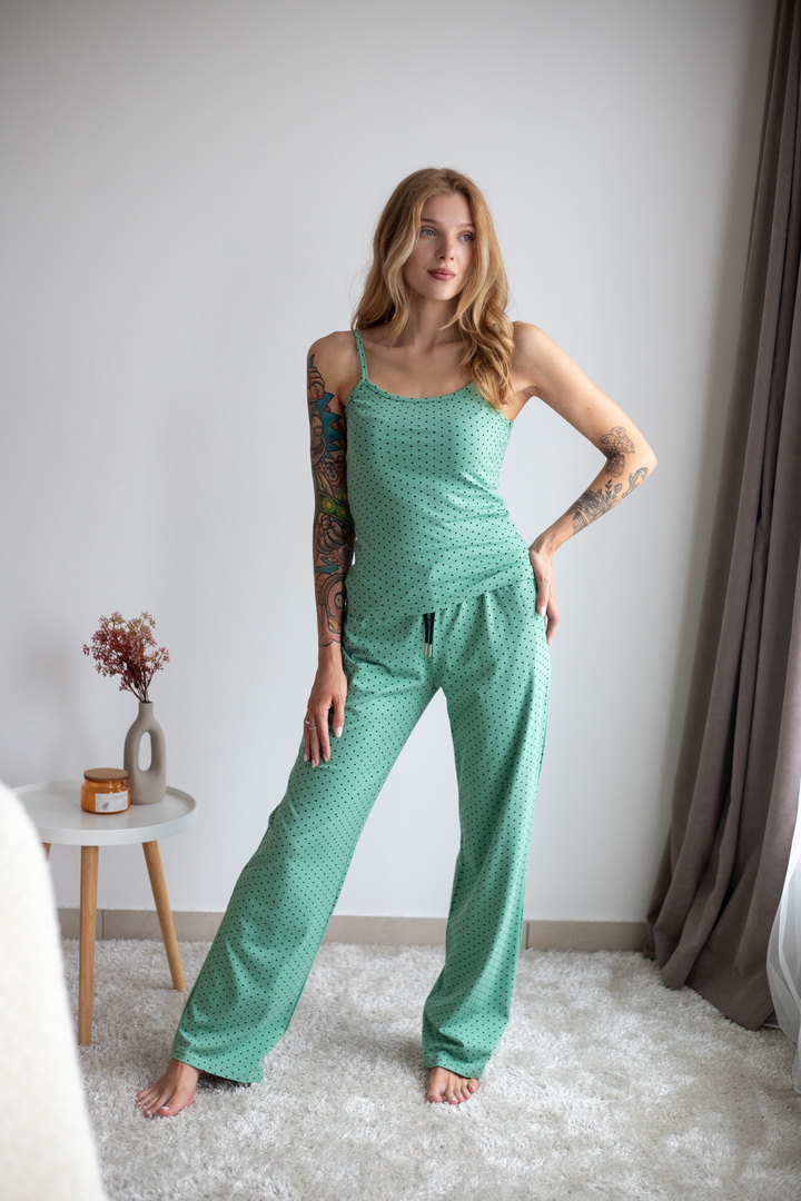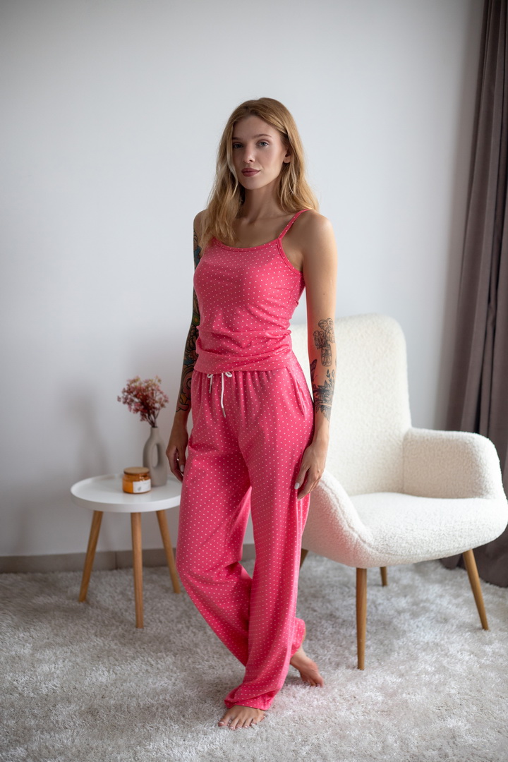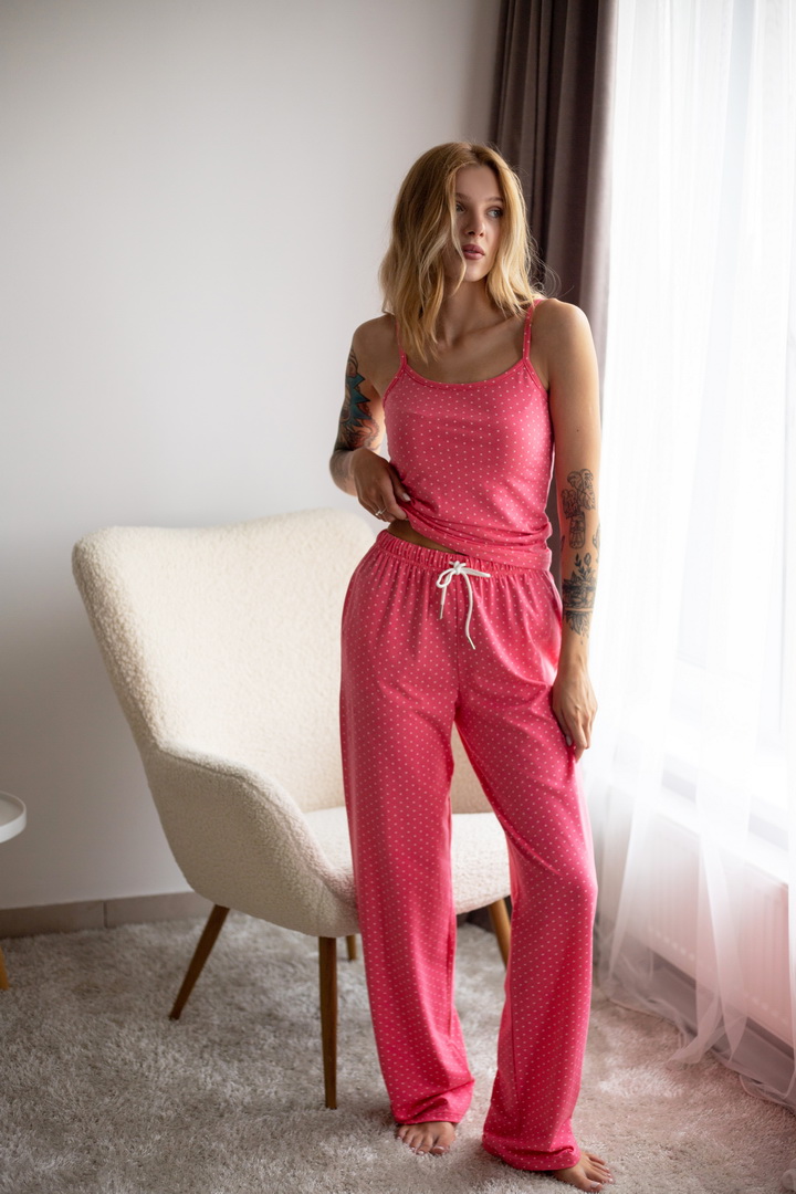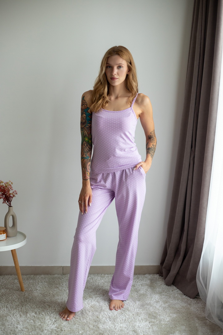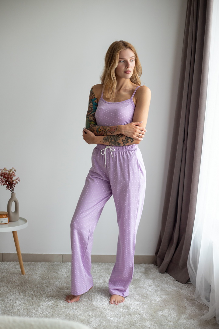 Жіночий комплект для дому та сну. Легкий, зручний і стильний — саме таким має бути улюблений домашній одяг. Комплект зі стрейч-куліру пеньє ніжно облягає фігуру та дарує комфорт у кожному русі. Майка на тонких бретелях та вільні штани — ідеальне поєднання для затишних вечорів і солодкого сну. Гарно тримає форму після прання, зручна посадка.