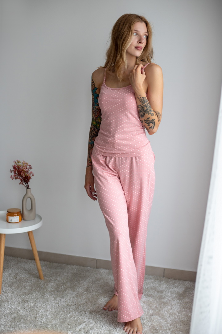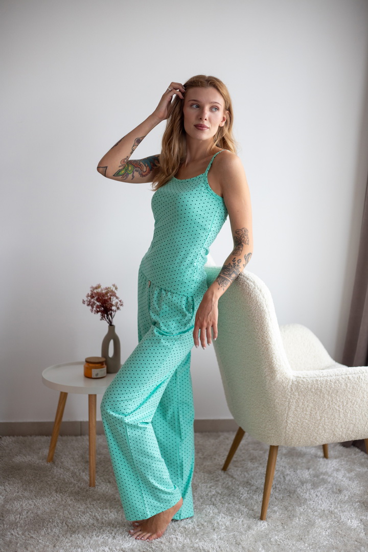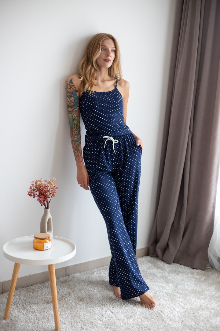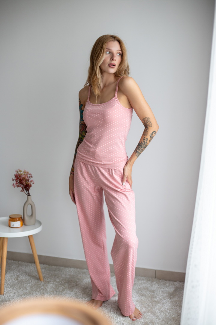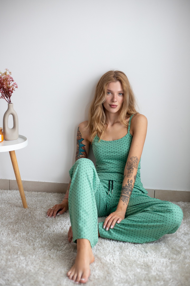 Жіночий комплект для дому та сну. Легкий, зручний і стильний — саме таким має бути улюблений домашній одяг. Комплект зі стрейч-куліру пеньє ніжно облягає фігуру та дарує комфорт у кожному русі. Майка на тонких бретелях та вільні штани — ідеальне поєднання для затишних вечорів і солодкого сну. Гарно тримає форму після прання, зручна посадка.