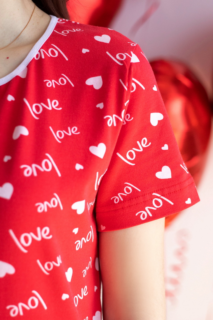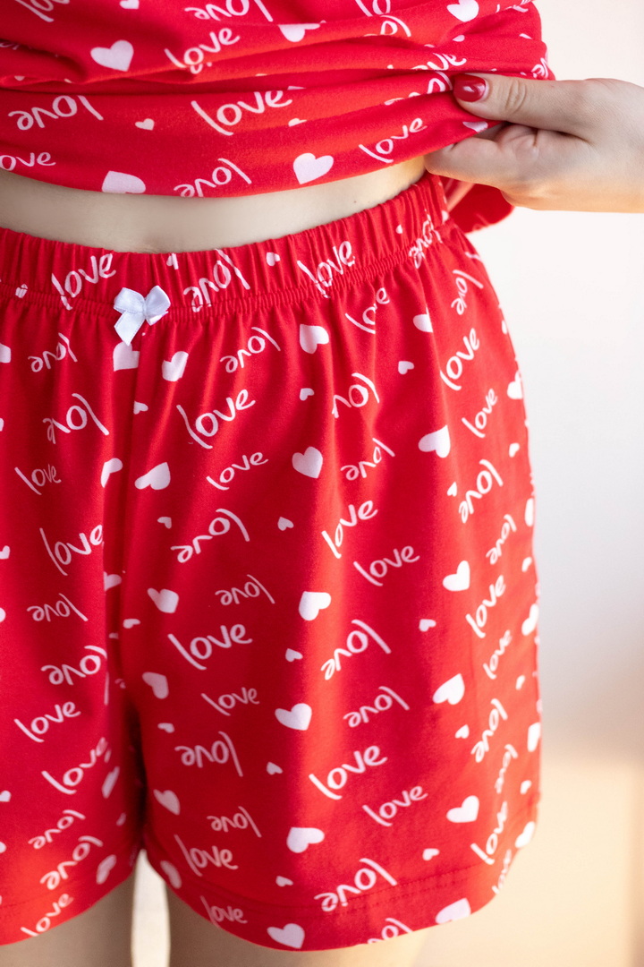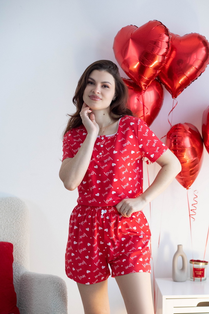 Цей жіночий комплект створений для моментів, коли хочеться відчувати комфорт, легкість і трішки романтики. М’який стрейч-кулір пеньє ніжно огортає тіло, даруючи приємні тактильні відчуття. Матеріал дихає, добре тягнеться та зберігає форму. Футболка з класичним округлим вирізом ідеально сідає по фігурі, підкреслюючи жіночність без зайвого облягання. Шорти на еластичному поясі забезпечують максимальний комфорт — нічого не тисне та не сковує. Романтичний принт із сердечками та написами love створює настрій затишку, ніжності та тепла. Це той варіант, у якому хочеться бути завжди — красиво, зручно і по-справжньому комфортно.