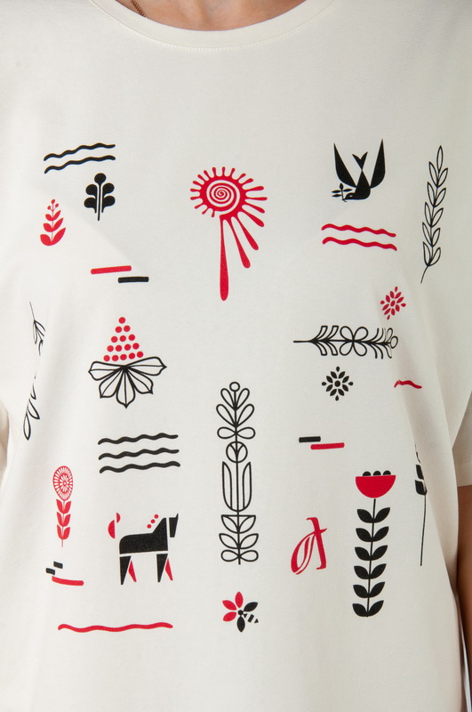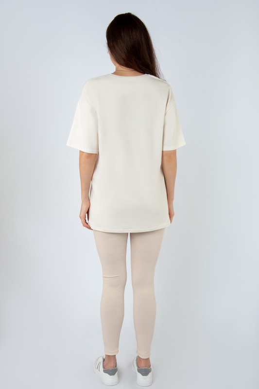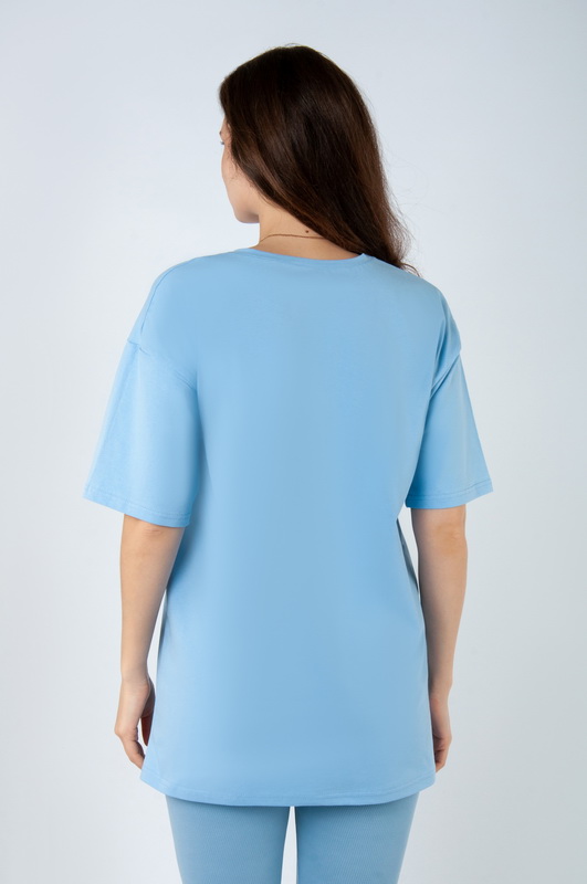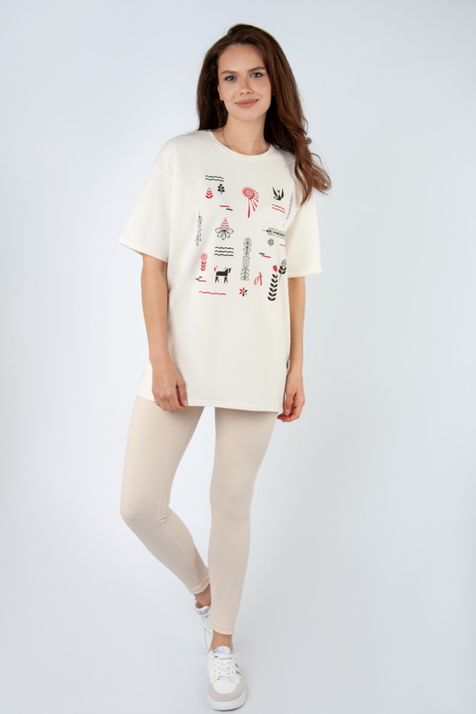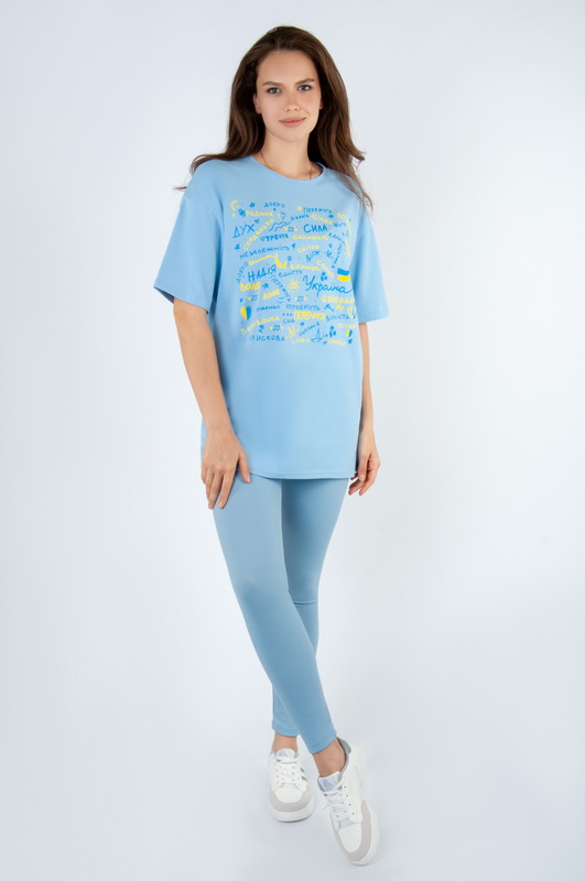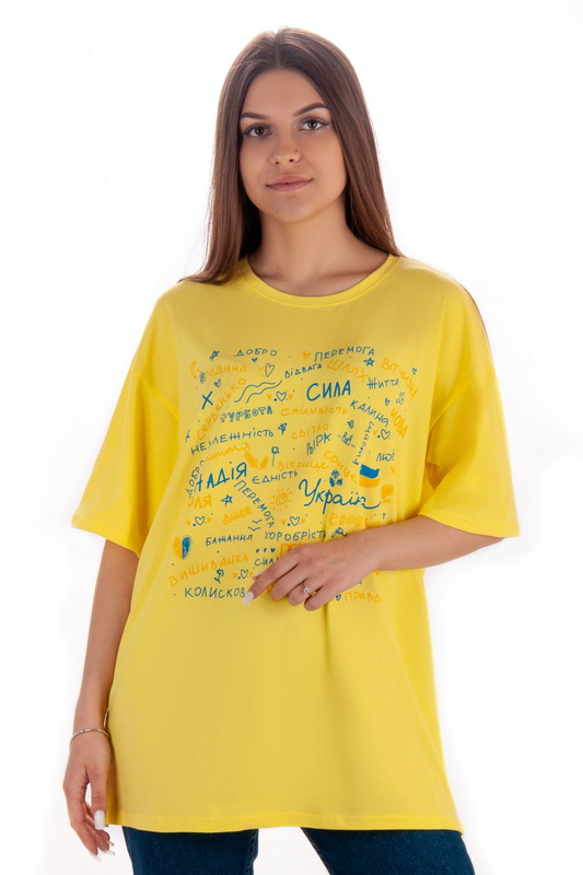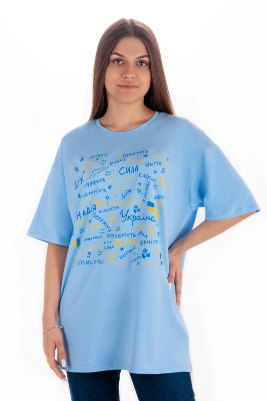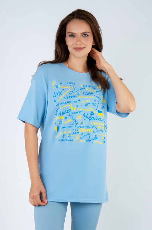 Стильна футболка oversize для жінок із легкого стрейч-куліра. Модель з короткими рукавами та округлим вирізом, пропонується в різних кольорах з актуальним цього сезону принтом, виконаним методом шовкотрафаретного друку. Футболка відмінно комбінується з джинсами, шортами, легінсами. Полотно хорошої якості, не линяє, натуральне за складом, може давати усадку.