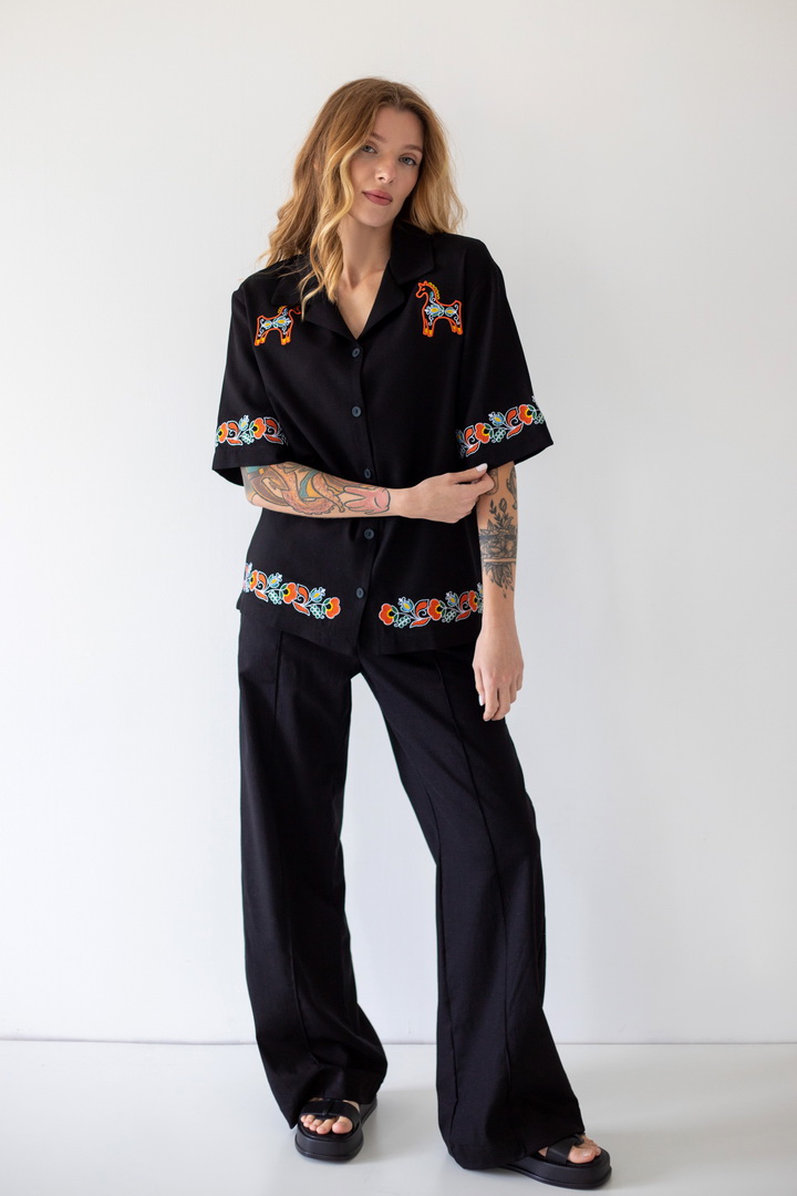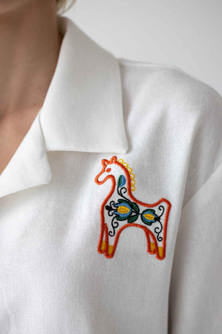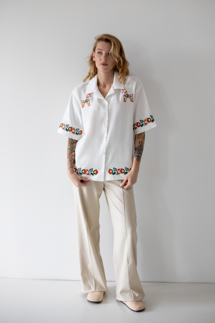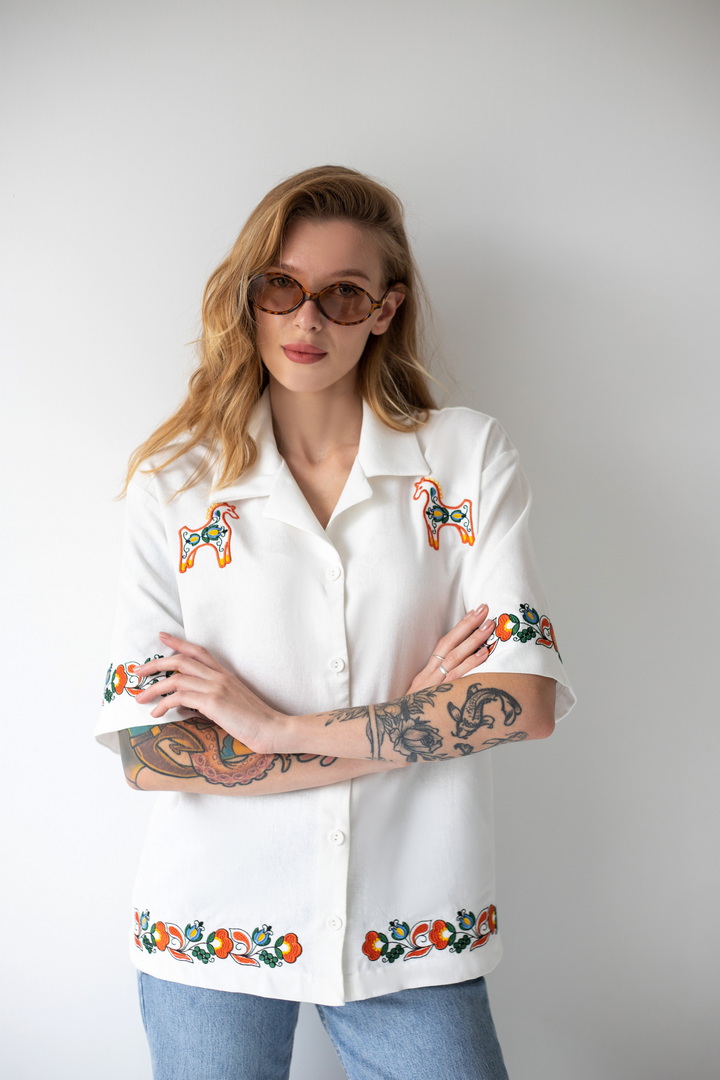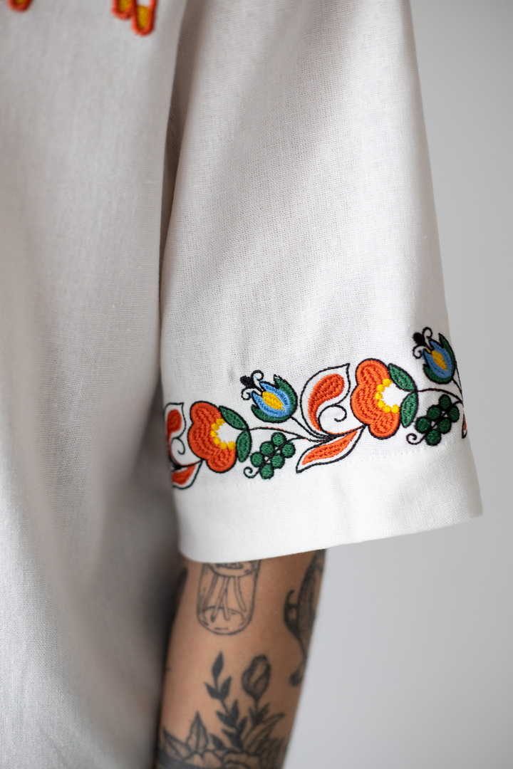 Ця сорочка — більше ніж одяг. Вона створена як місток між минулим і сучасністю. У візерунках ви впізнаєте стилістику традиційного опішнянського розпису — яскравого декоративного мистецтва Полтавщини. Особлива деталь — зображення глиняного коника-свистунця, давнього оберега, що символізує радість, захист і душевне тепло.