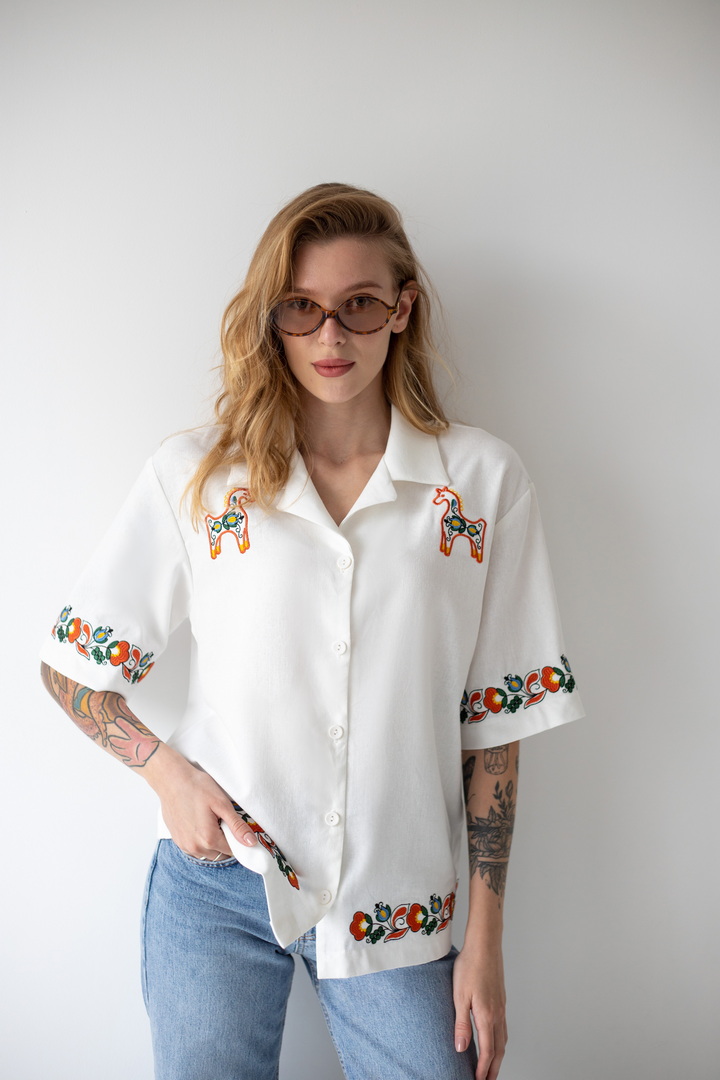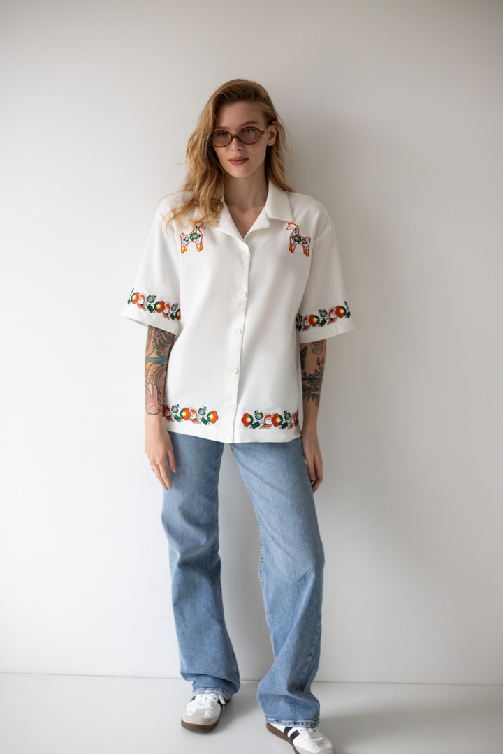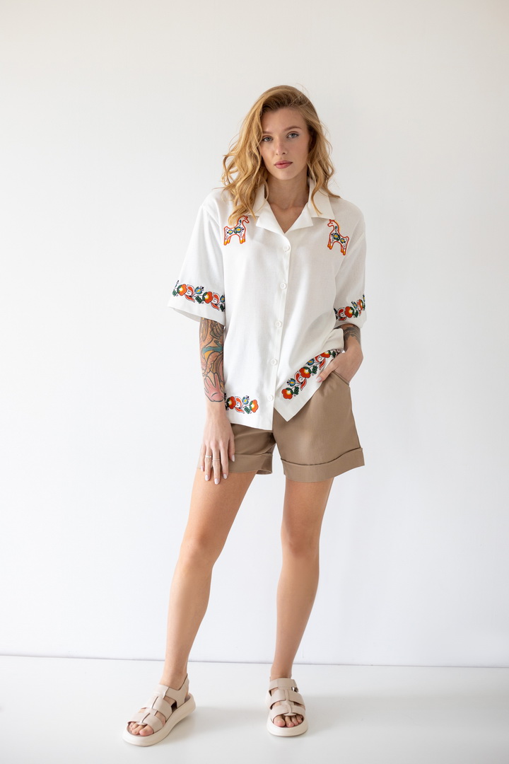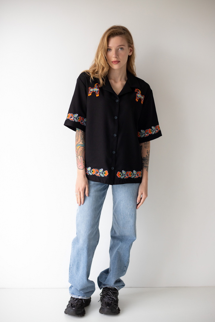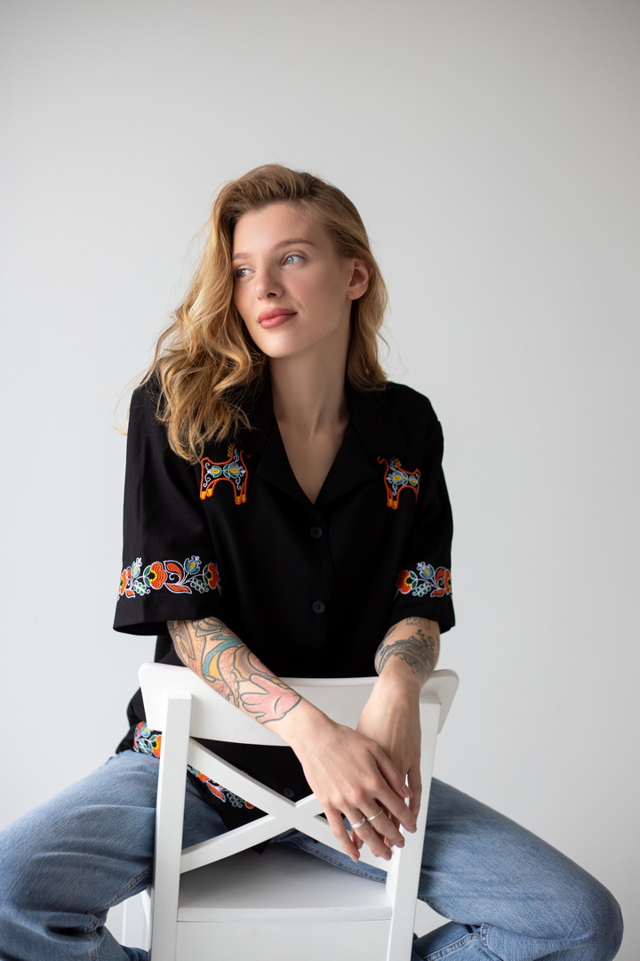 Ця сорочка — більше ніж одяг. Вона створена як місток між минулим і сучасністю. У візерунках ви впізнаєте стилістику традиційного опішнянського розпису — яскравого декоративного мистецтва Полтавщини. Особлива деталь — зображення глиняного коника-свистунця, давнього оберега, що символізує радість, захист і душевне тепло.