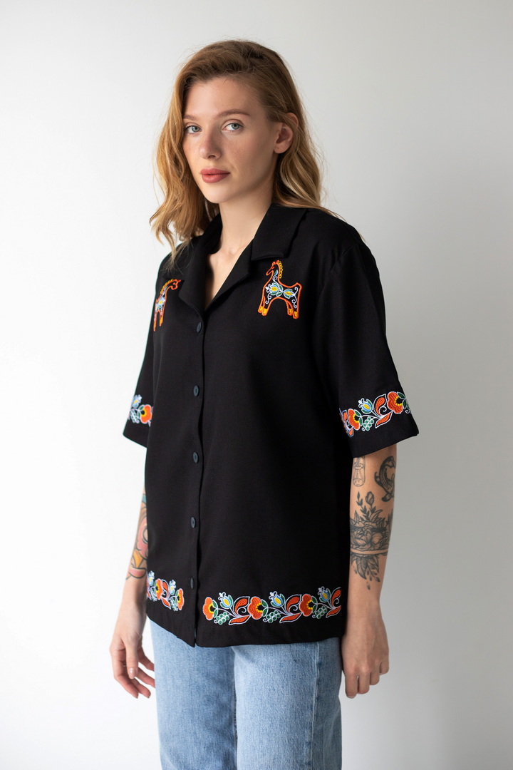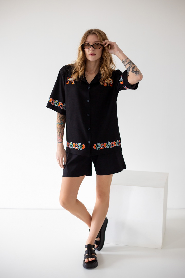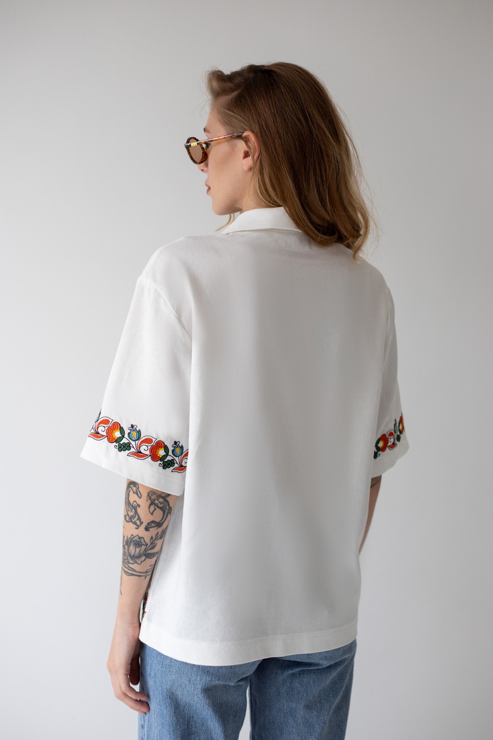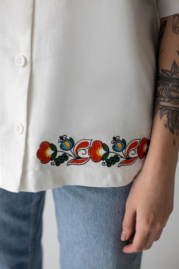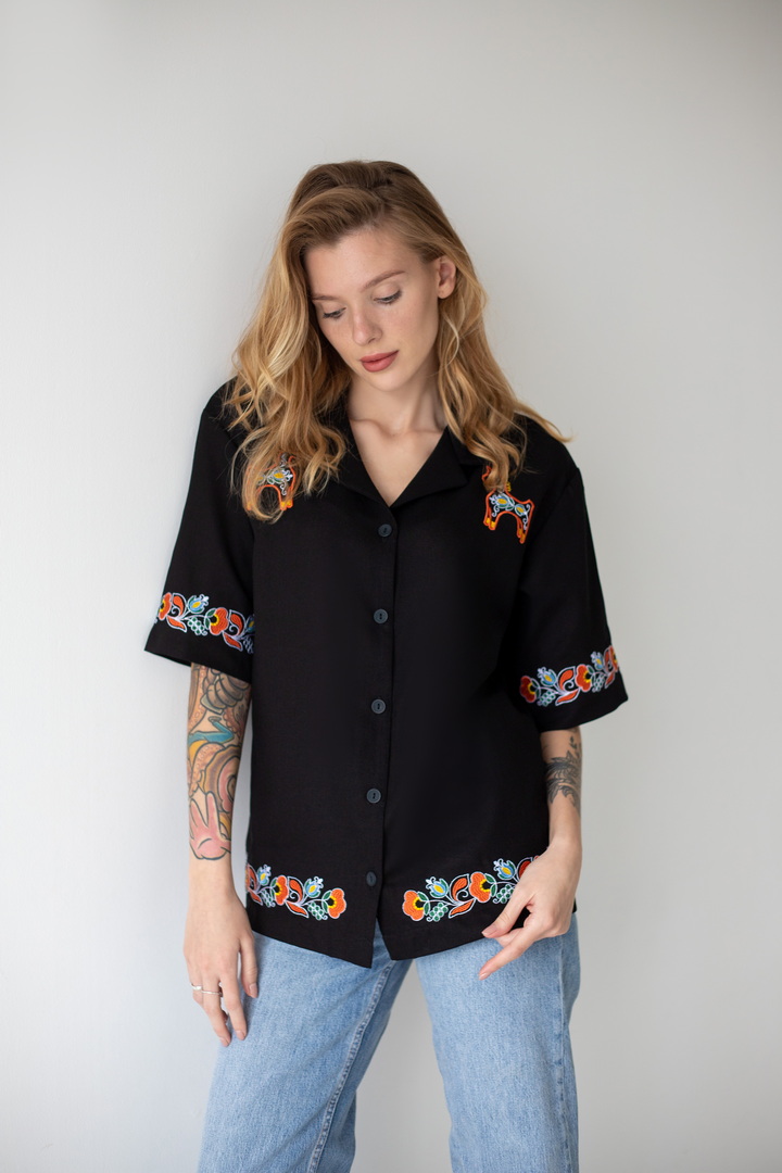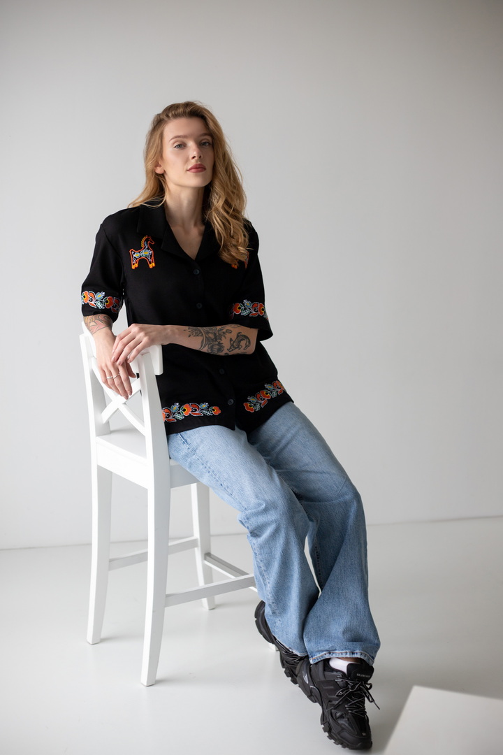 Сучасна жіноча сорочка з елементами опішнянського розпису.