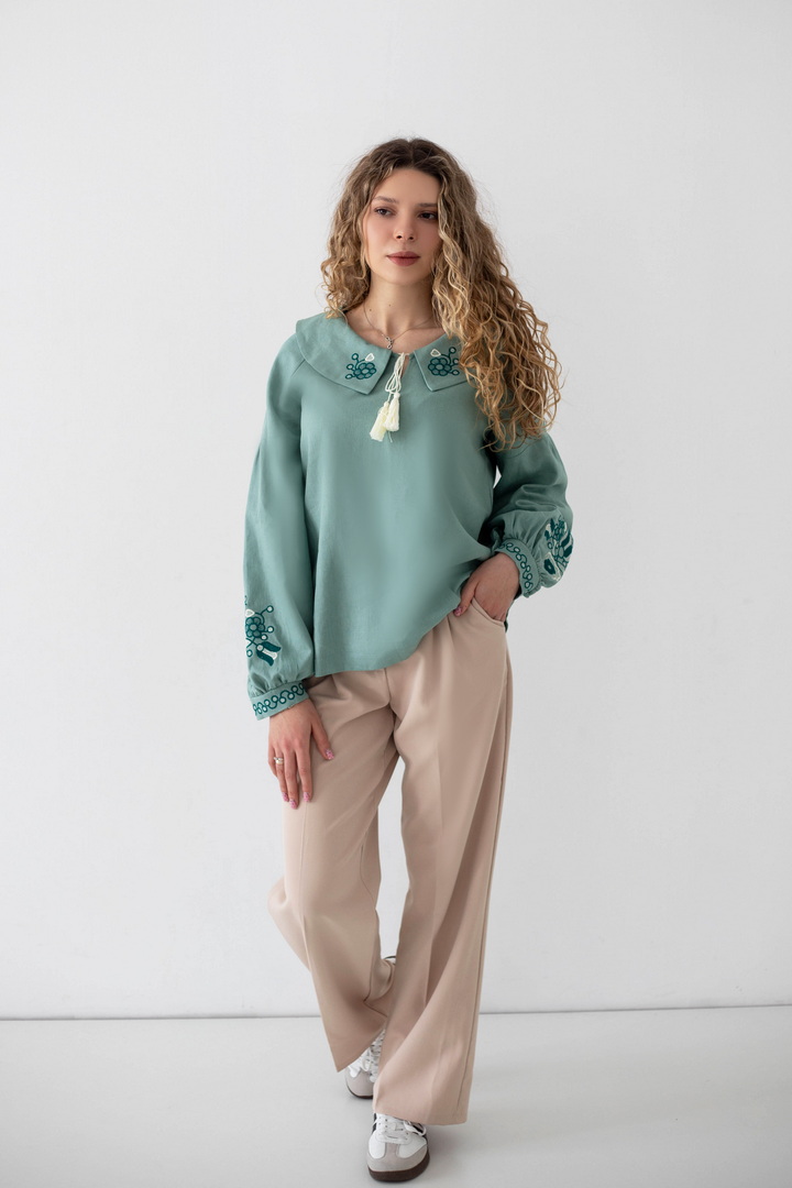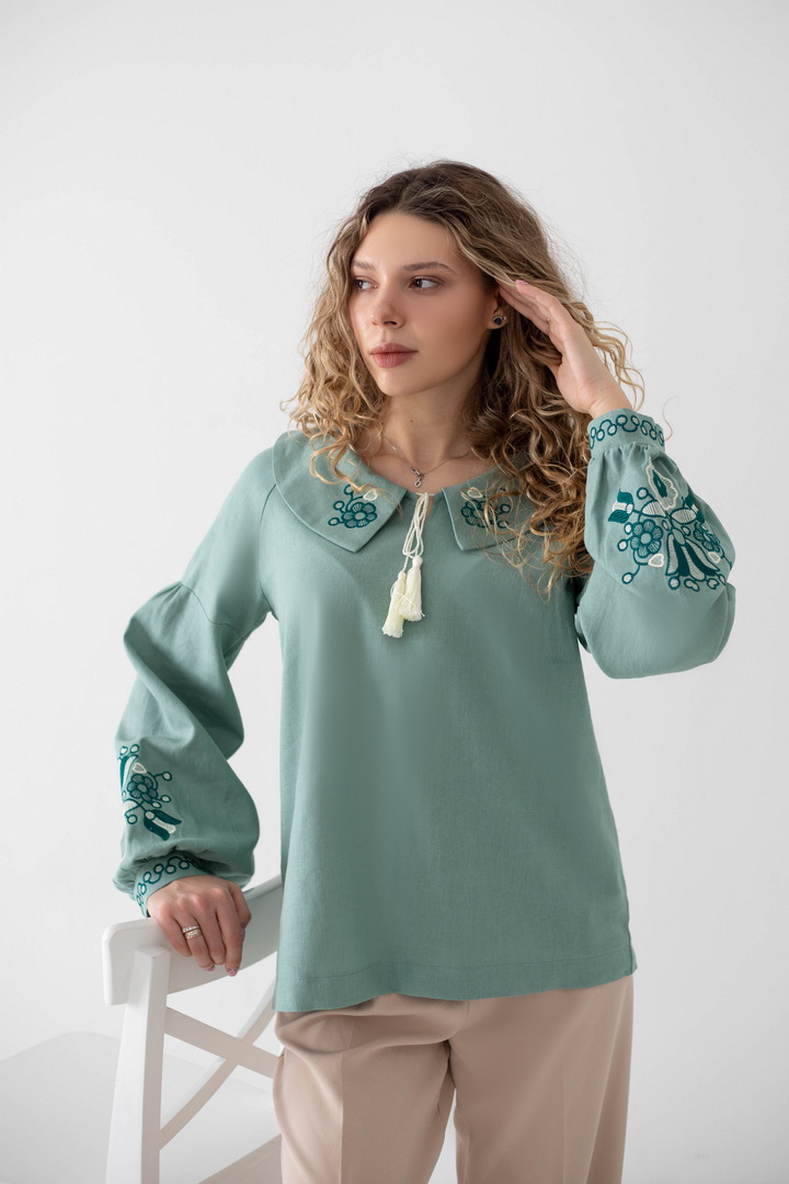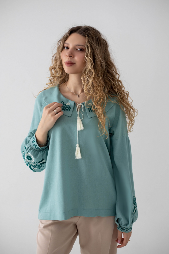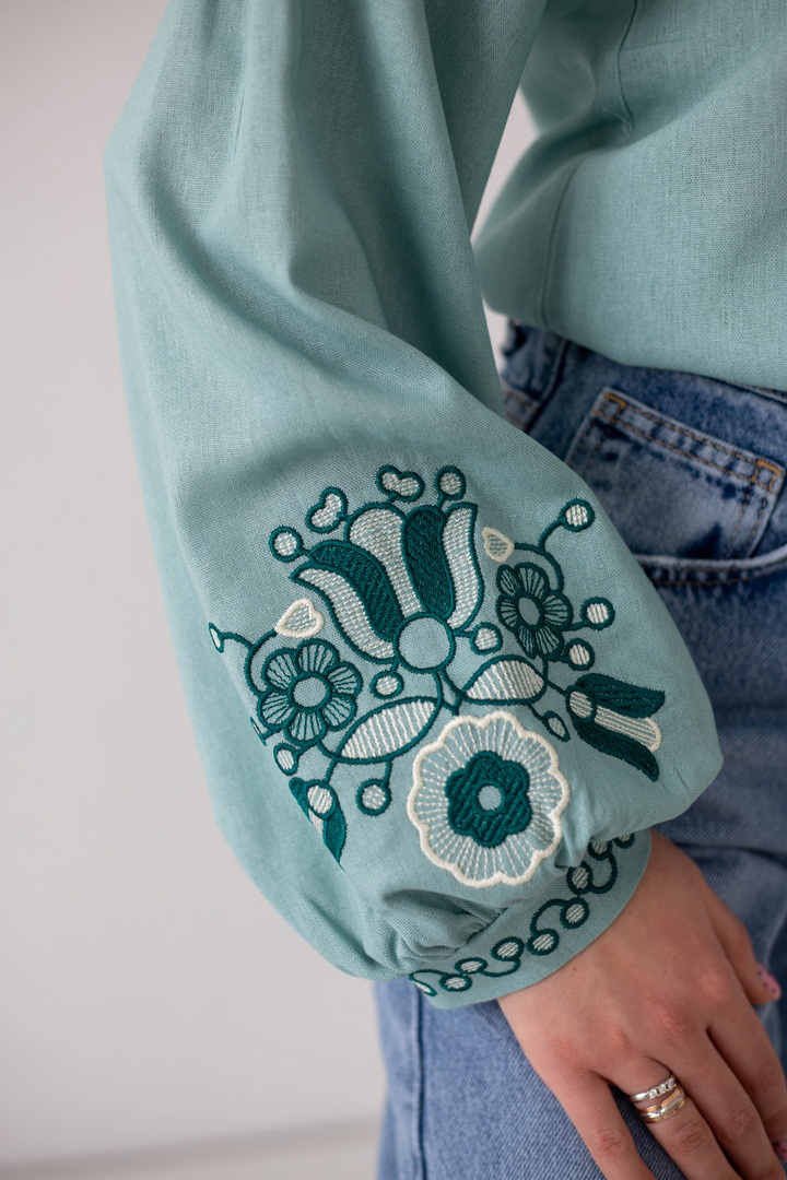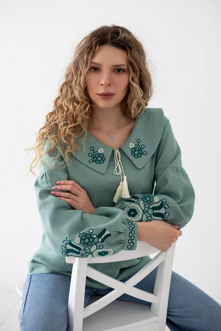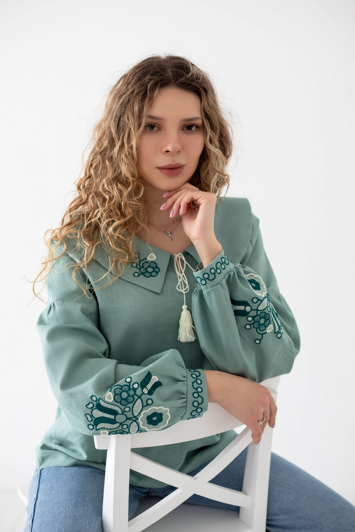 Ця жіноча вишиванка — втілення жіночності, спокою та глибокого українського змісту. Легка, дихаюча тканина дарує комфорт упродовж усього дня, а благородна фактура льону підкреслює натуральність виробу. Вишуканий вільний крій красиво лягає по фігурі і створює відчуття легкості. Акуратний округлий комір зі шнурівкою і декоративними китицями, додає образу ніжності та витонченості. Вишивка з флористичними мотивами на грудях і рукавах виглядає гармонійно та стильно, надаючи образу особливого характеру та національного шарму. Об’ємні рукава з м’якими манжетами, створюють сучасний силует і роблять вишиванку універсальною. Ця вишиванка — не просто одяг, а настрій, історія та любов до українських традицій у сучасному виконанні.