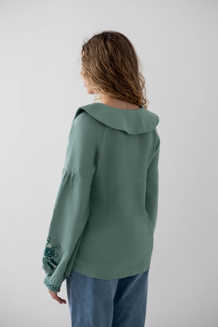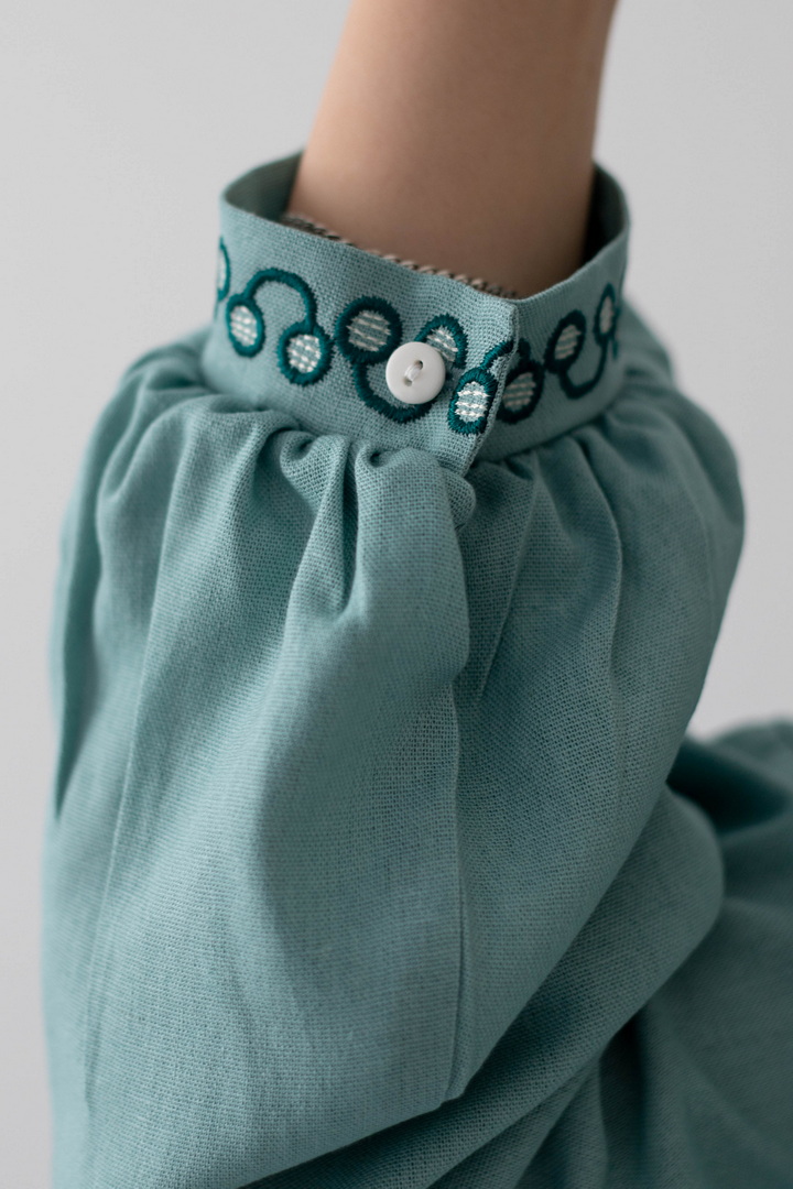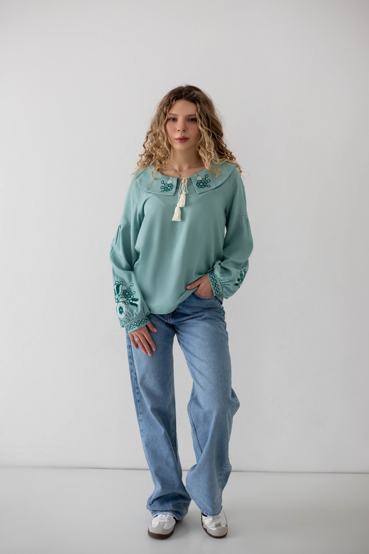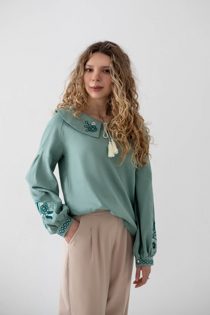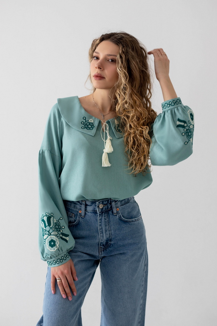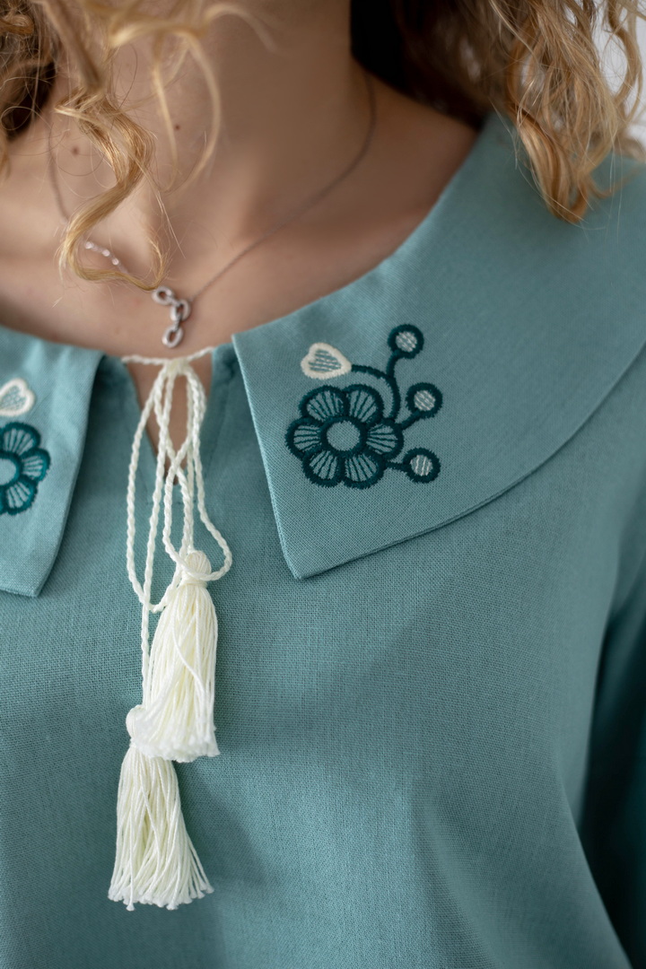 Ця жіноча вишиванка — втілення жіночності, спокою та глибокого українського змісту. Легка, дихаюча тканина дарує комфорт упродовж усього дня, а благородна фактура льону підкреслює натуральність виробу. Вишуканий вільний крій красиво лягає по фігурі і створює відчуття легкості. Акуратний округлий комір зі шнурівкою і декоративними китицями, додає образу ніжності та витонченості. Вишивка з флористичними мотивами на грудях і рукавах виглядає гармонійно та стильно, надаючи образу особливого характеру та національного шарму. Об’ємні рукава з м’якими манжетами, створюють сучасний силует і роблять вишиванку універсальною. Ця вишиванка — не просто одяг, а настрій, історія та любов до українських традицій у сучасному виконанні.