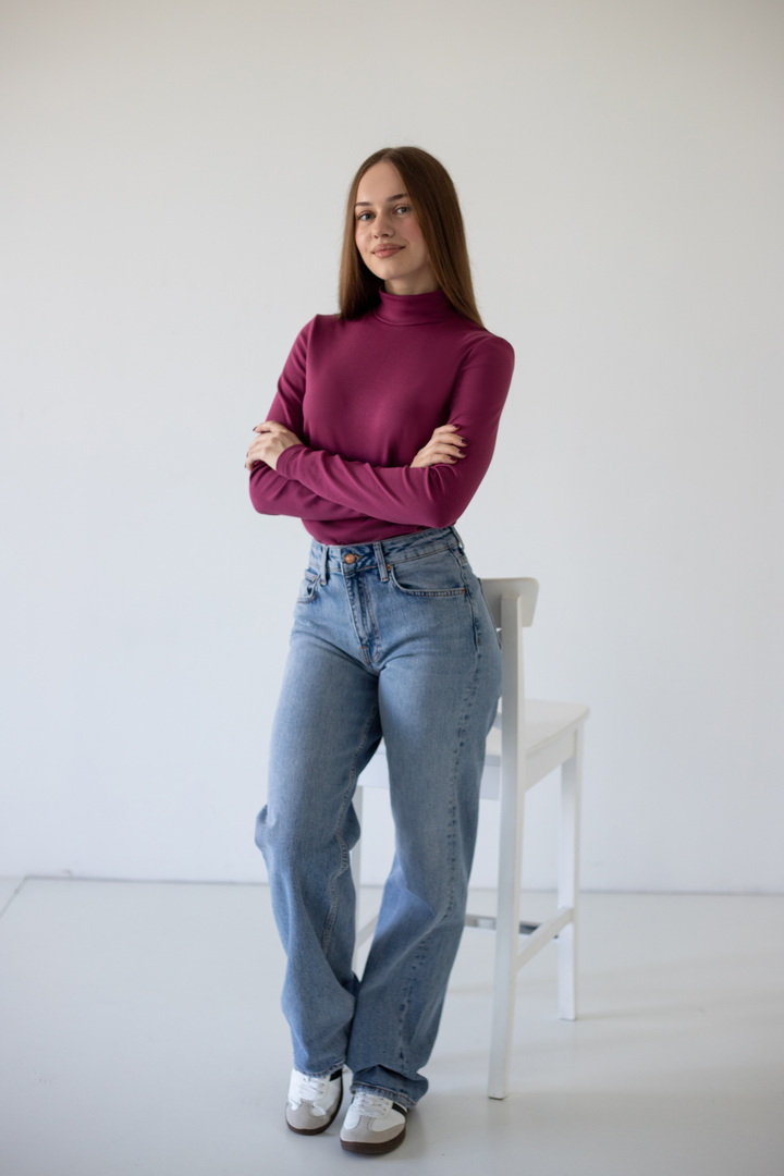 Параметри моделі: обхват грудей 80, талія 62, стегна 94, зріст 166 см. Розмір одягу 42. Водолазка розрахована на зріст 166 см.