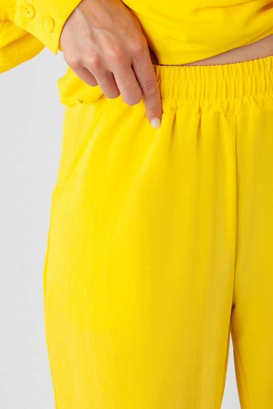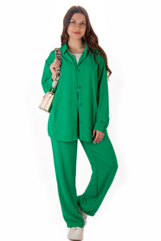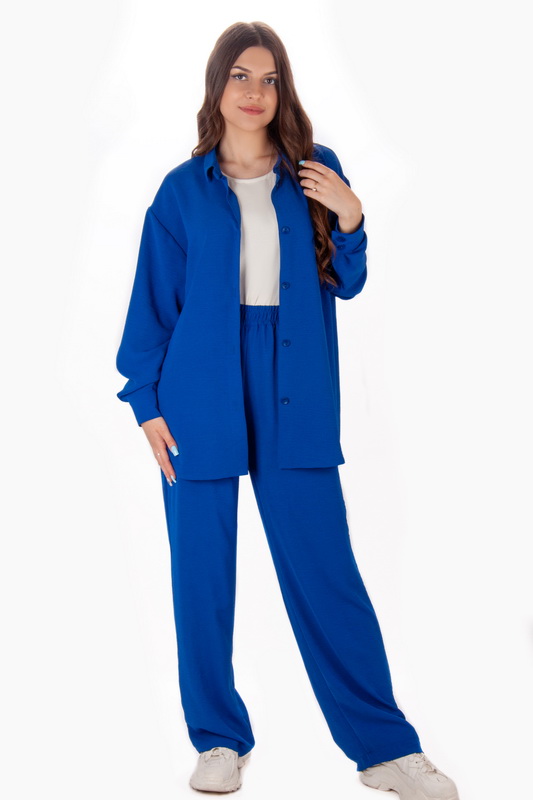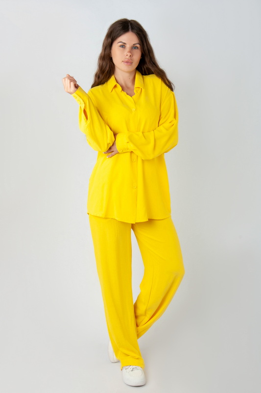 Стильний та яскравий костюм для жінок, виконаний з легкого, повітрянного полотна "Американський креп". Модель складається з сорочки, в стилі "Оversize" та штанів "Палаццо". Штани мають бокові кишені та шнурок в поясі, сорочка застібається на гудзики. Такий комплект дуже актуальний цього літа, представлений в широкій палітрі кольорів, від базового чорного до яскравого малинового, його легко поєднувати з будь-яким взуттям - кросівки, босоніжки, лофери. Щоб довершити образ, можна одягнути під розстібнуту сорочку однотонну майку, футболку або топ.