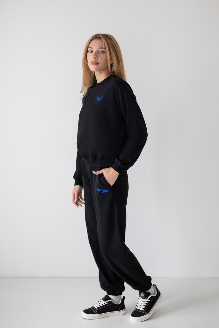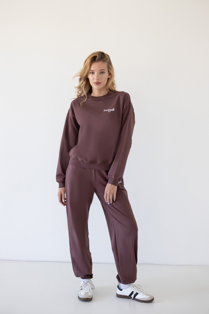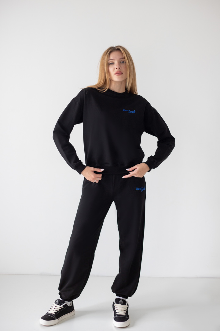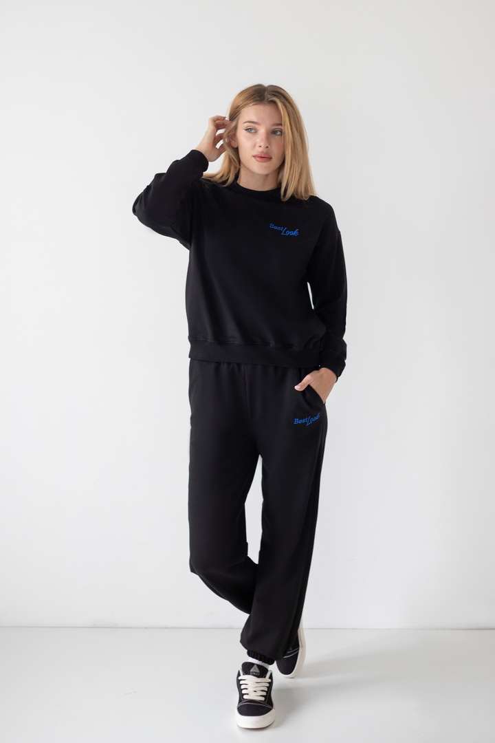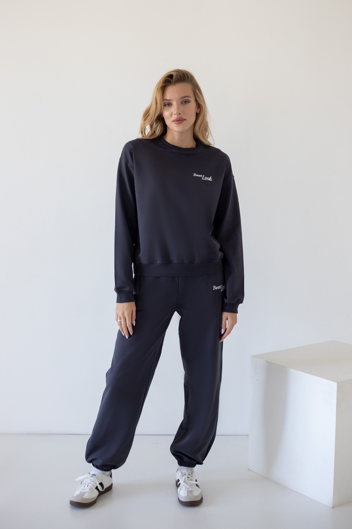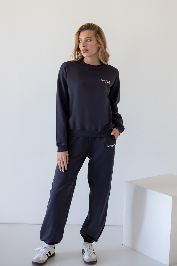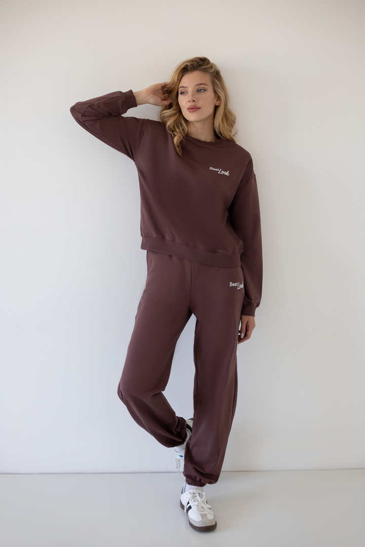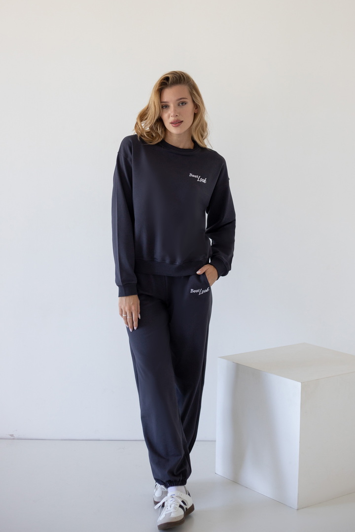 Жіночий спортивний костюм складається зі світшота та штанів. Світшот вільного крою з довгим рукавом, круглою горловиною та манжетами на рукавах і внизу виробу. Декорований невеликим написом на грудях. Штани прямого силуету з еластичним поясом та гумою на штанинах, мають аналогічний напис на боці. Матеріал м’який, приємний до тіла, ідеально підходить для щоденного носіння, відпочинку або активного проведення часу.