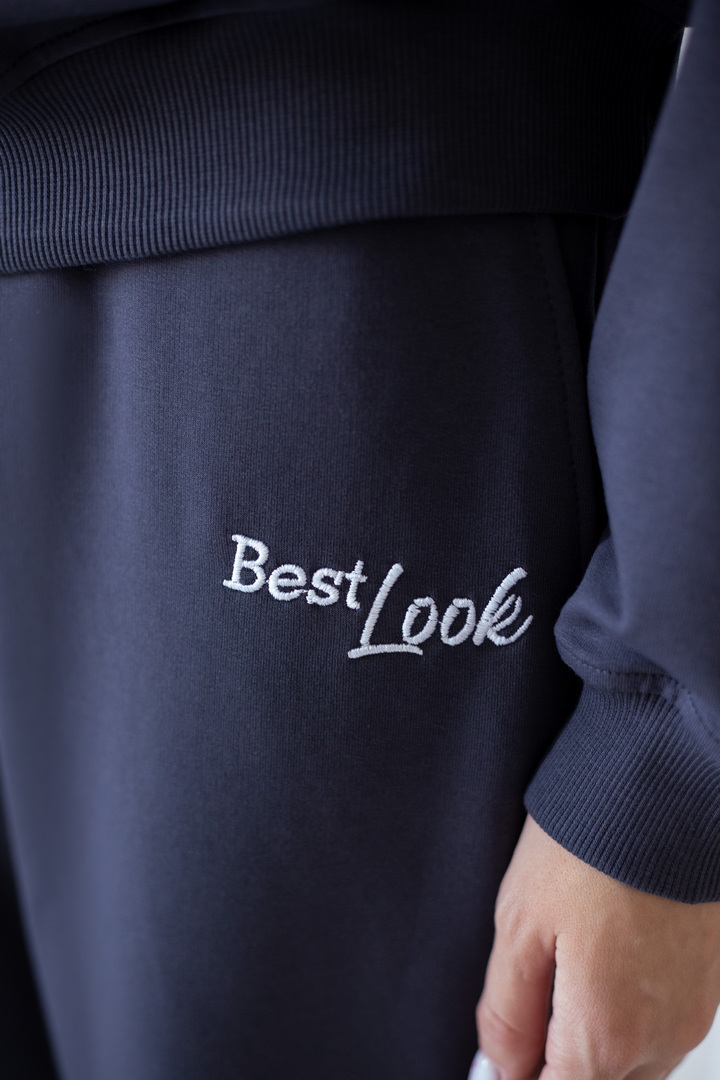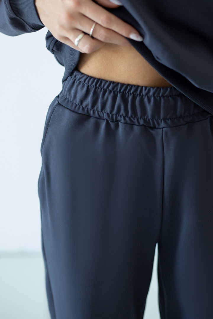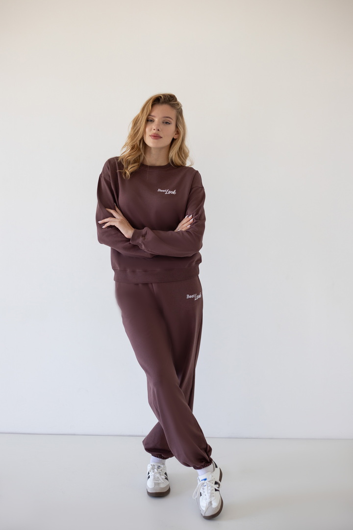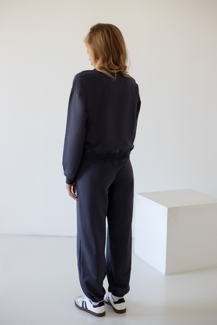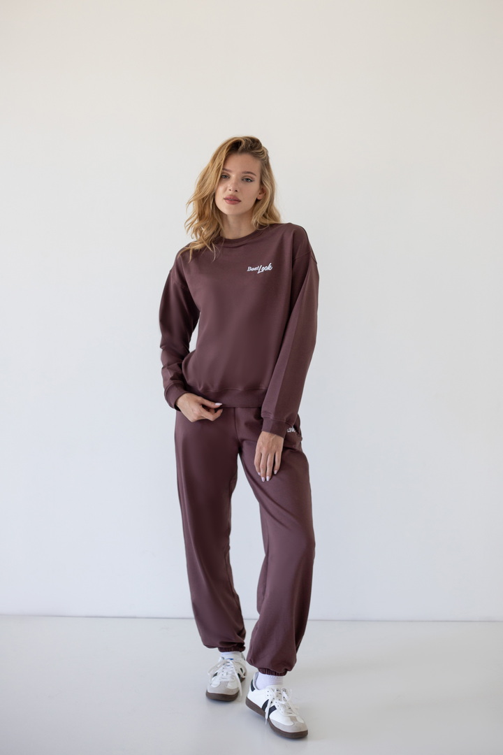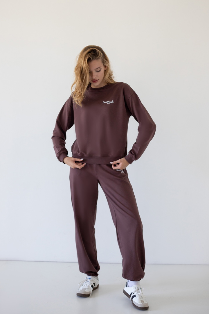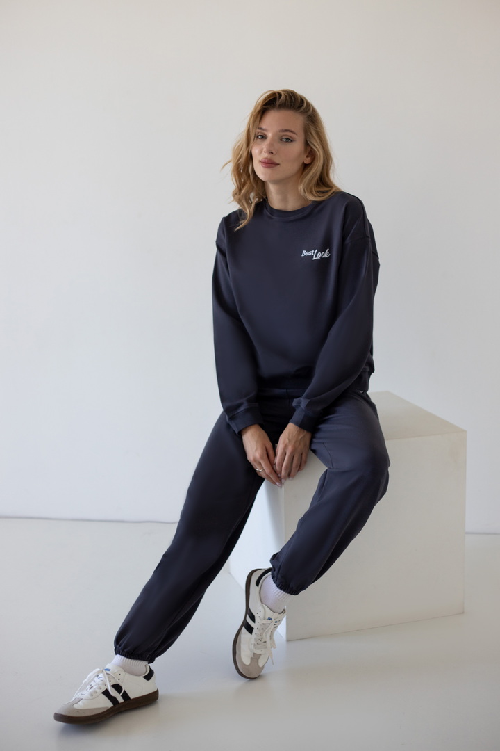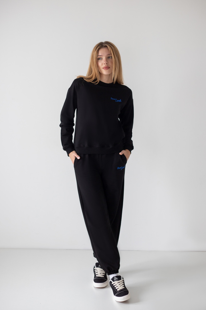 Жіночий спортивний костюм складається зі світшота та штанів. Світшот вільного крою з довгим рукавом, круглою горловиною та манжетами на рукавах і внизу виробу. Декорований невеликим написом на грудях. Штани прямого силуету з еластичним поясом та гумою на штанинах, мають аналогічний напис на боці. Матеріал м’який, приємний до тіла, ідеально підходить для щоденного носіння, відпочинку або активного проведення часу.