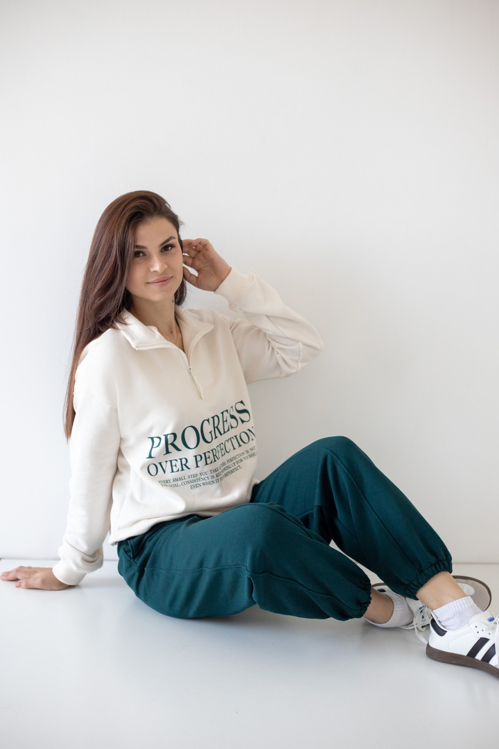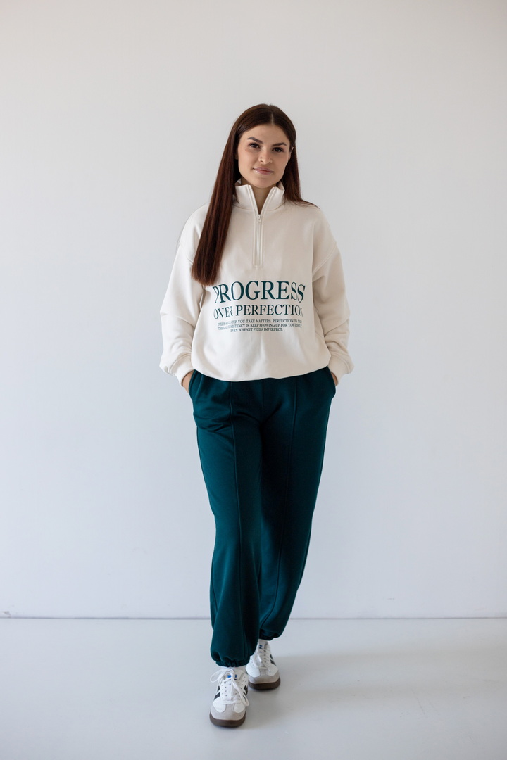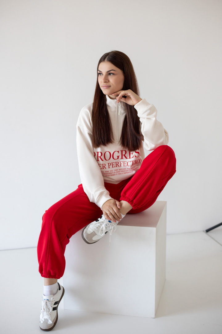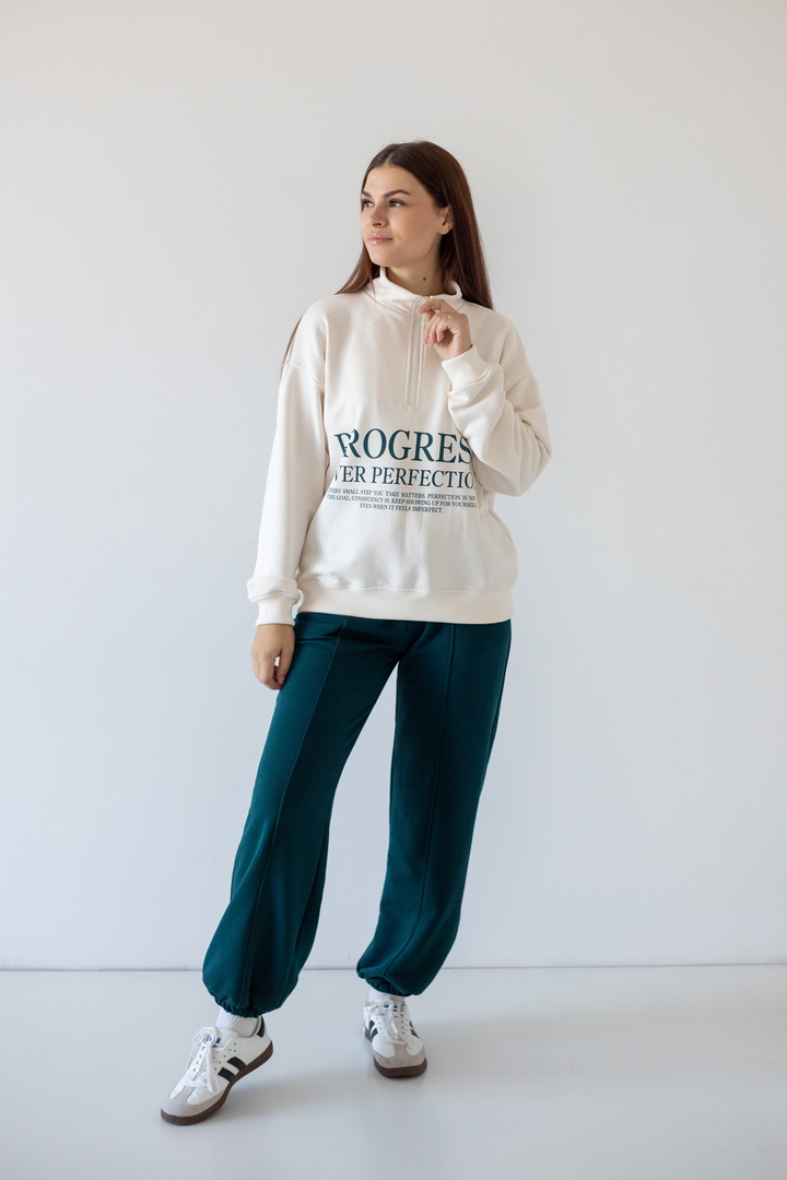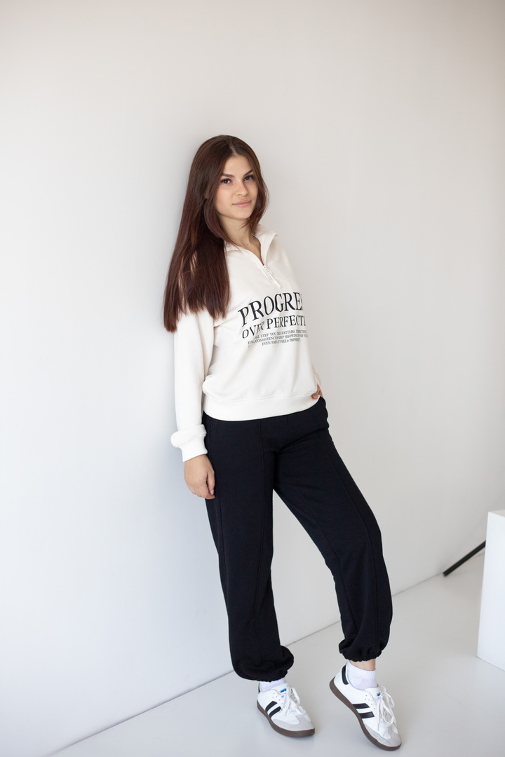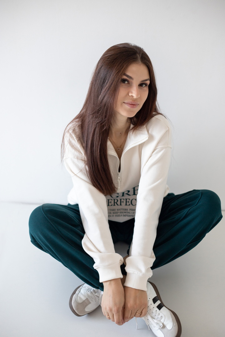 Жіночий спортивний костюм, що поєднує стиль і комфорт. У комплект входить худі з високим коміром на короткій блискавці та принтом на грудях. М’яка тканина забезпечує приємні тактильні відчуття та зручність у щоденному носінні. Брюки прямого крою з еластичними манжетами на щиколотках створюють сучасний і спортивний силует. Ідеальний варіант для прогулянок, відпочинку чи активного способу життя.