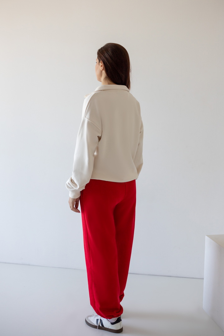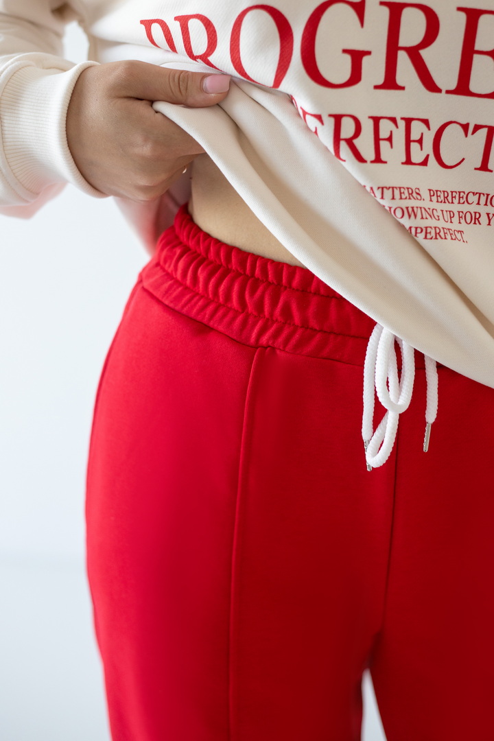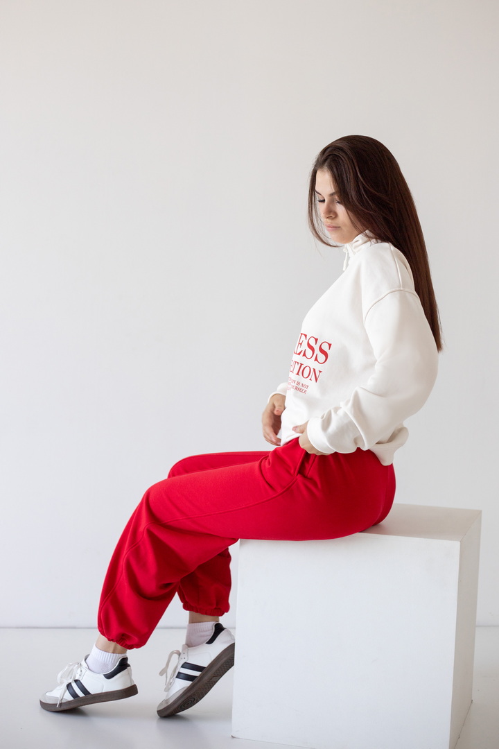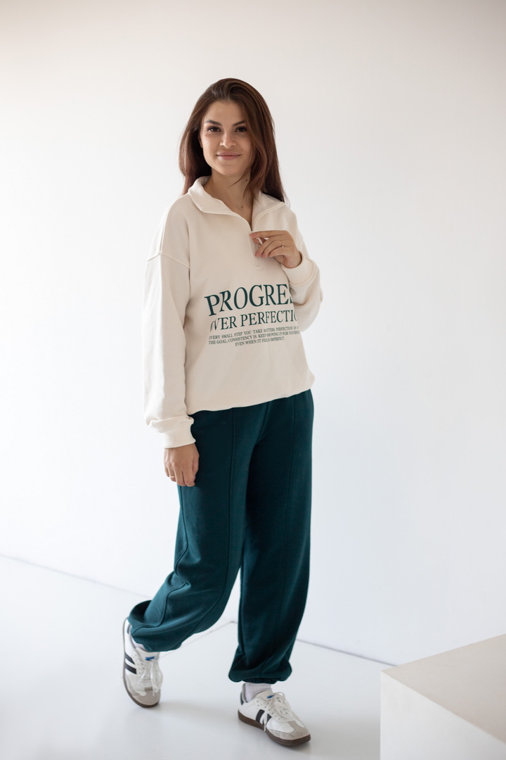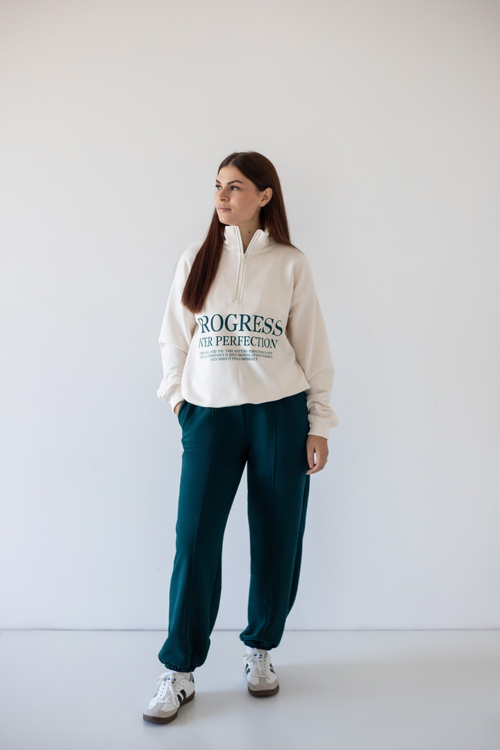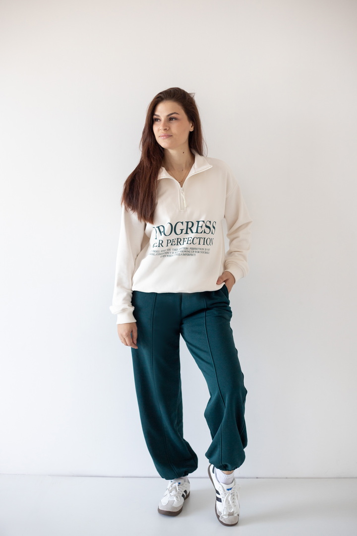 Жіночий спортивний костюм, що поєднує стиль і комфорт. У комплект входить худі з високим коміром на короткій блискавці та принтом на грудях. М’яка тканина забезпечує приємні тактильні відчуття та зручність у щоденному носінні. Брюки прямого крою з еластичними манжетами на щиколотках створюють сучасний і спортивний силует. Ідеальний варіант для прогулянок, відпочинку чи активного способу життя.