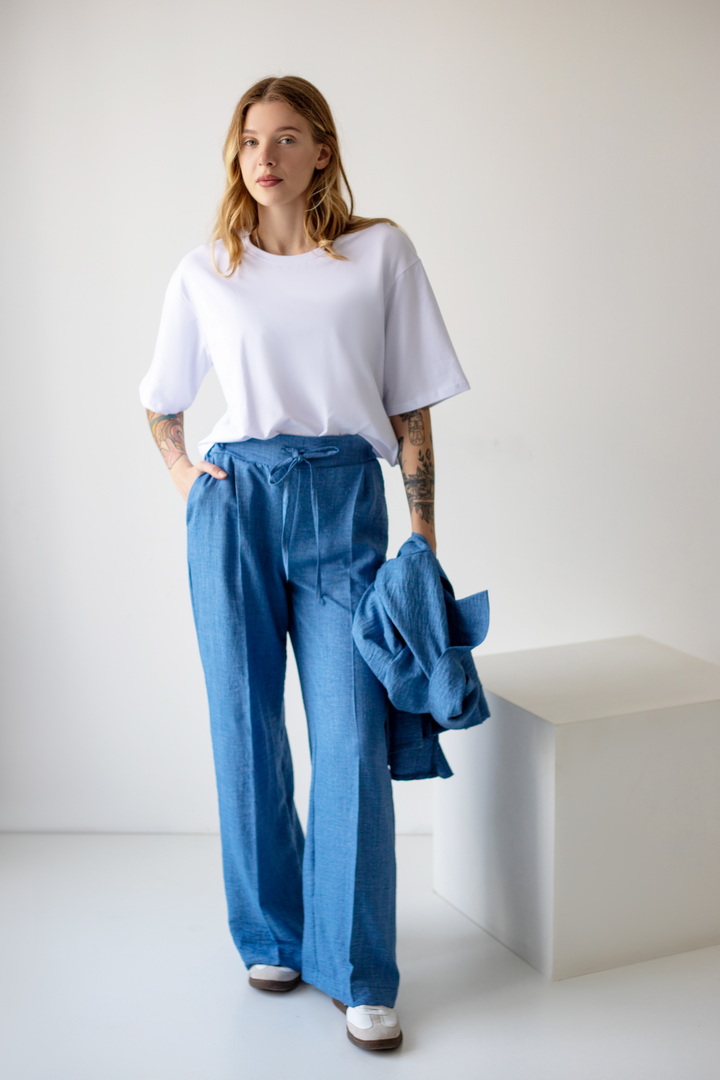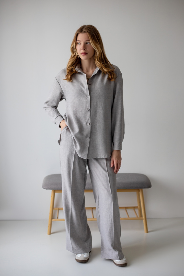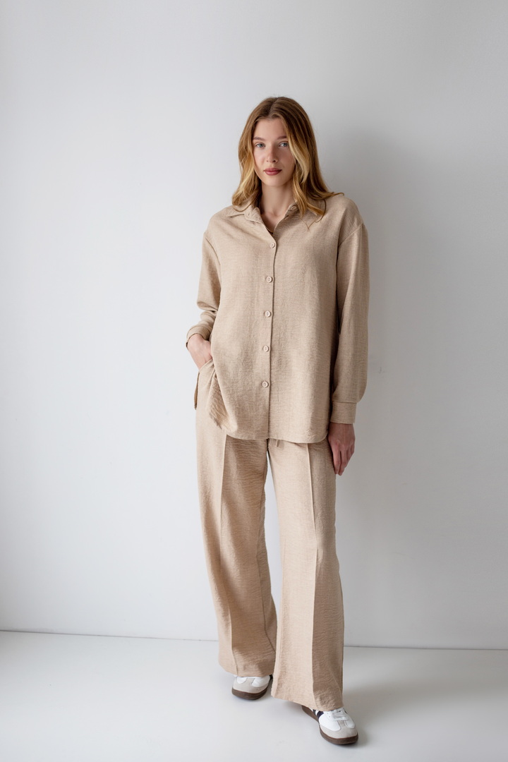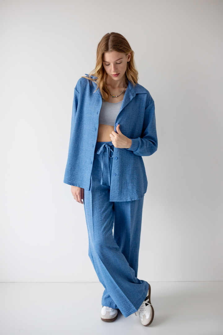 Стильний костюм для жінок виконаний з легкого повітряного полотна "Льон-жатка". Модель складається з сорочки, в стилі "Оversize" та штанів "Палаццо". Штани мають бічні кишені та шнурок у поясі, сорочка застібається на гудзики. Такий комплект дуже актуальний цієї весни та літа, його легко поєднувати з будь-яким взуттям – кросівки, босоніжки, лофери. Щоб удосконалити образ, можна одягнути під розстебнуту сорочку однотонну майку, футболку чи топ.