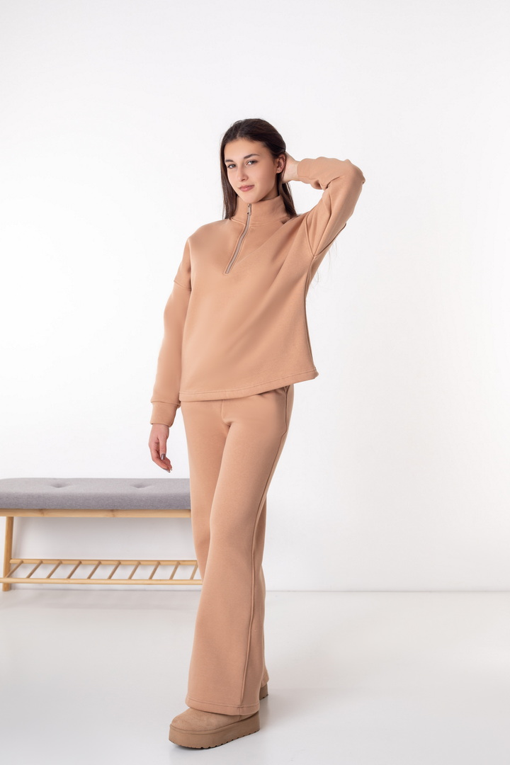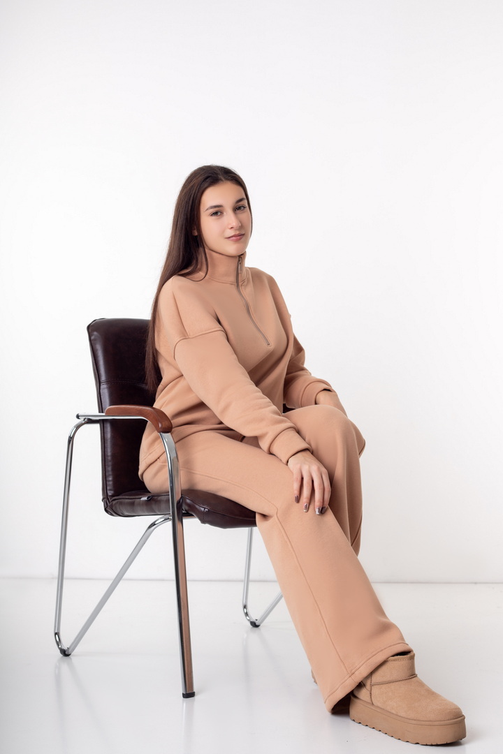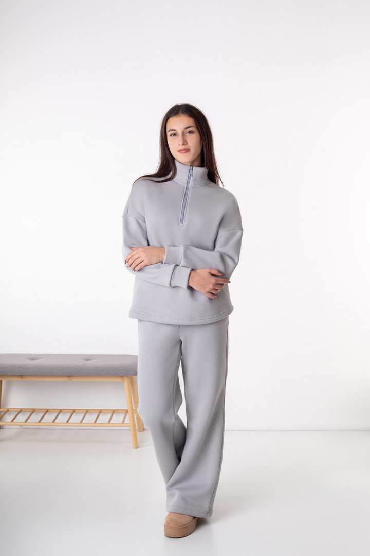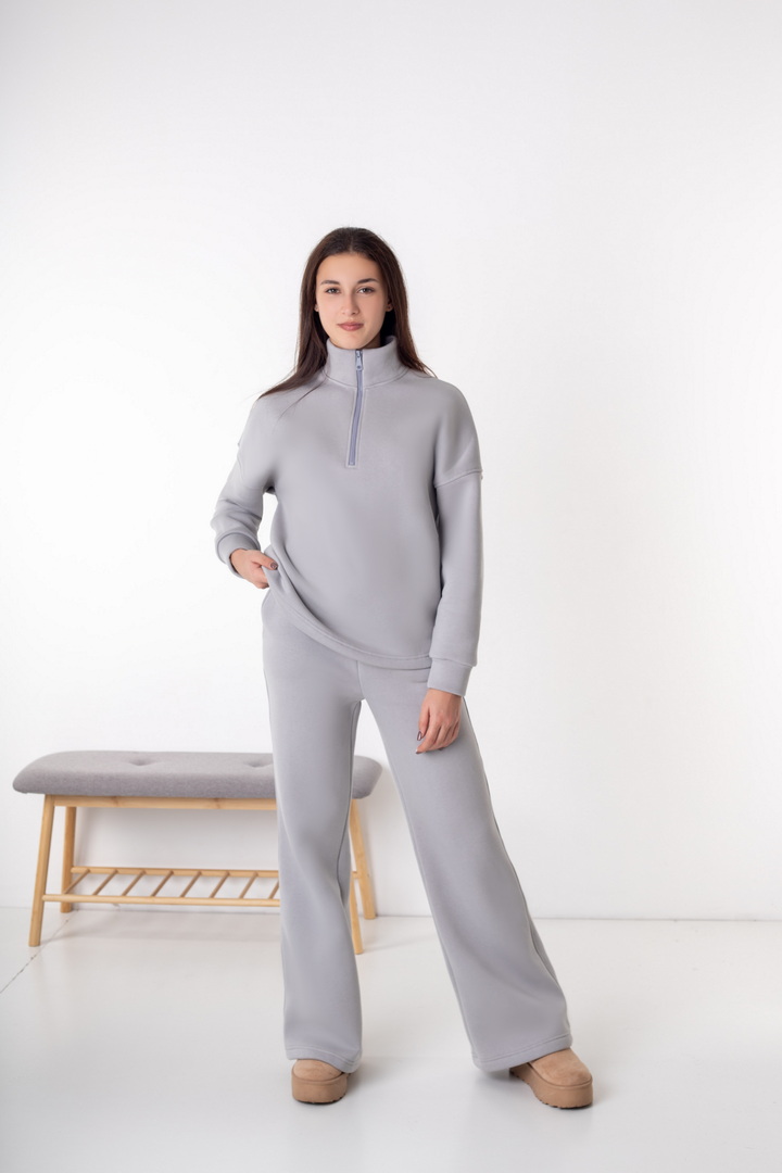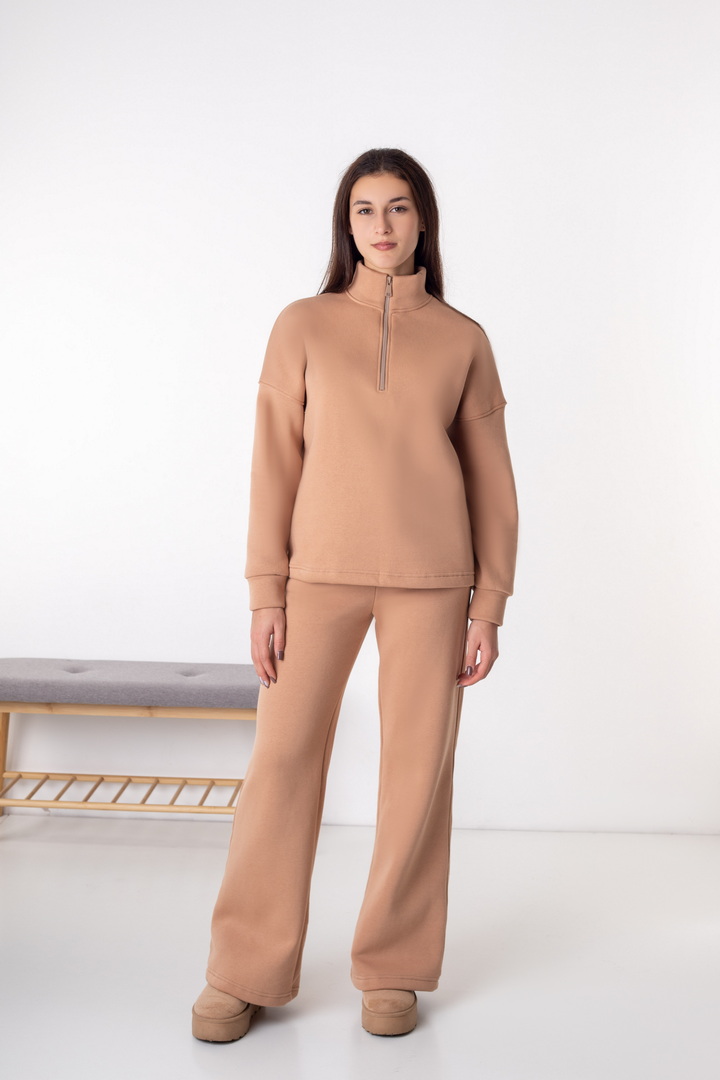 Жіночий костюм із триниткового футера з начосом — ідеальний варіант для прохолодної пори року. Модель складається зі зручного світшота та штанів, виконаних у стилі комфортної повсякденності. Кофта має вільний крій, опущену лінію плеча та комір-стійку з функціональною блискавкою, що дозволяє регулювати глибину вирізу та забезпечує додатковий комфорт. Рукава на манжетах додають зручності та зберігають тепло. Штани прямого, злегка розкльошеного крою, з еластичним поясом і комфортною посадкою. Щільна, м’яка та тепла тканина гарантує максимальний комфорт і приємні тактильні відчуття.