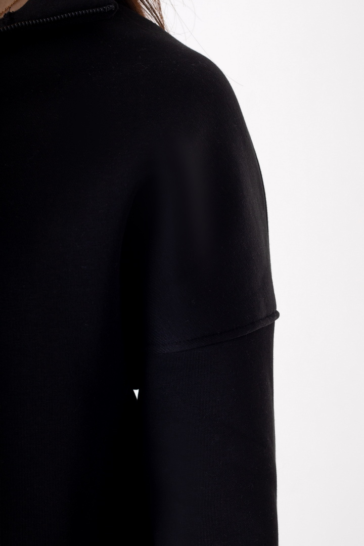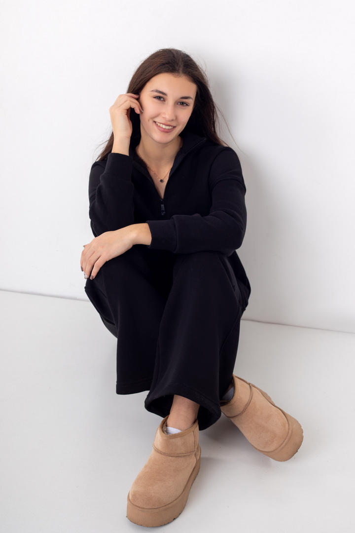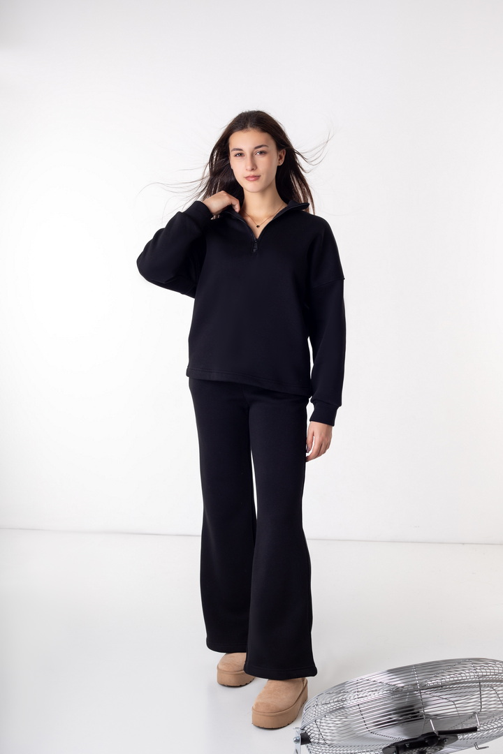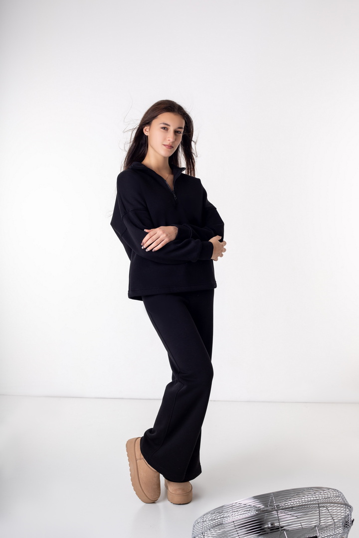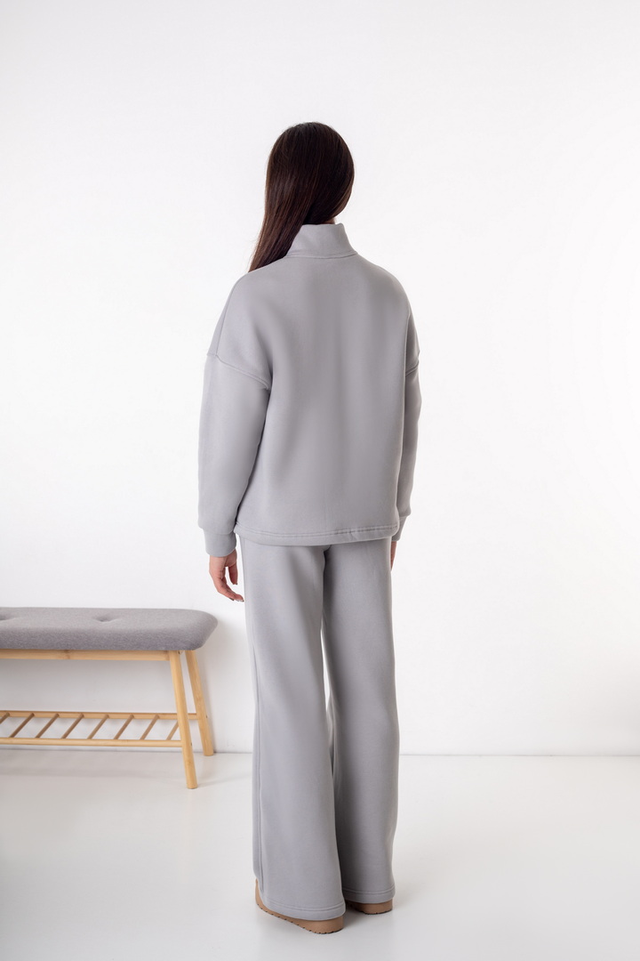 Жіночий костюм із триниткового футера з начосом — ідеальний варіант для прохолодної пори року. Модель складається зі зручного світшота та штанів, виконаних у стилі комфортної повсякденності. Кофта має вільний крій, опущену лінію плеча та комір-стійку з функціональною блискавкою, що дозволяє регулювати глибину вирізу та забезпечує додатковий комфорт. Рукава на манжетах додають зручності та зберігають тепло. Штани прямого, злегка розкльошеного крою, з еластичним поясом і комфортною посадкою. Щільна, м’яка та тепла тканина гарантує максимальний комфорт і приємні тактильні відчуття.