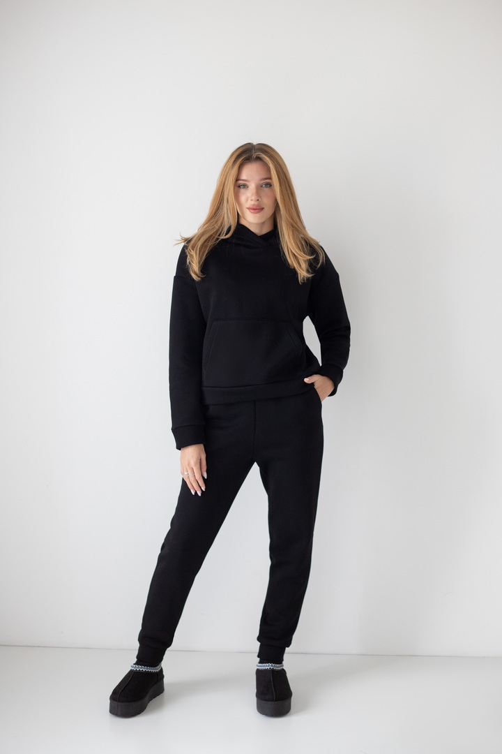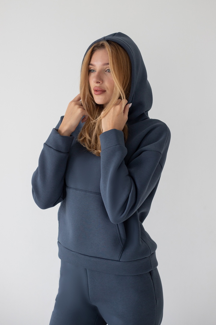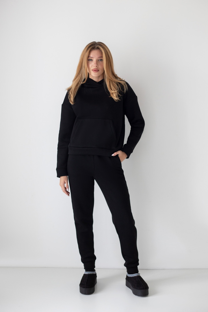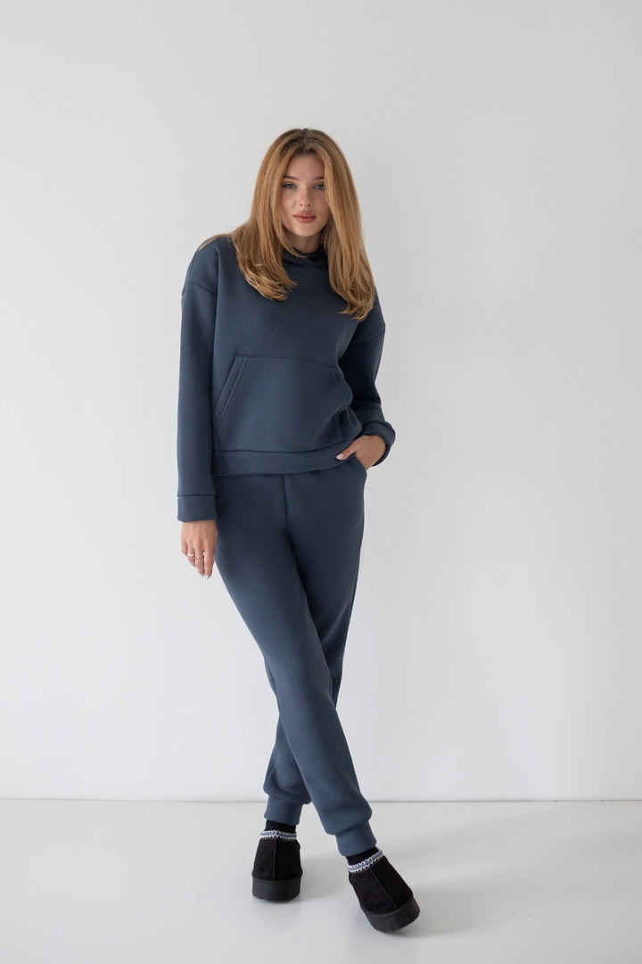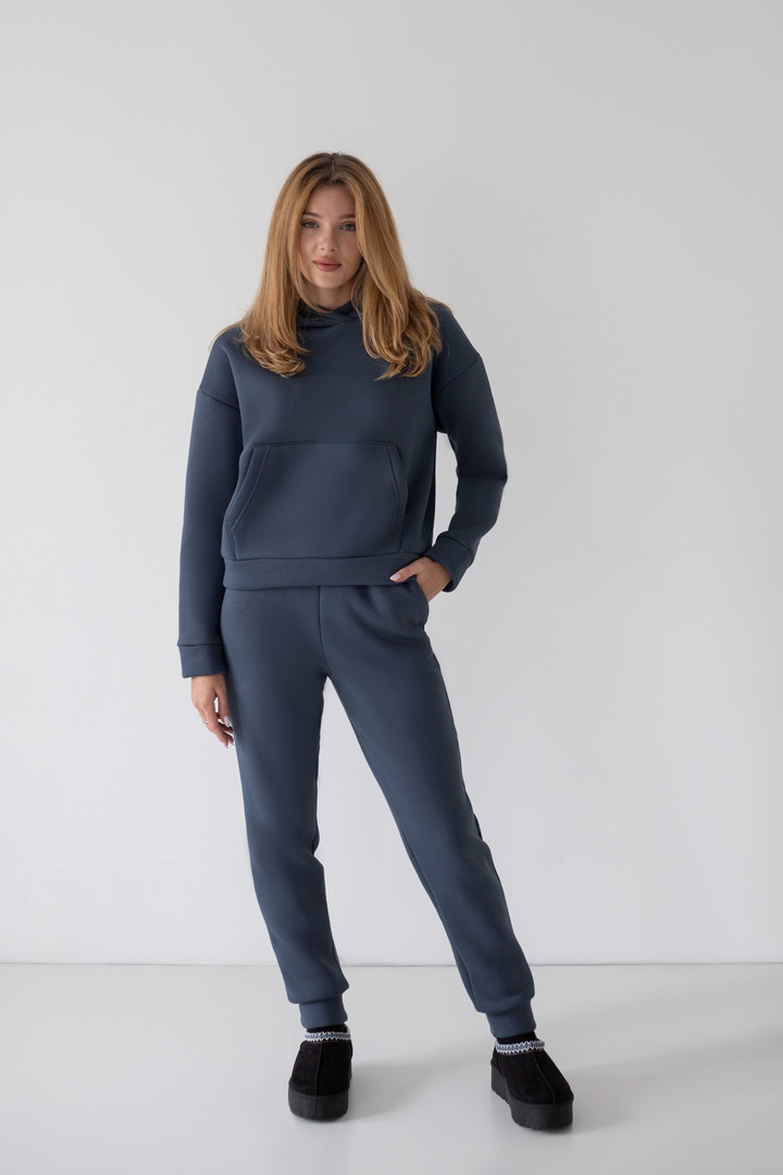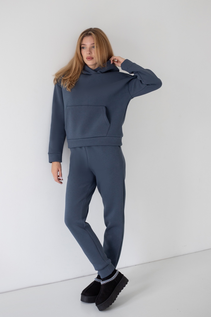 Жіночий спортивний костюм складається з худі прямого крою з довгим рукавом і великою кишенею-кенгуру, а також зручних штанів на резинці з манжетами. Тканина щільна, м’яка та приємна до тіла, забезпечує комфорт під час носіння. Ідеальний варіант як для активного відпочинку, так і для повсякденних образів.
