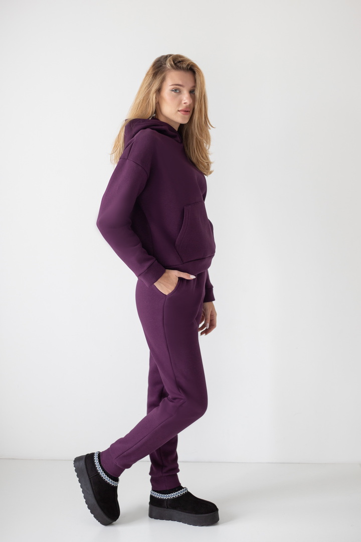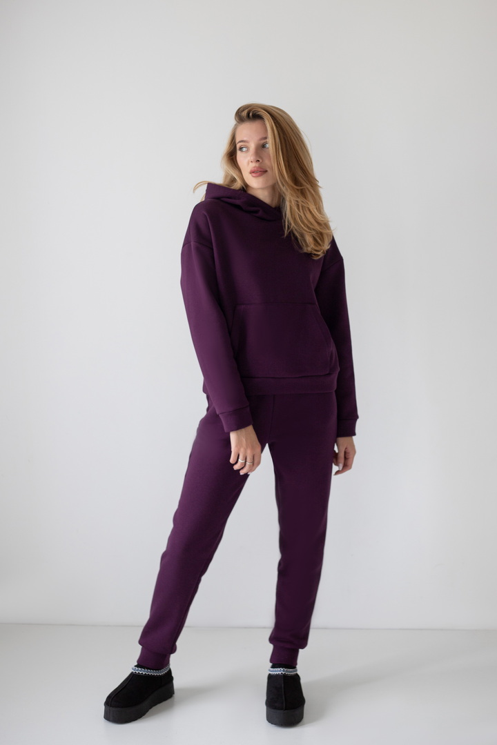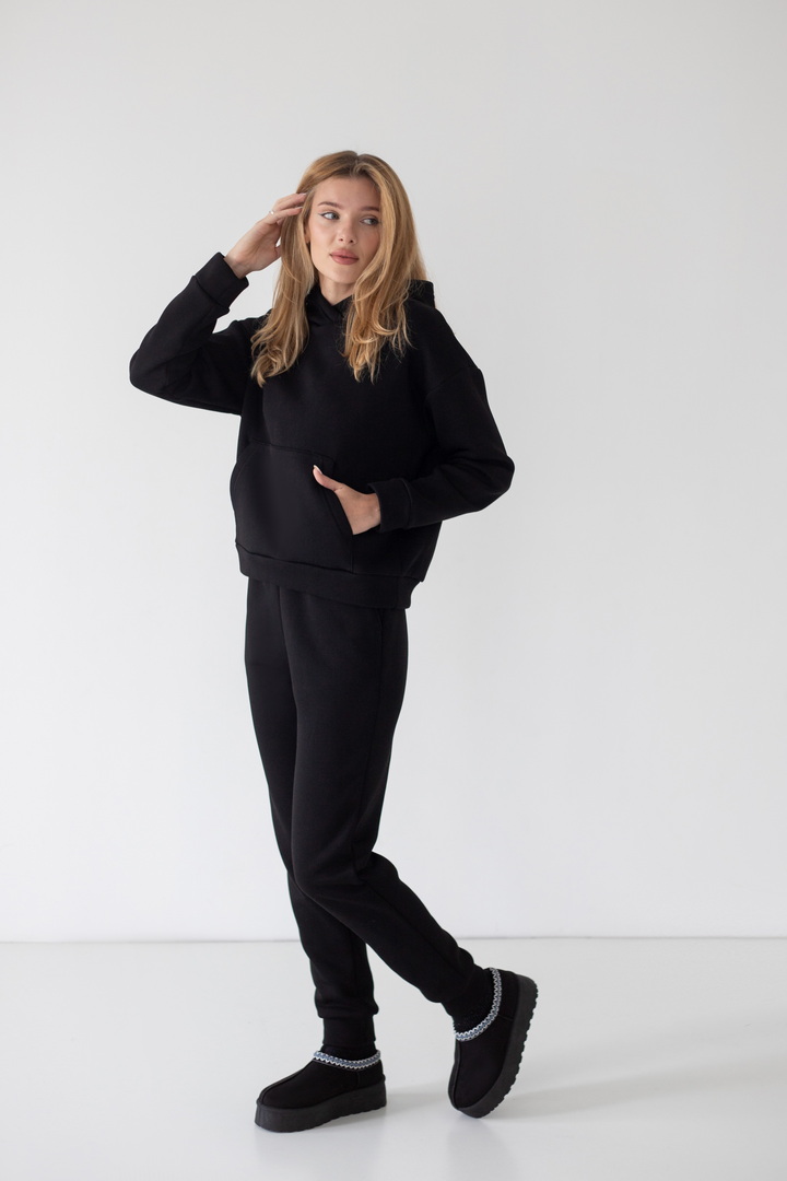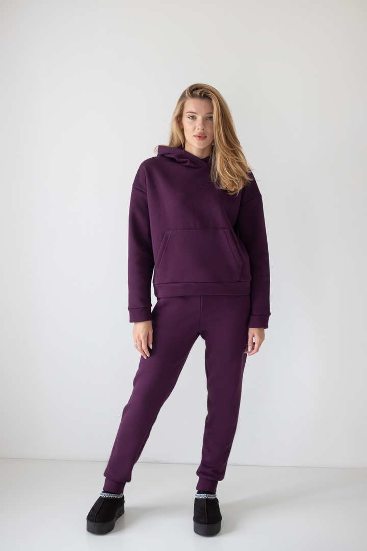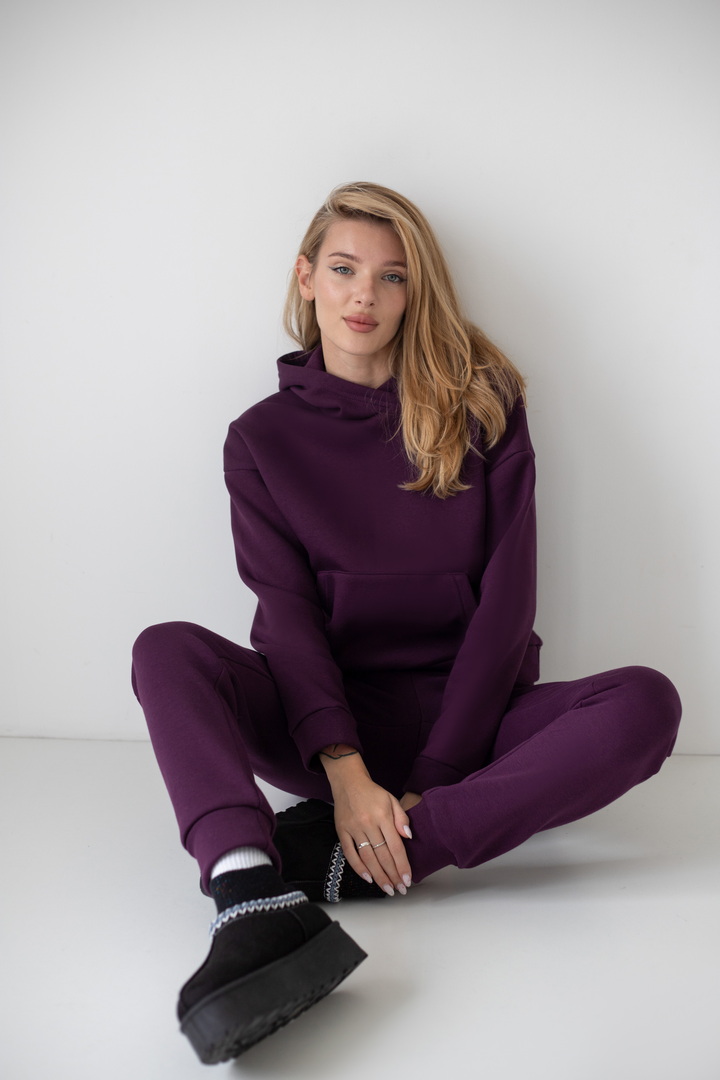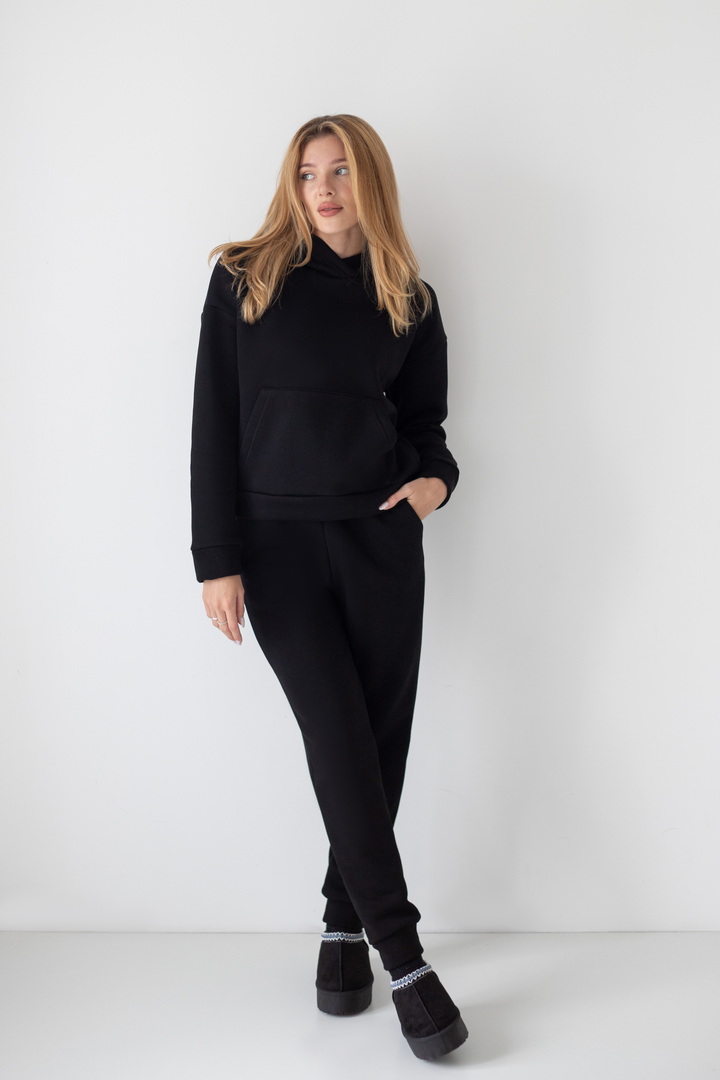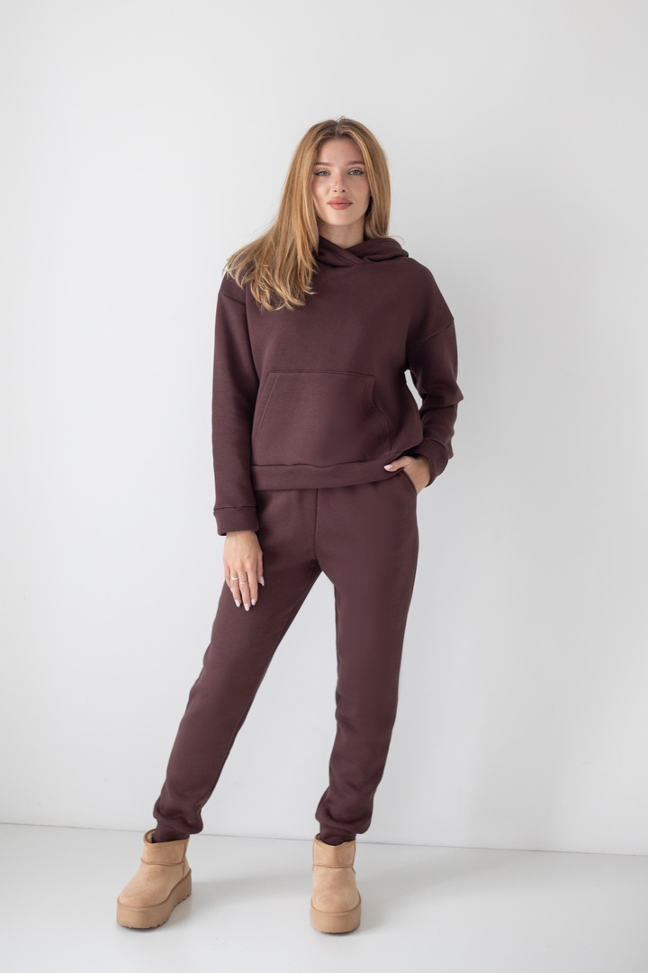 Жіночий спортивний костюм складається з худі прямого крою з довгим рукавом і великою кишенею-кенгуру, а також зручних штанів на резинці з манжетами. Тканина щільна, м’яка та приємна до тіла, забезпечує комфорт під час носіння. Ідеальний варіант як для активного відпочинку, так і для повсякденних образів.