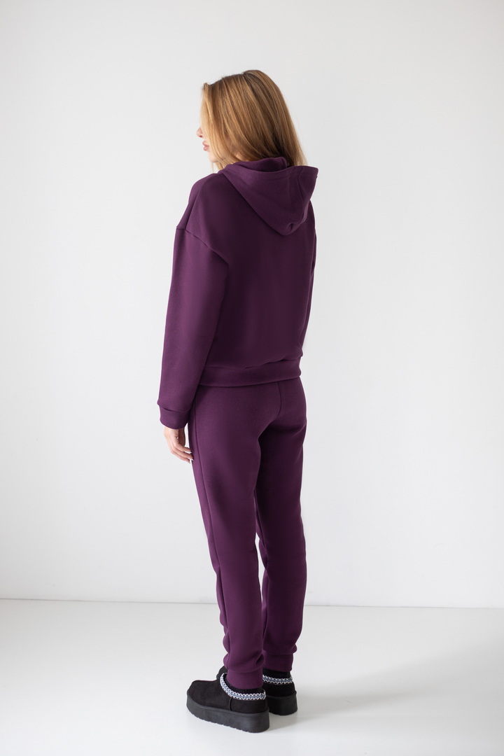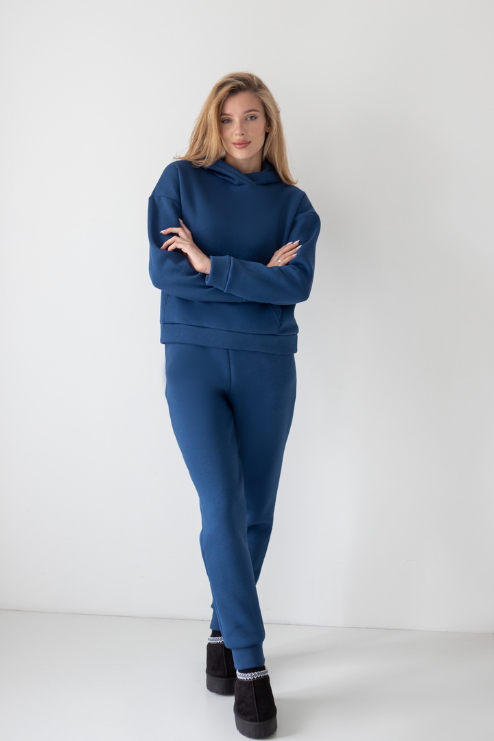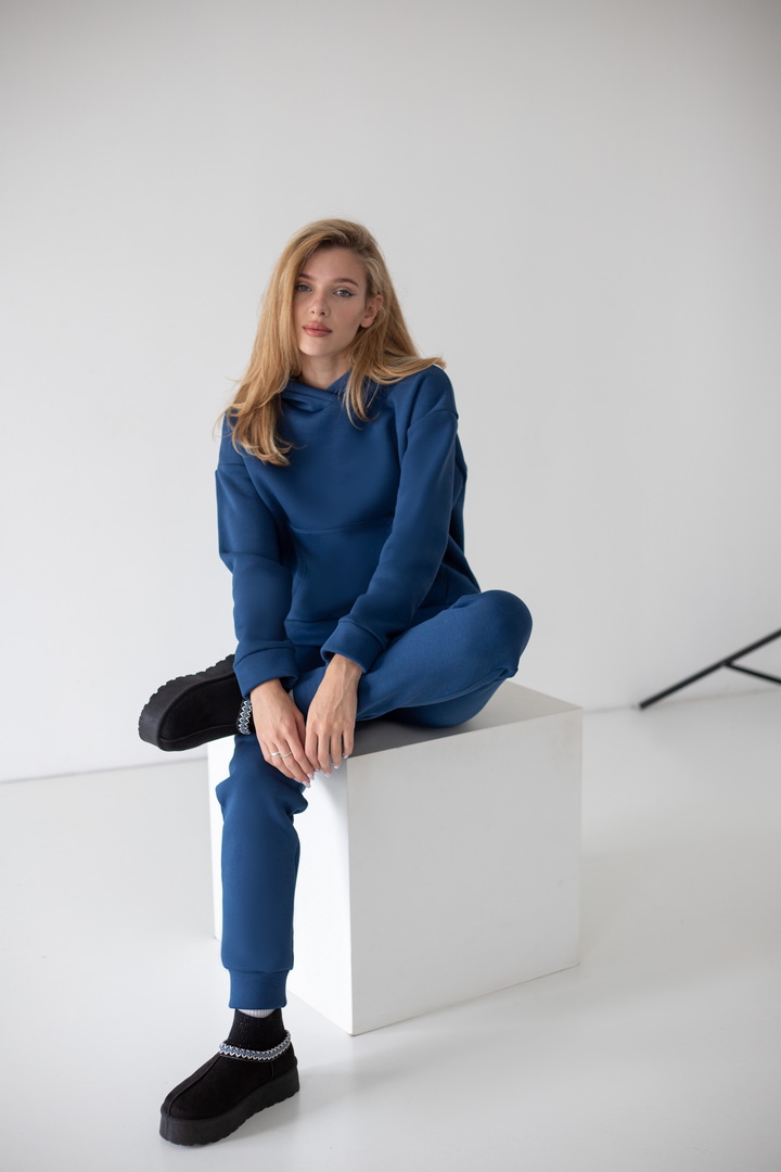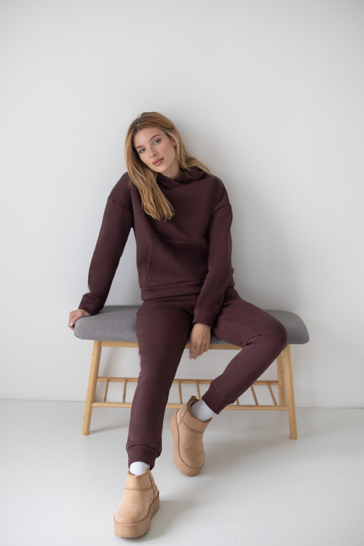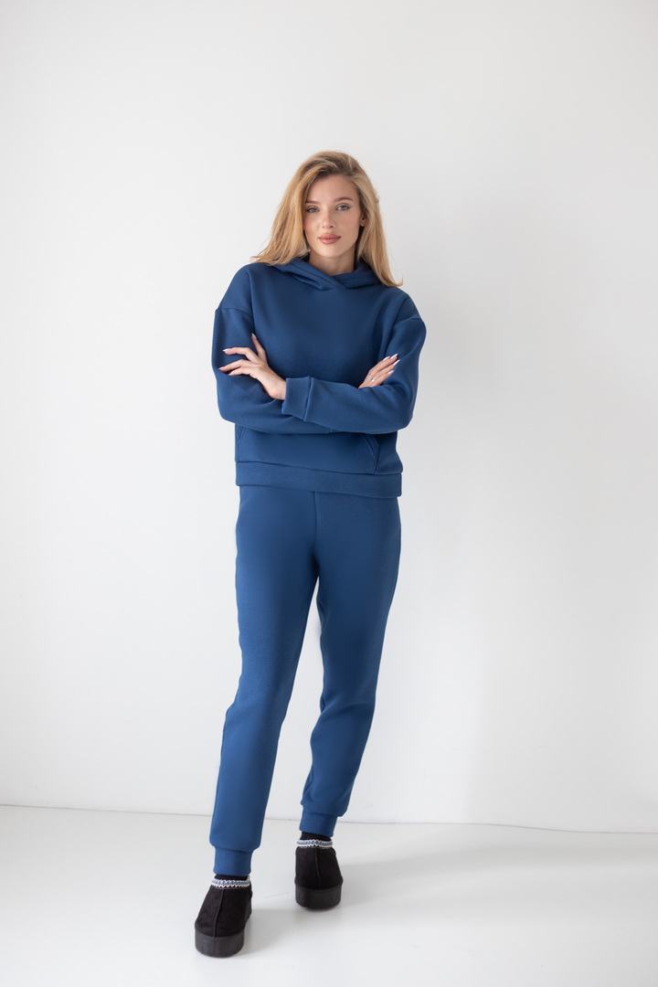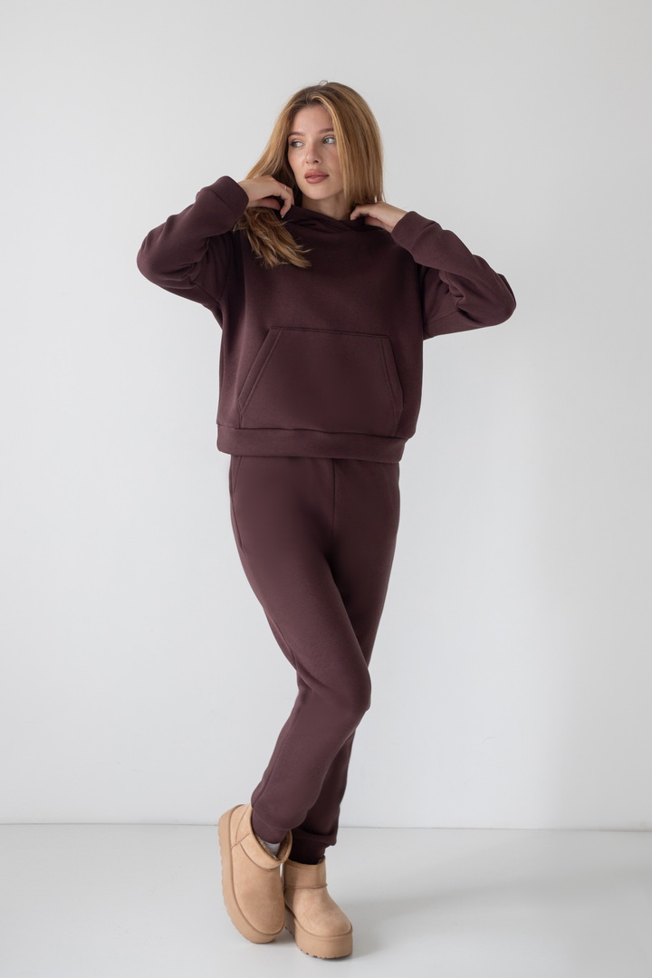 Жіночий спортивний костюм складається з худі прямого крою з довгим рукавом і великою кишенею-кенгуру, а також зручних штанів на резинці з манжетами. Тканина щільна, м’яка та приємна до тіла, забезпечує комфорт під час носіння. Ідеальний варіант як для активного відпочинку, так і для повсякденних образів.