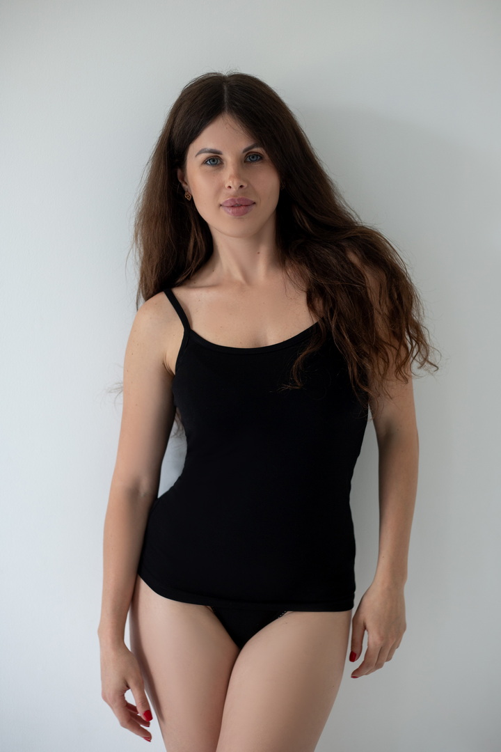 Базовий жіночий топ на тонких бретельках з стрейч-куліру пеньє. Модель представлена в базовому кольорі, може використовуватися як нижня білизна, так і в якості літнього універсального топа з будь-якими штанами, джинсами, спідницями, кардиганами. Полотно відмінної якості, не линяє, не витягується, не дає усадку після прання.