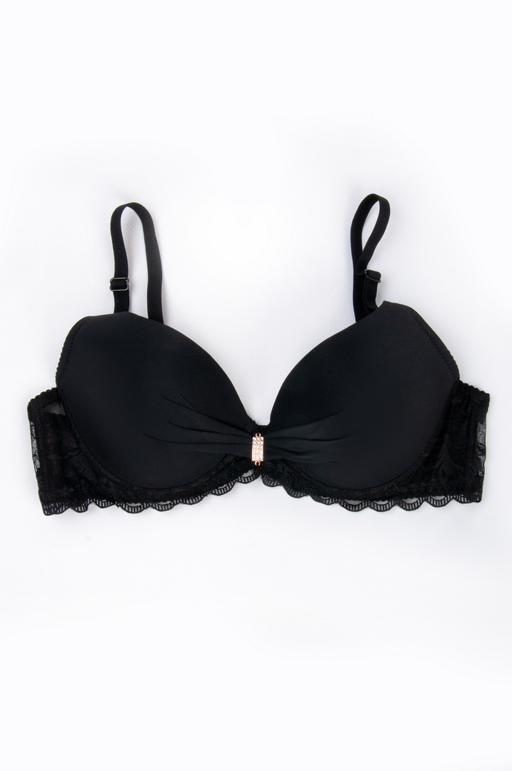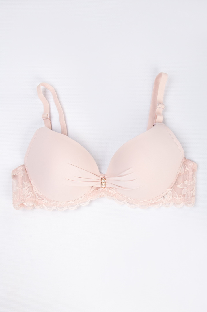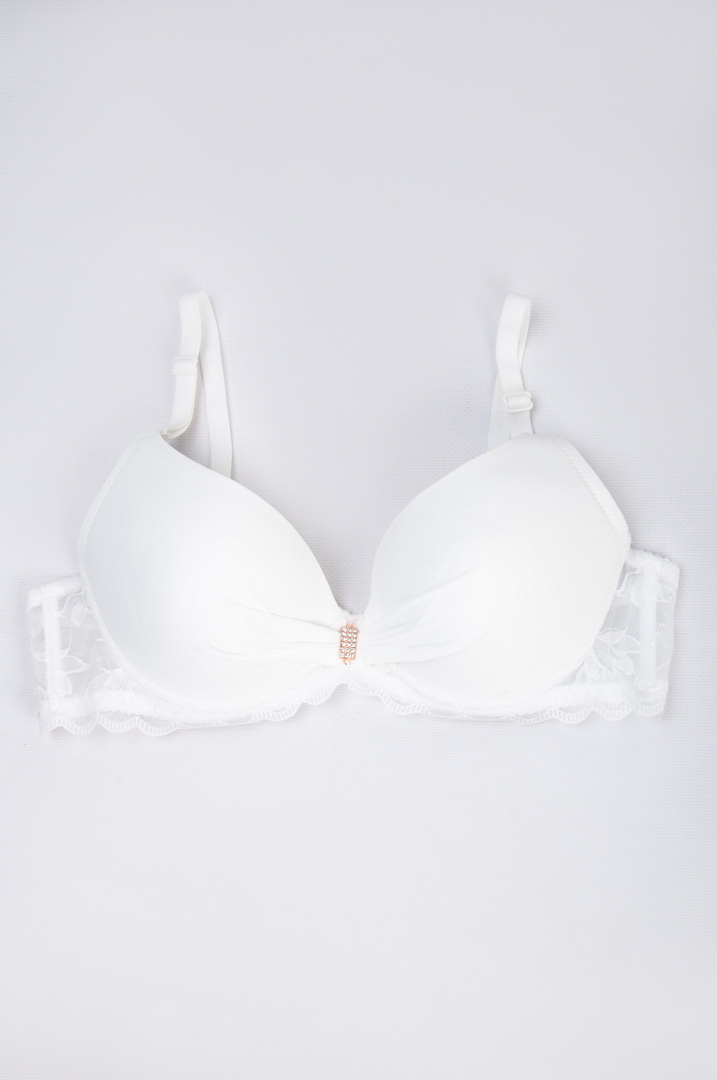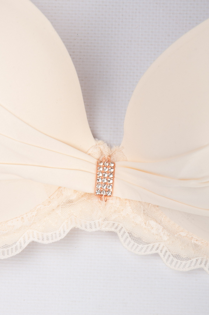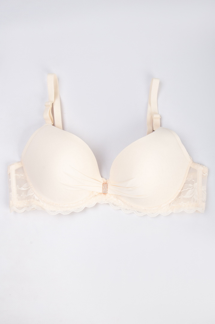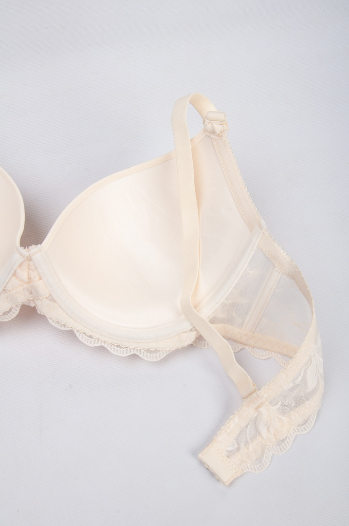 Бюстгальтер на кісточці із формованими чашками із тонкого поролону. Чашка прикрашена легкою збіркою по центру та доповнена витонченим декоративним елементом. Пояс виконаний з мереживного матеріалу з контурними краями, що надає моделі жіночності та легкості. Бретели знімні, з регулюванням по довжині, на спинці - класична застібка 2 гачки/4 рівня подовження.
