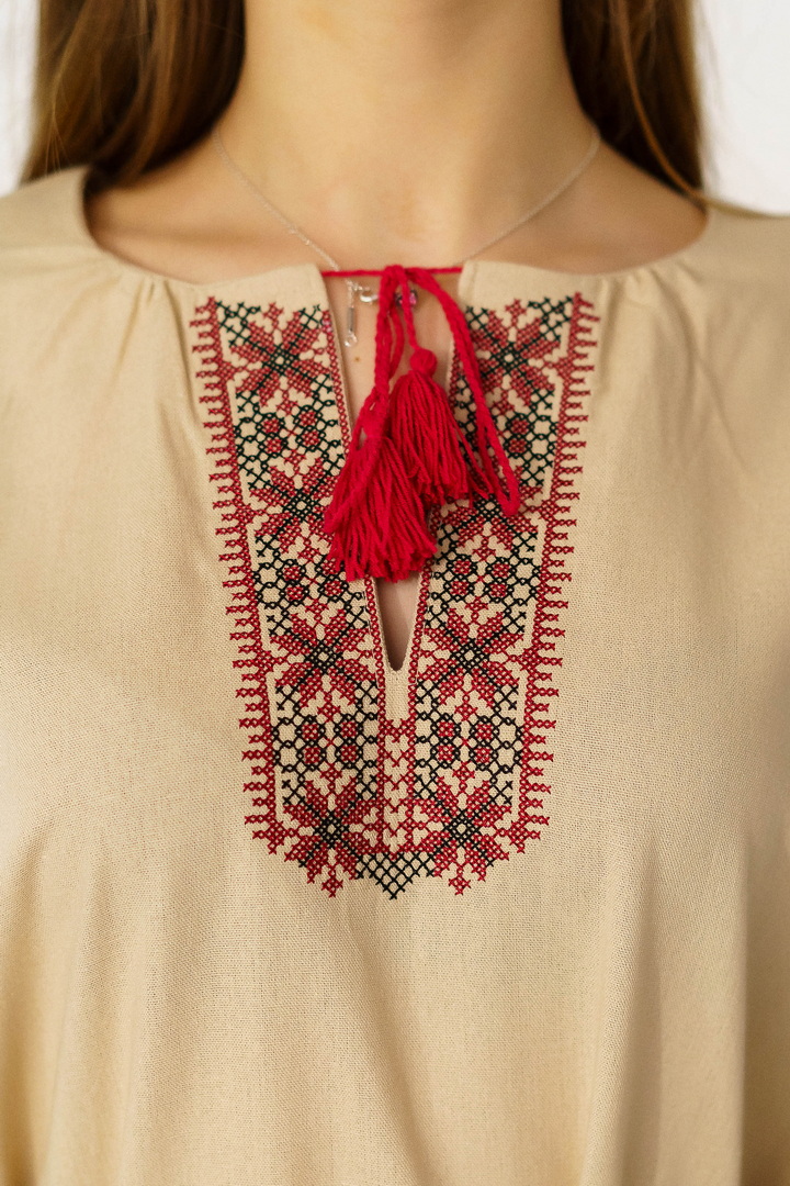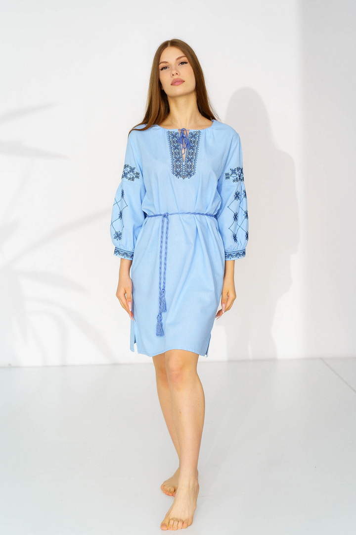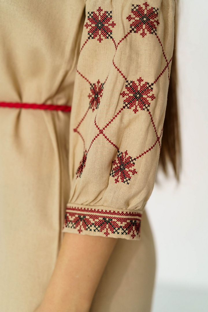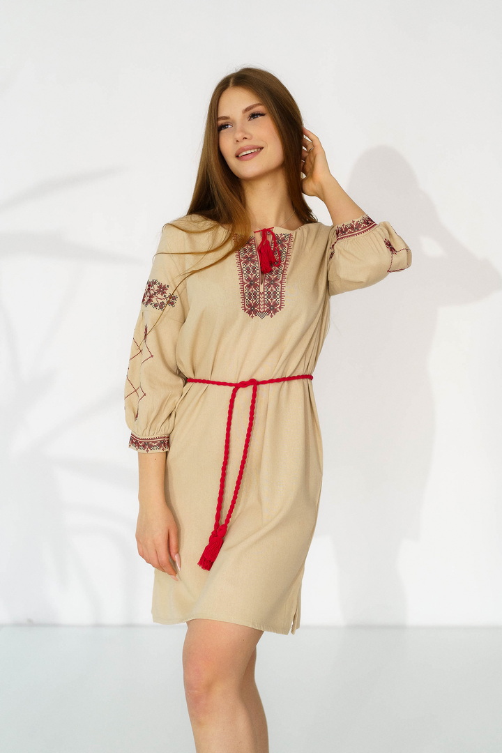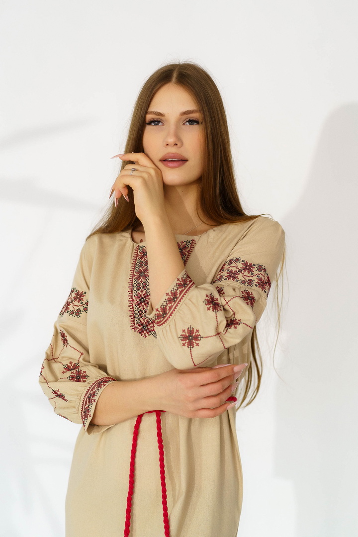 Жіноча вишиванка з натурального льону — це витончене поєднання українських традицій, жіночності та сучасної естетики. Модель виготовлена з високоякісного натурального льону, який відзначається екологічністю, міцністю та чудовою повітропроникністю. Тканина приємна до тіла, добре тримає форму й ідеально підходить для теплої пори року. Вишивка виконана у традиційних геометрично-рослинних мотивах, що розміщенні на грудях та рукавах, яка створює гармонійний і виразний образ. Контрастний орнамент підкреслює автентичність виробу, додаючи йому особливого шарму та глибокого символічного змісту. Горловина оформлена акуратним вирізом із декоративними зав’язками та китицями, які надають образу легкості та завершеності. Сукня має прямий, злегка вільний крій, що забезпечує комфортну посадку. Пояс із китицями дозволяє підкреслити талію й змінювати силует залежно від образу. Рукави довжиною ¾ з вишитими елементами та м’якими манжетами додають жіночності та елегантності. Ця лляна сукня-вишиванка чудово підходить для святкових подій, сімейних урочистостей, фотосесій, а також для стильного повсякденного образу.
