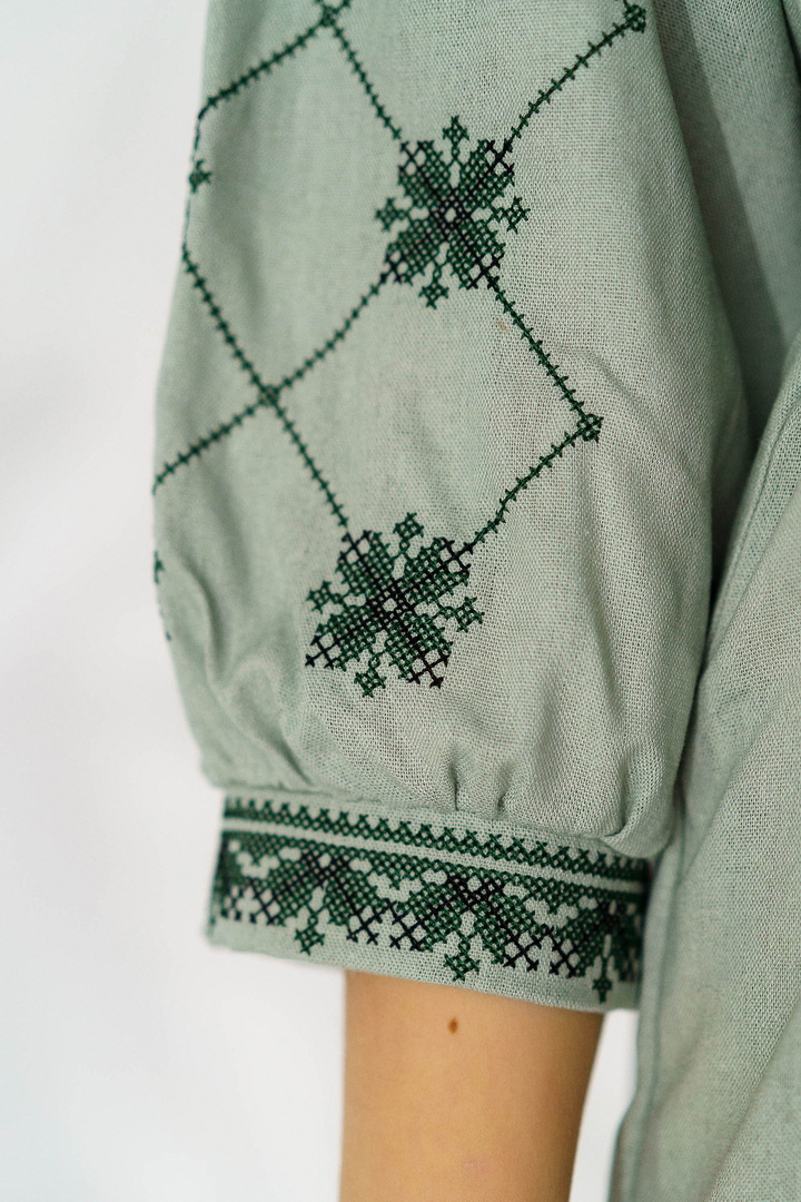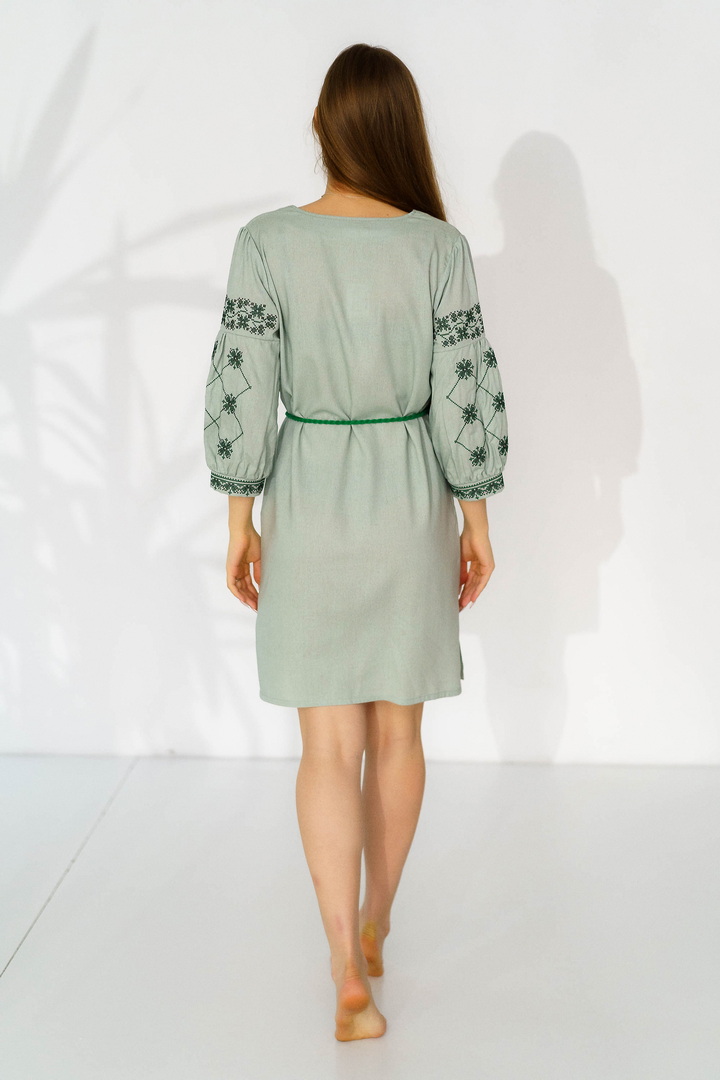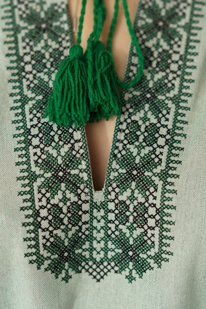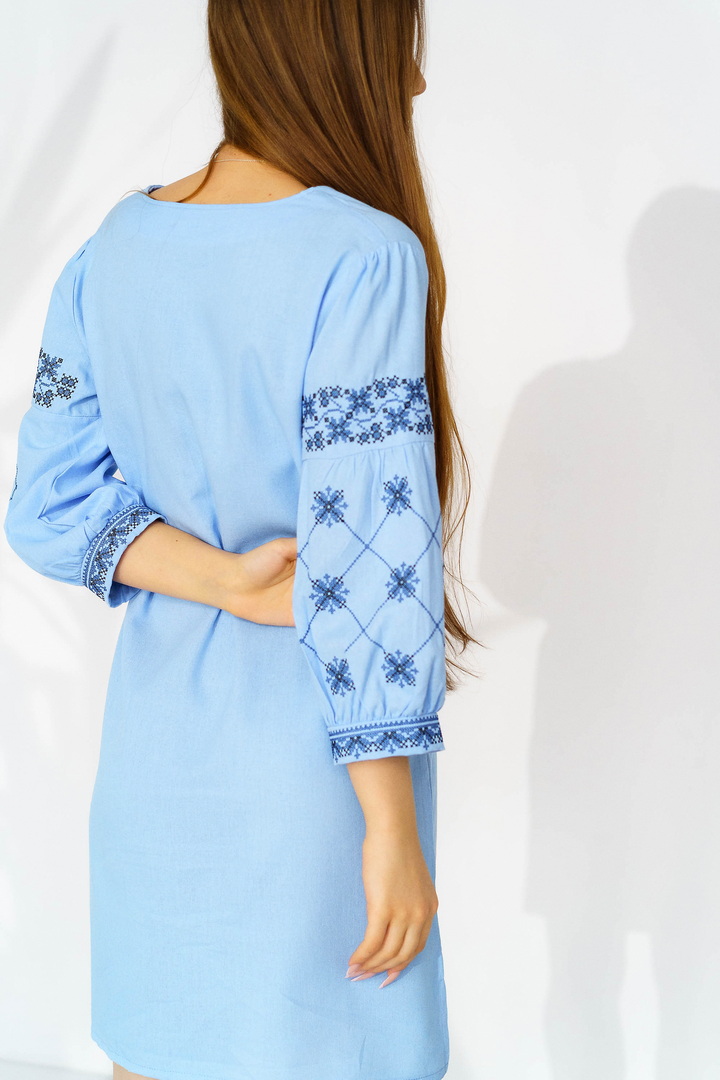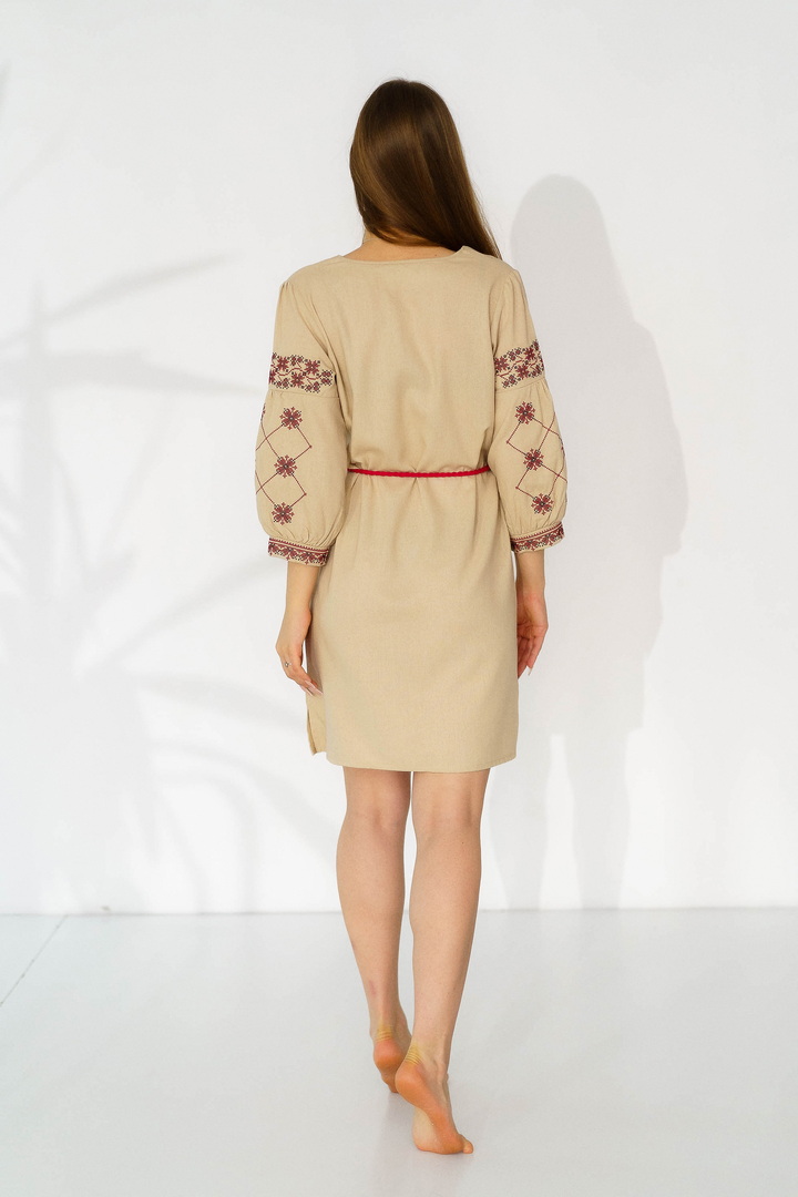 Жіноча вишиванка з натурального льону — це витончене поєднання українських традицій, жіночності та сучасної естетики. Модель виготовлена з високоякісного натурального льону, який відзначається екологічністю, міцністю та чудовою повітропроникністю. Тканина приємна до тіла, добре тримає форму й ідеально підходить для теплої пори року. Вишивка виконана у традиційних геометрично-рослинних мотивах, що розміщенні на грудях та рукавах, яка створює гармонійний і виразний образ. Контрастний орнамент підкреслює автентичність виробу, додаючи йому особливого шарму та глибокого символічного змісту. Горловина оформлена акуратним вирізом із декоративними зав’язками та китицями, які надають образу легкості та завершеності. Сукня має прямий, злегка вільний крій, що забезпечує комфортну посадку. Пояс із китицями дозволяє підкреслити талію й змінювати силует залежно від образу. Рукави довжиною ¾ з вишитими елементами та м’якими манжетами додають жіночності та елегантності. Ця лляна сукня-вишиванка чудово підходить для святкових подій, сімейних урочистостей, фотосесій, а також для стильного повсякденного образу.