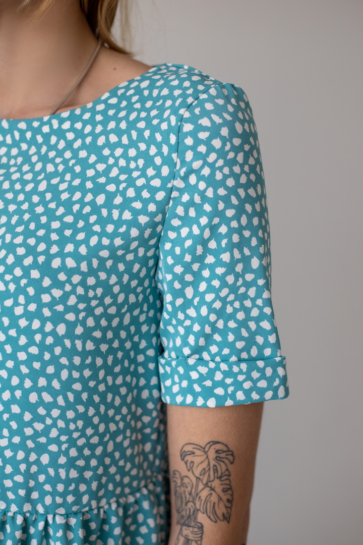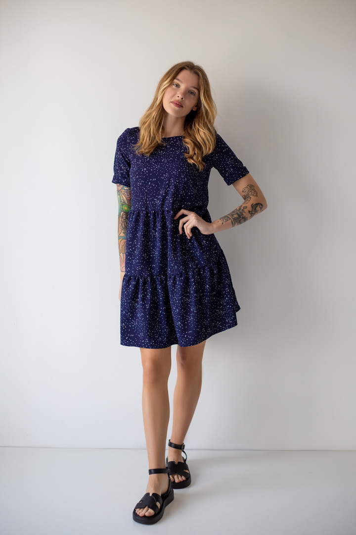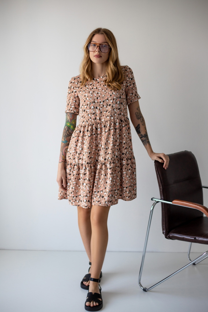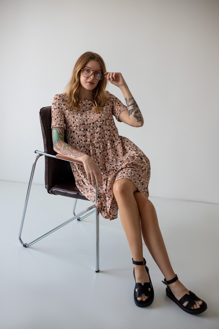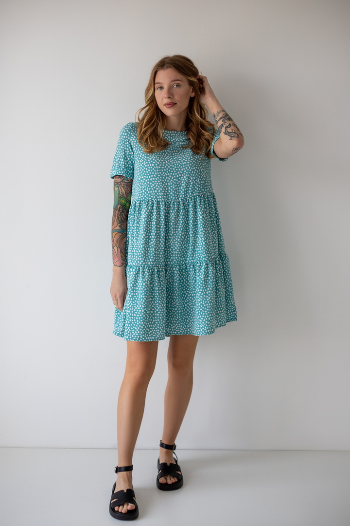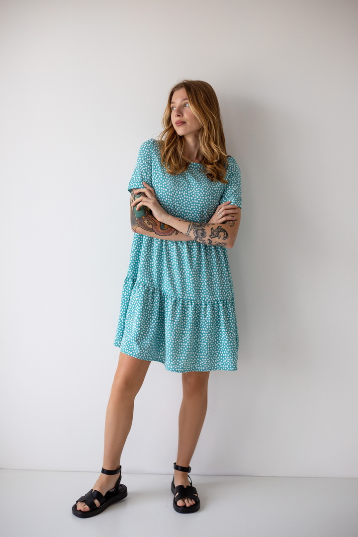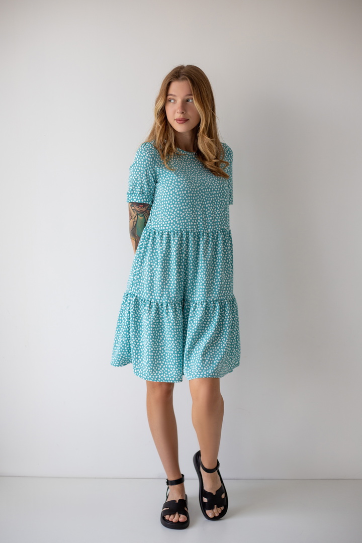 Легке жіноче плаття з літнього софта. Модель вільного крою, довжиною до коліна, з округлим вирізом, короткими рукавами, пишною грайливою оборкою по низу виробу. Тканина нееластична, не зминається, дуже легка - відмінний варіант для літа. Образ рекомендується доповнити босоніжками і жіночним головним убором.