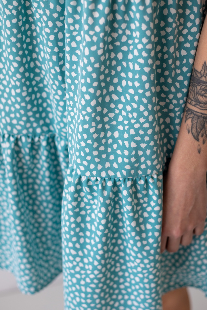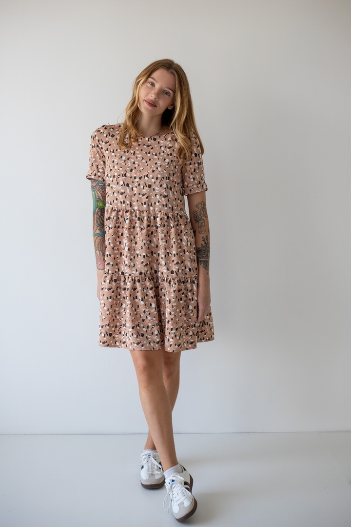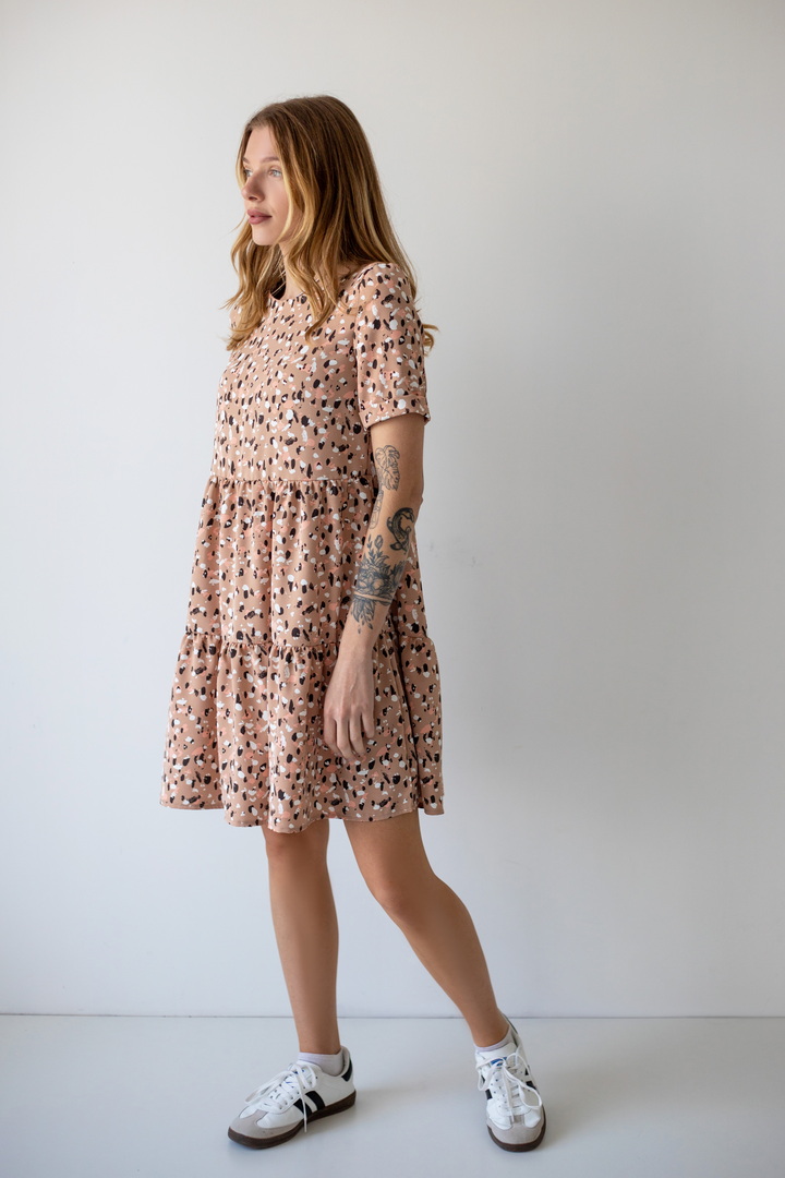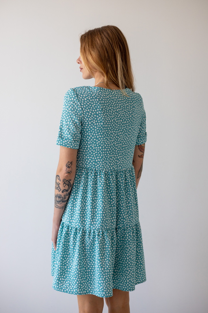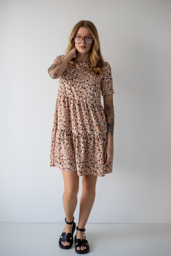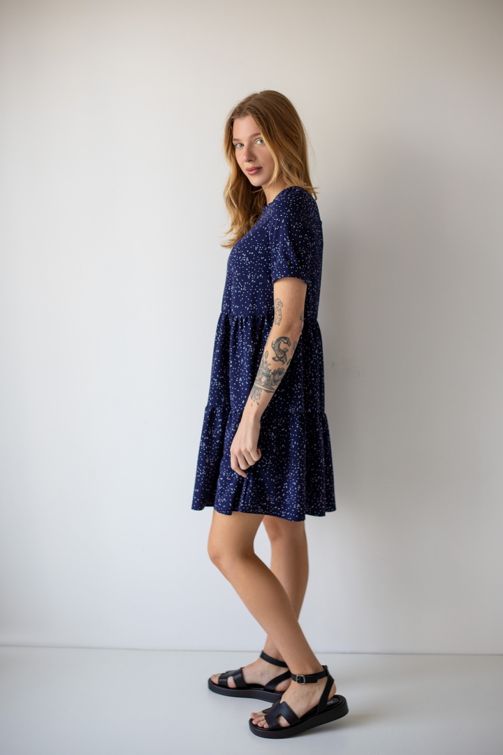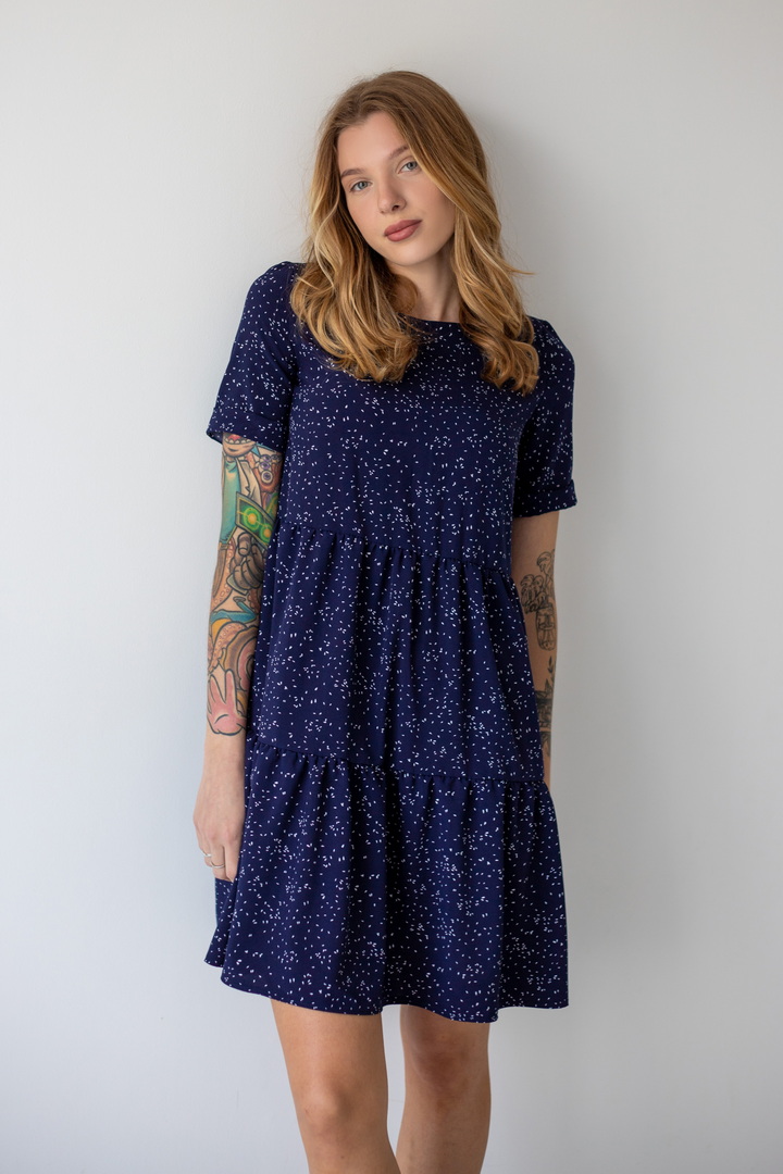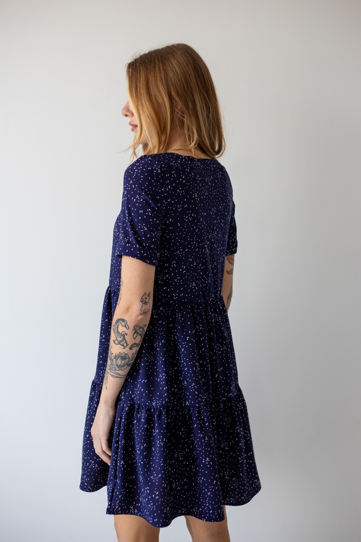 Легке жіноче плаття з літнього софта. Модель вільного крою, довжиною до коліна, з округлим вирізом, короткими рукавами, пишною грайливою оборкою по низу виробу. Тканина нееластична, не зминається, дуже легка - відмінний варіант для літа. Образ рекомендується доповнити босоніжками і жіночним головним убором.