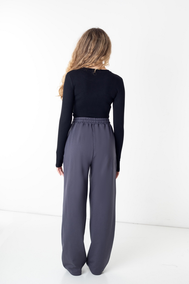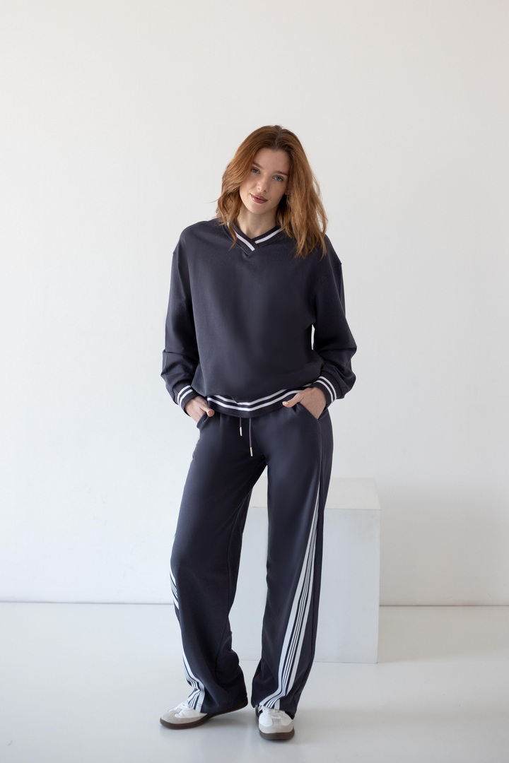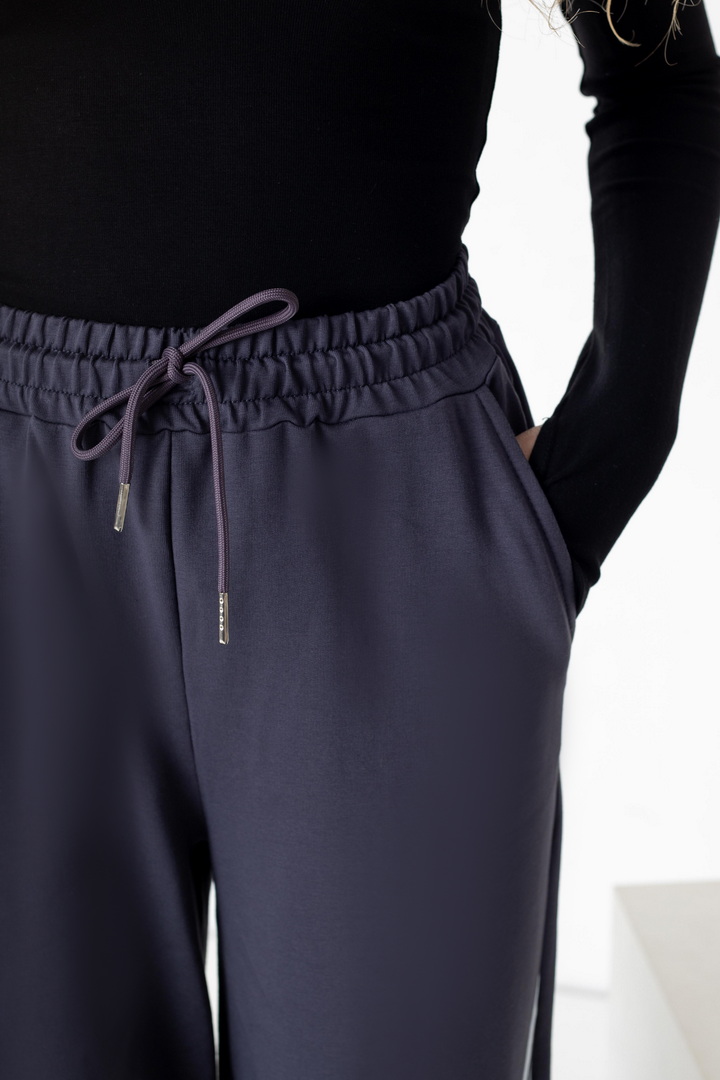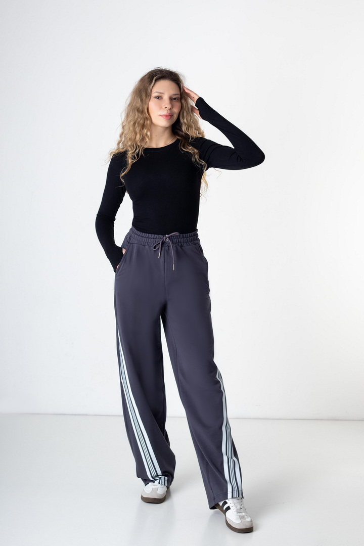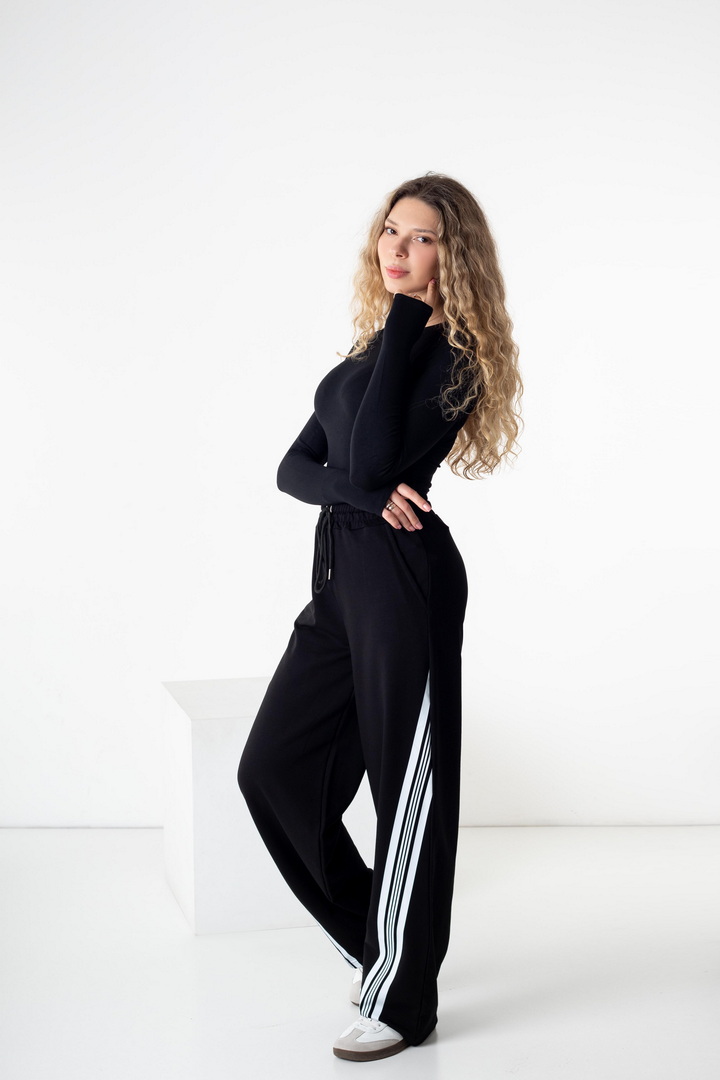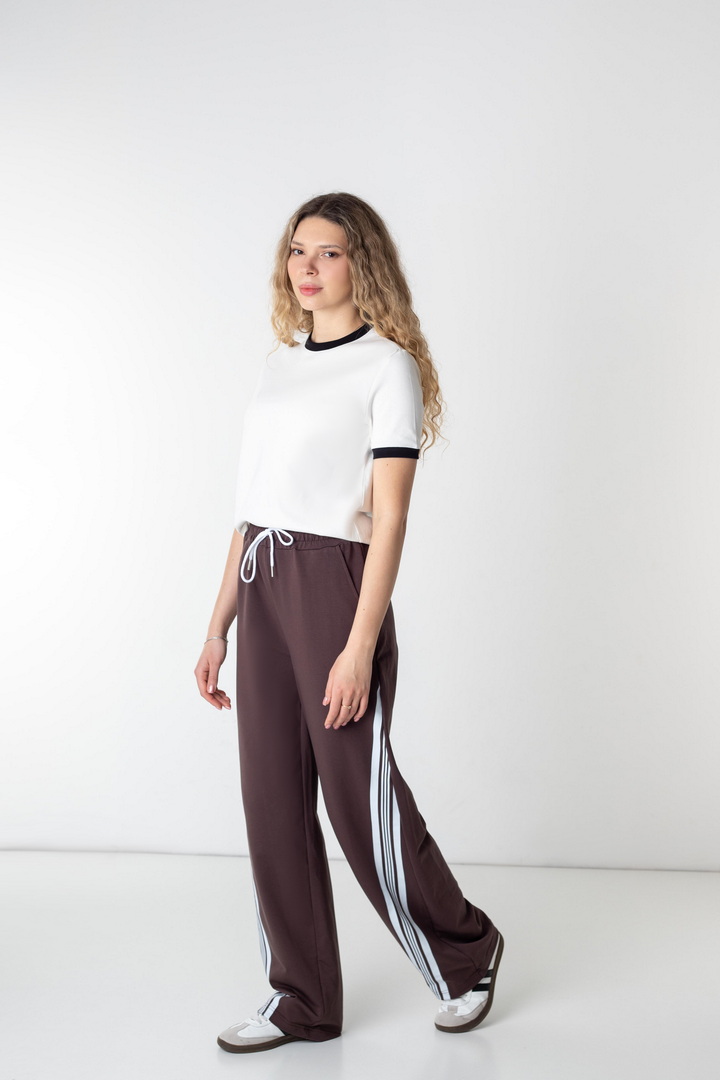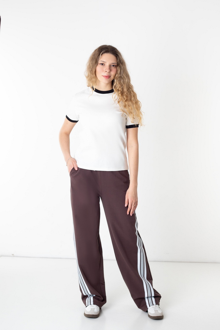 Ці жіночі штани з двониткового футера — ідеальне поєднання комфорту, сучасного стилю та продуманого дизайну. Вони створені для тих, хто цінує свободу, але не готовий відмовлятися від трендового вигляду. Модель має вільний прямий крій, який красиво витягує силует і додає образу легкості. Особливий акцент — контрастні лампаси з боків, що візуально подовжують ноги та надають штанам динамічного, спортивного характеру. Штани виглядають стримано та водночас стильно, легко поєднуючись як із базовими речами, так і з більш яскравими елементами гардеробу. Двонитковий футер — це ідеальний вибір для демісезону: тканина м’яка, приємна до тіла, добре тримає форму. Еластичний пояс із шнурком забезпечує ідеальну посадку, а зручні кишені додають практичності у щоденному використанні. Ці штани легко адаптуються під твій ритм життя: прогулянки містом, активний день, подорожі або стильні casual-образи — вони завжди «в тему».